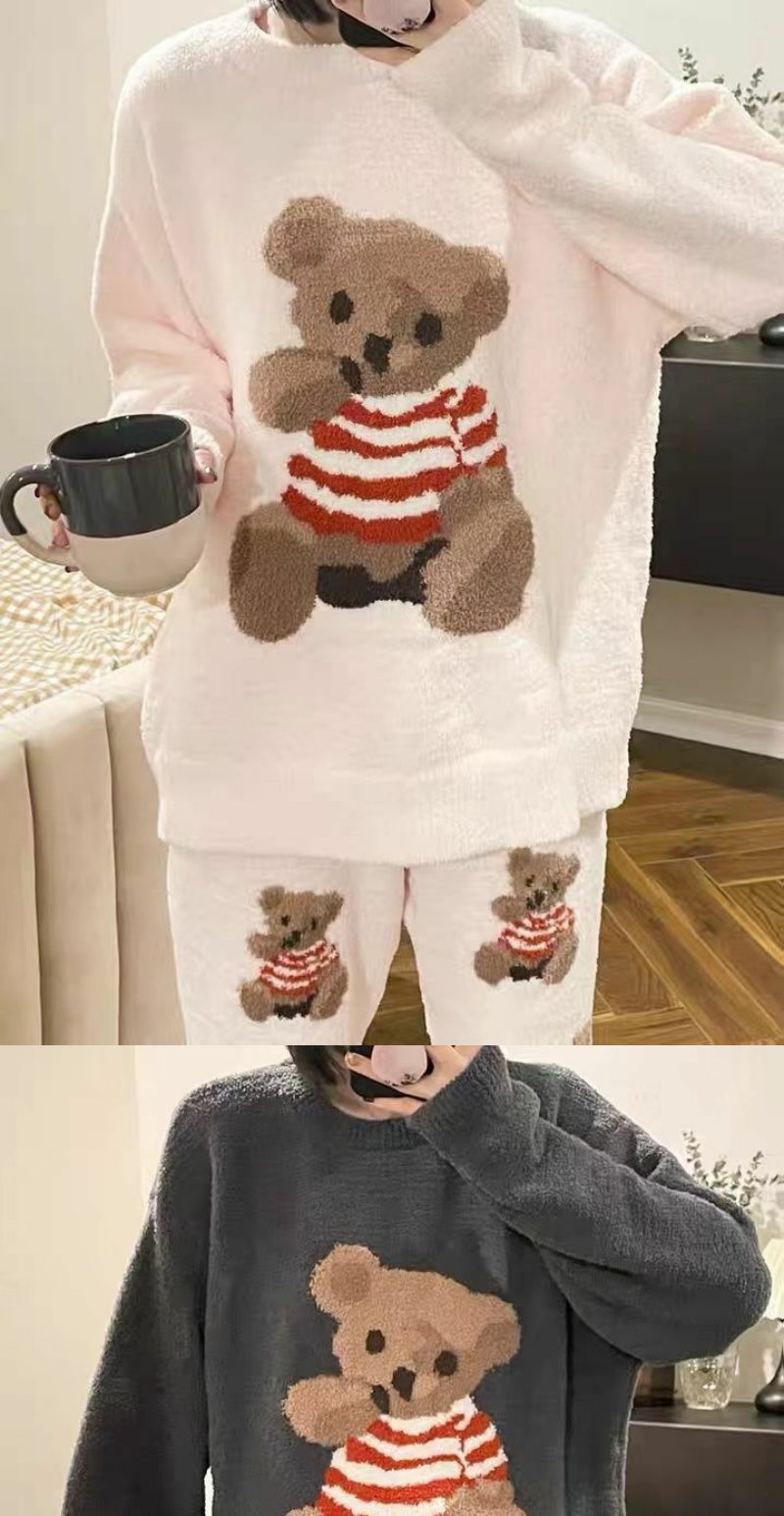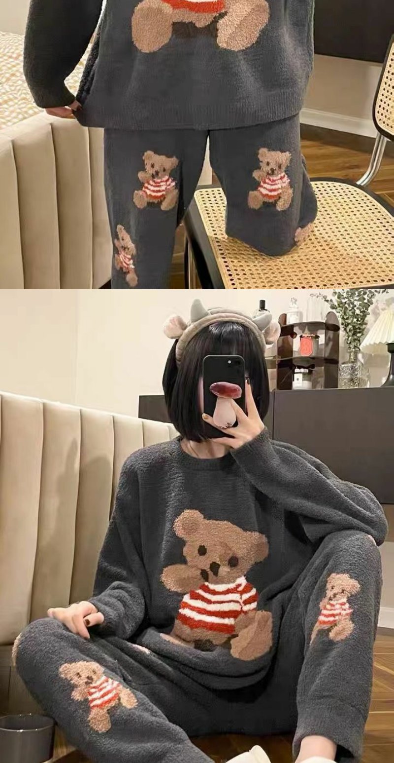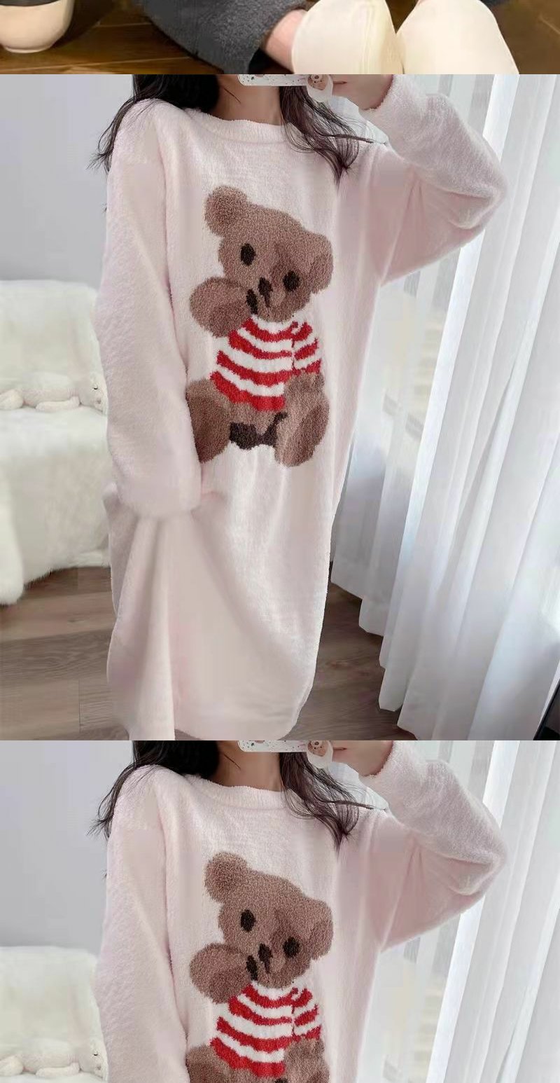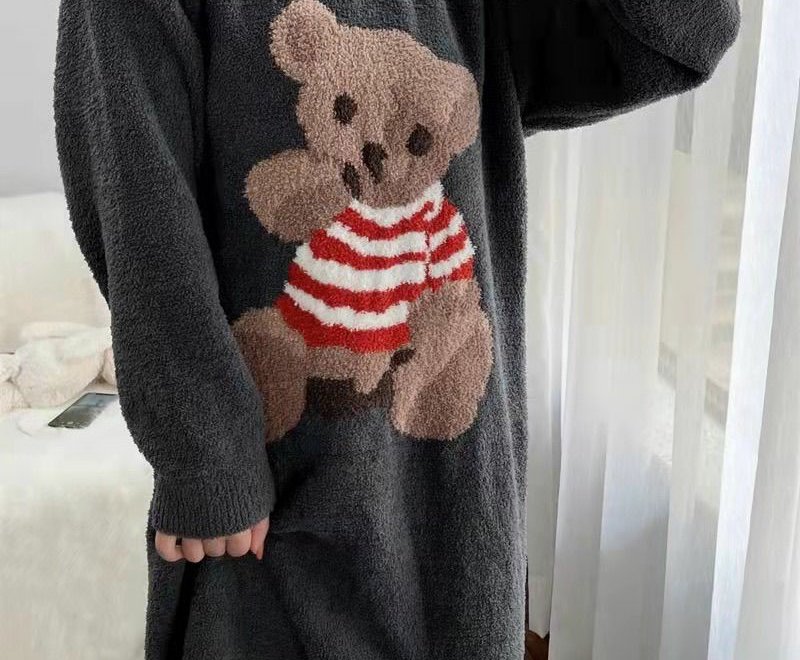 睡衣女秋冬季长款珊瑚绒加绒加厚小熊宽松睡裙学生宿舍家居服套装