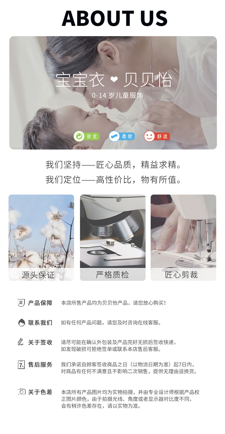 - 贝贝怡专注0-6岁婴幼儿服饰,坚持安全、柔软、舒适的产品理念,为千万中国家庭提供超高品质、安全可靠的婴幼儿服饰产品,妈妈放心,宝宝开心!