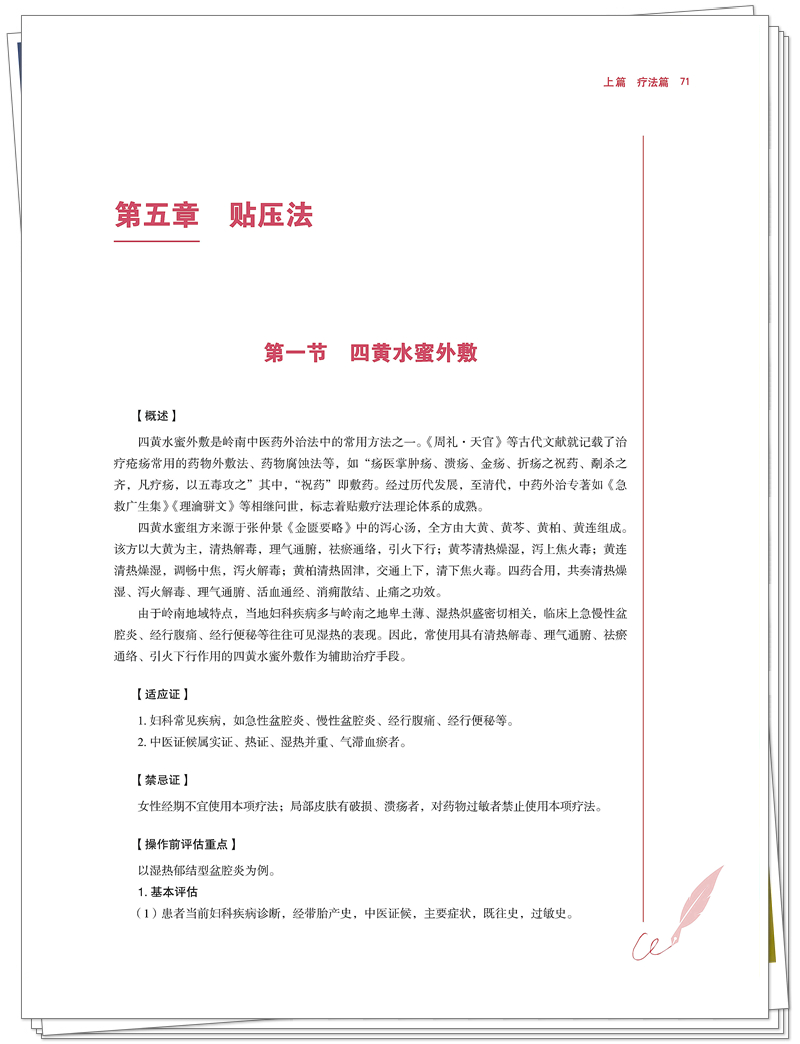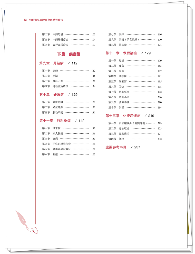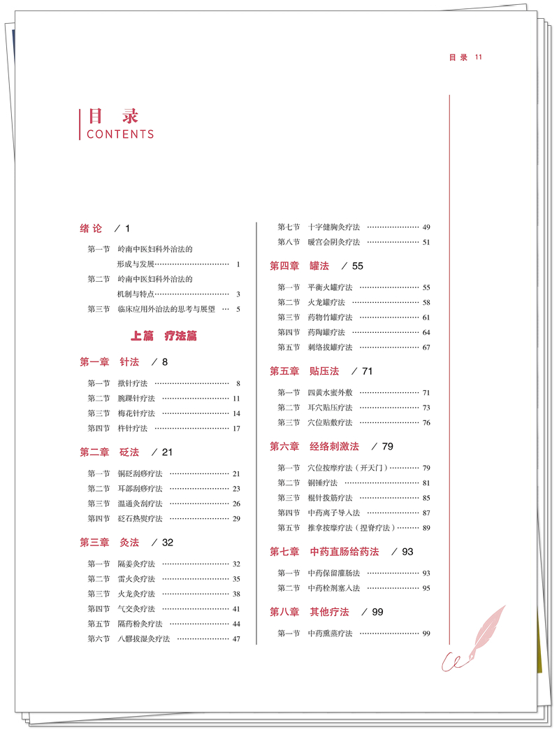 上篇含有 6 章 30 节,将妇科常用中医特色疗法从针法、砭法、灸法、罐