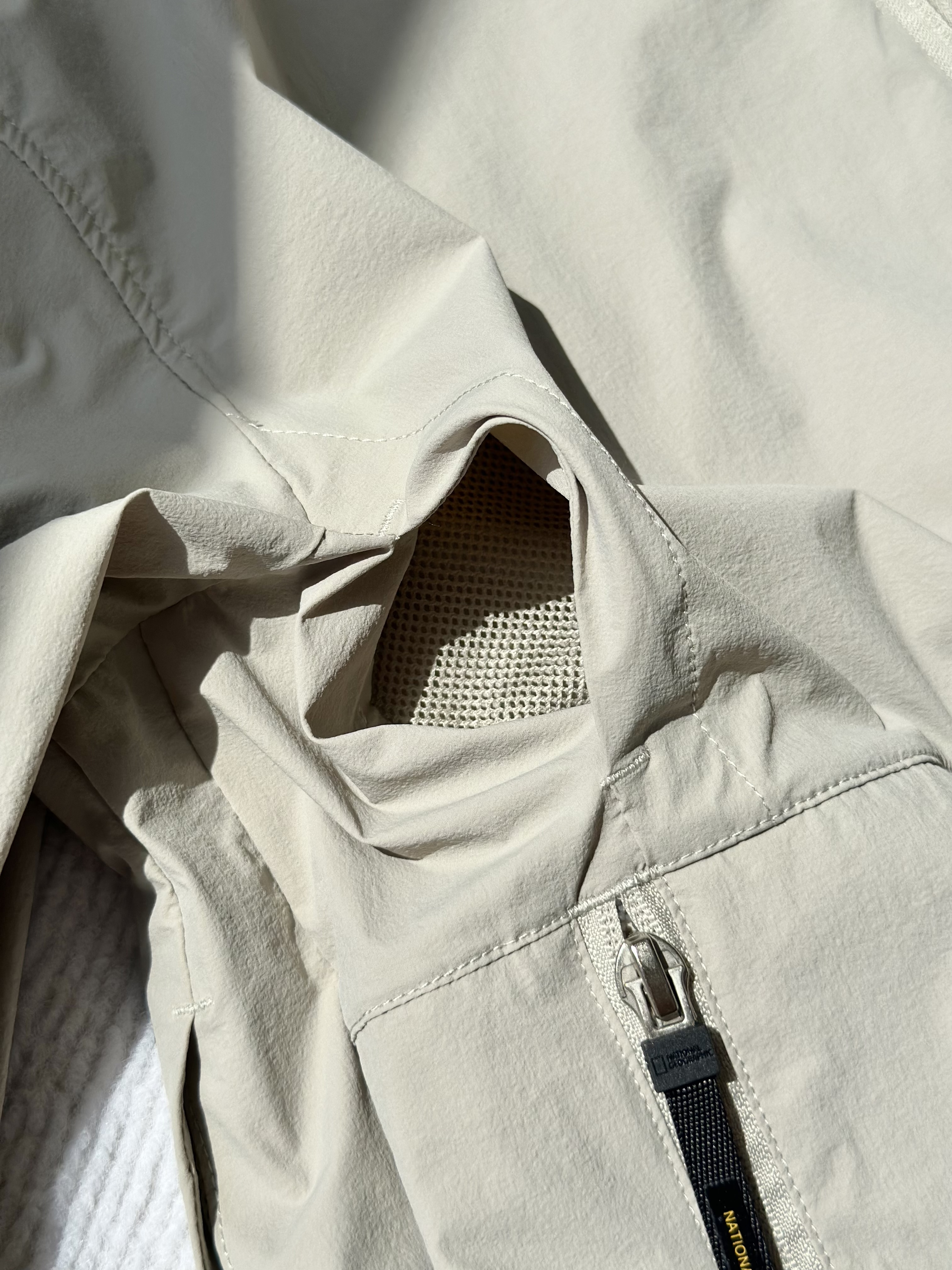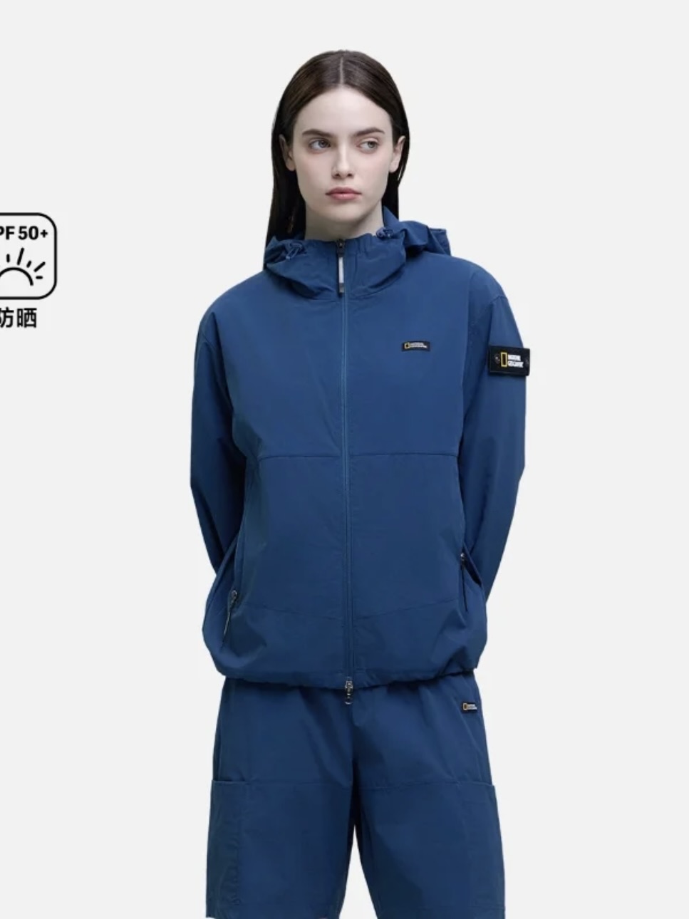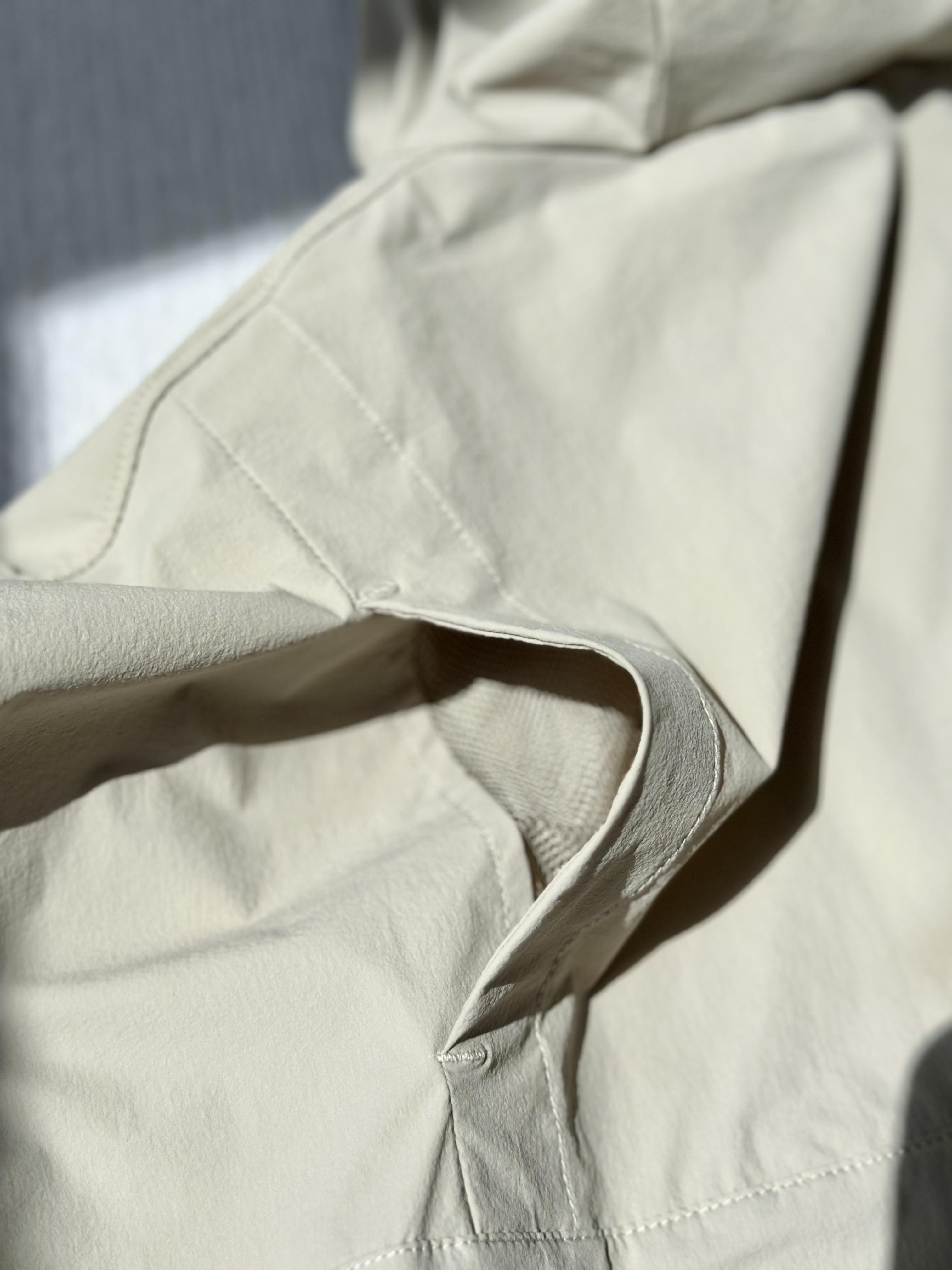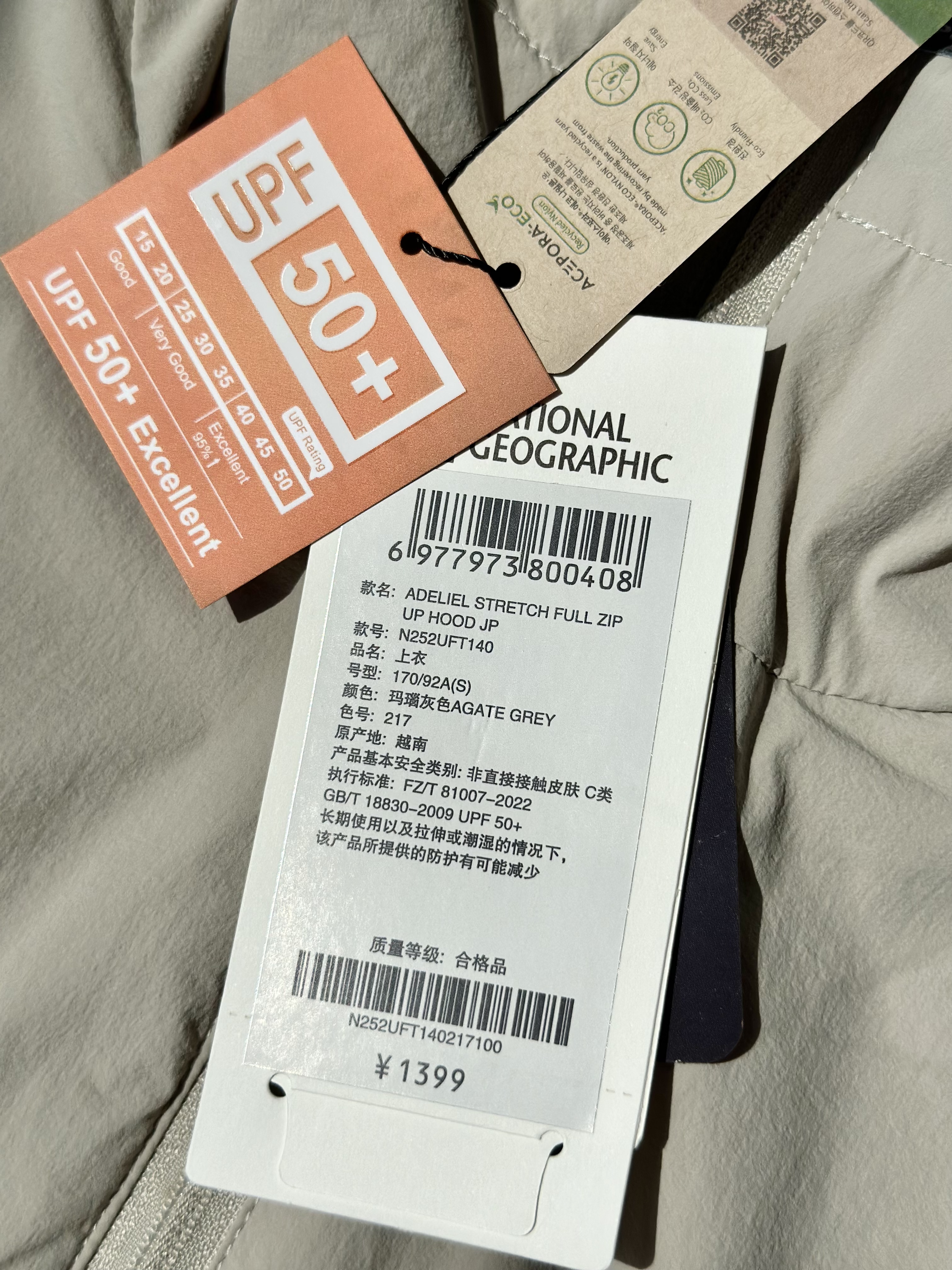 面料采用了可持续再生尼龙面料,同时还有upf50+的防晒左右 紫外线长波透过率小于5%,腋下后背前胸处都有透气设计;