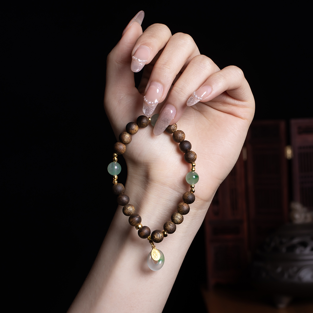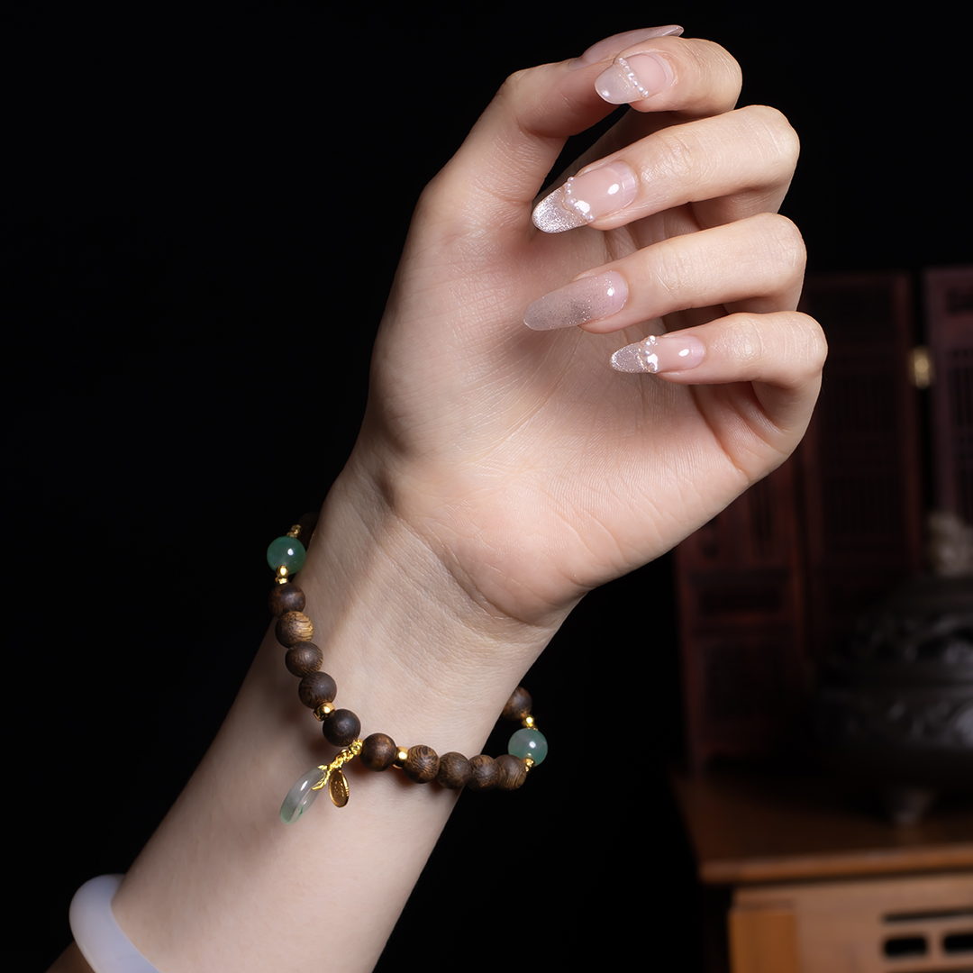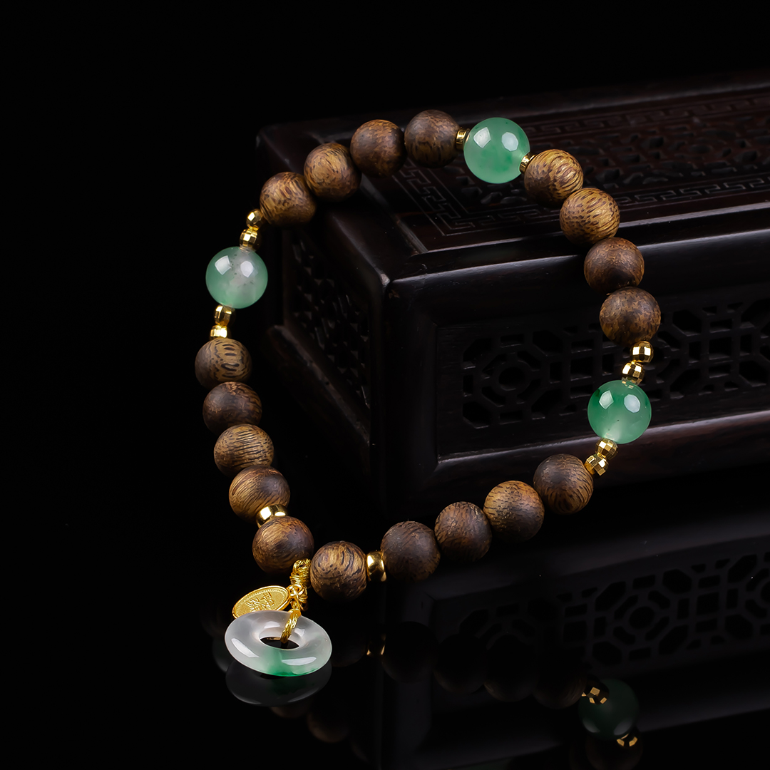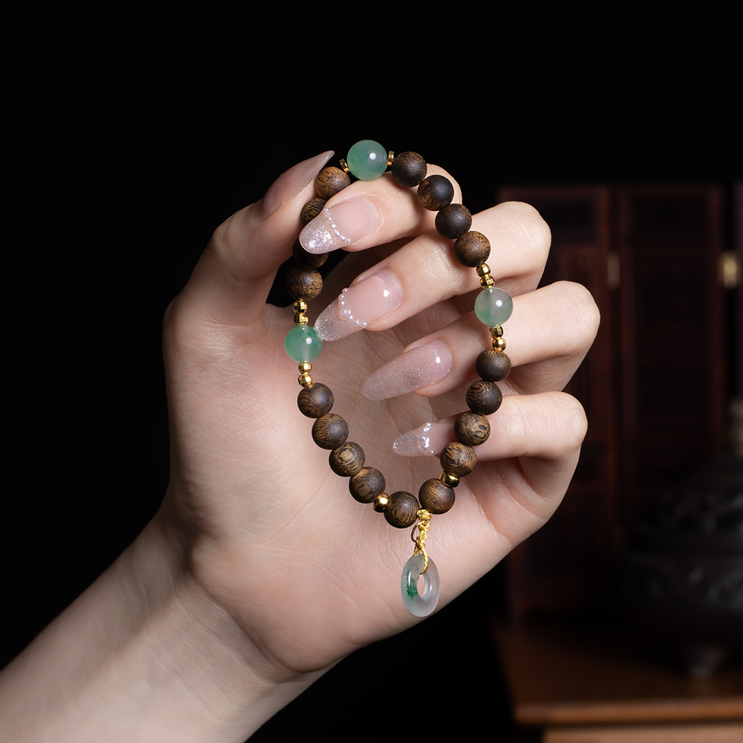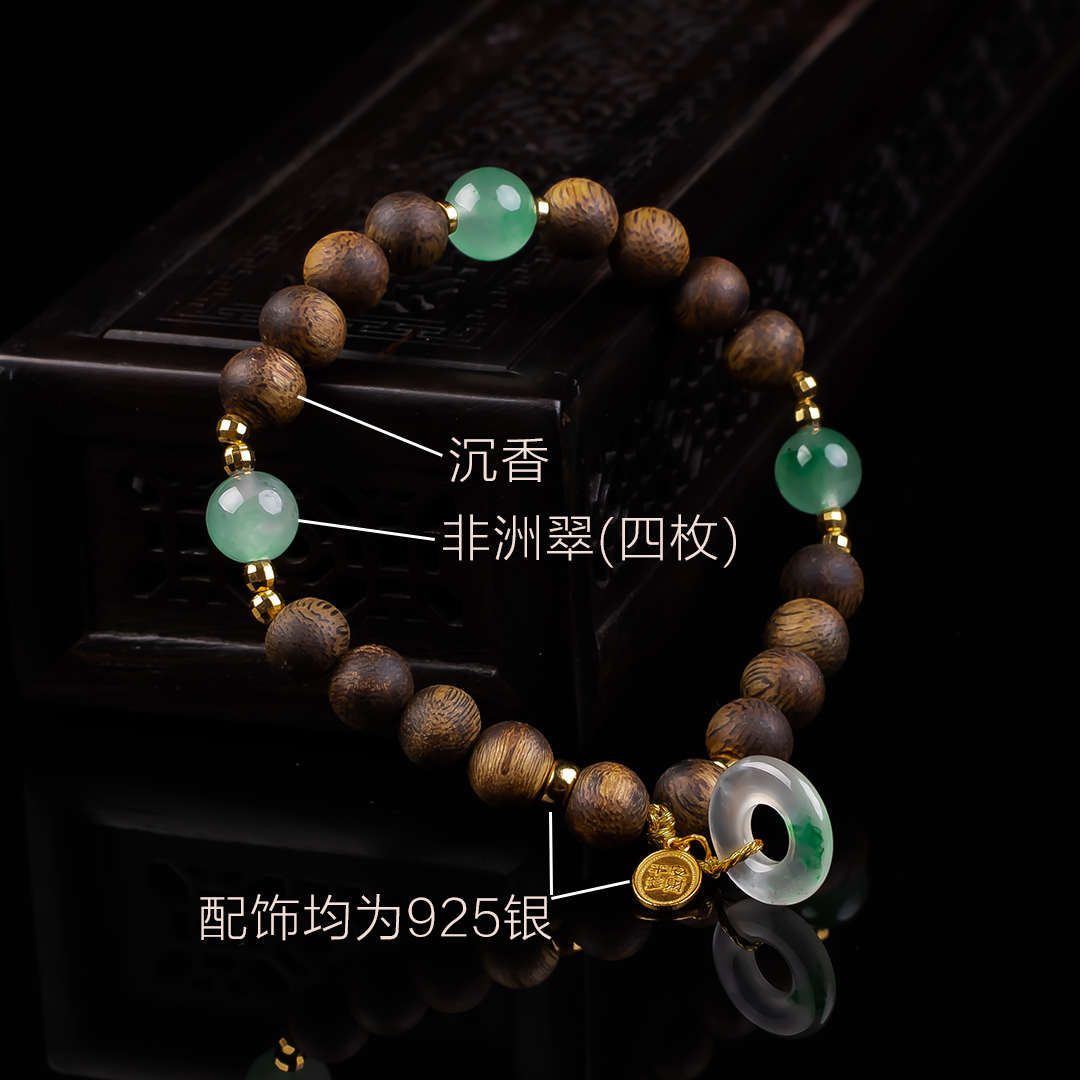 xy0338沉香+非洲翠平安扣手串,天然沉香约7.3mm,原色原味,香味自然清甜,冰飘花的非洲翠,色泽亮眼,一枚平安多财小提溜,款式穿搭简约典雅,古色古香,平平安安,财富满满!