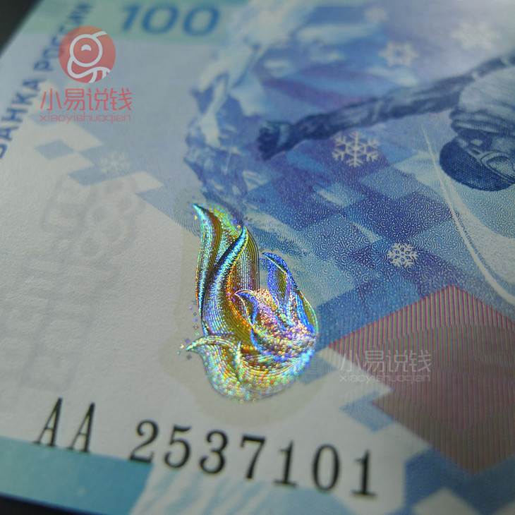 这是俄罗斯银行发行的首张奥运纪念钞,纸币图案首次设计为竖版 ,并且防伪原创力也很强。
