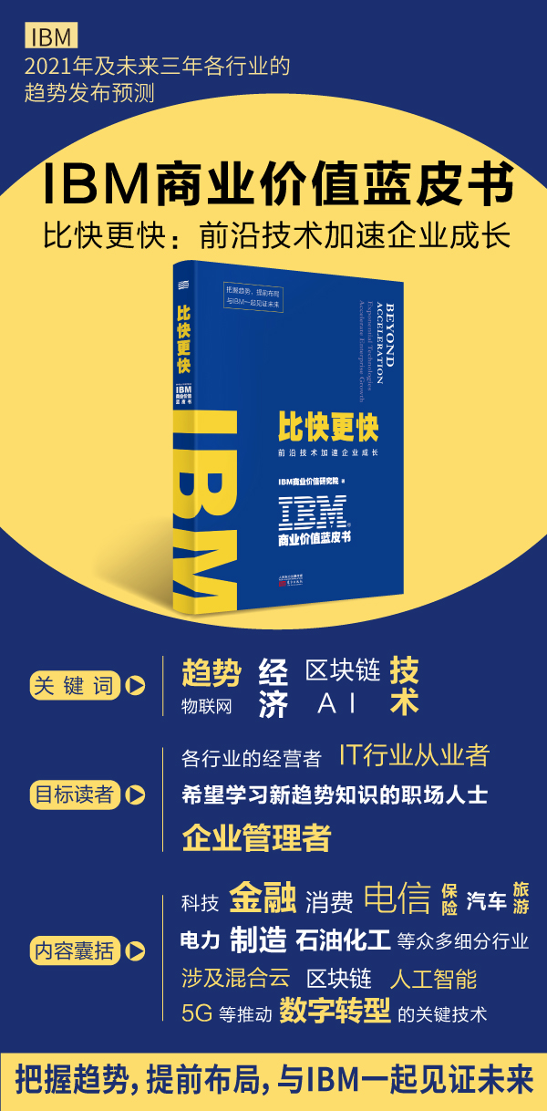 在《IBM商业价值蓝皮书:比快更快》一书中,IBM将对未来三年业内的技术、业务模式的变化等做出预测,就新趋势、新机遇和新挑战向各行业呈送独到见解:哪些行业蕴藏着巨大的商机;在帮助企业加速数字化转型的过程中,要突出利用哪些技术、运用怎样的实施战略;为什么数字化转型不只关乎技术,更重视“人”的作用;后疫情时代,业务模式将发什么变化以应对变幻莫测的市场需求……