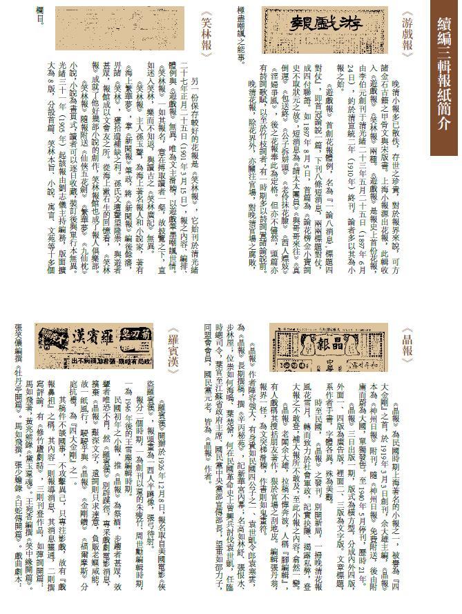 續編選取在中國近代報刊史上佔據重要地位,且保存較為完善的全部小報(首次收錄小報中的『四大金剛』:《晶報》《金剛鑽》《福爾摩斯》《羅賓漢》)。