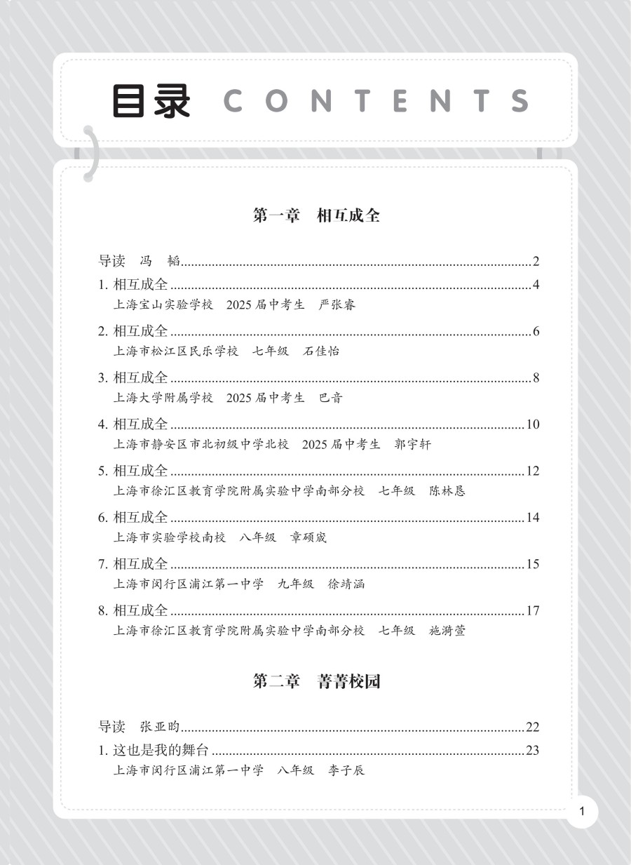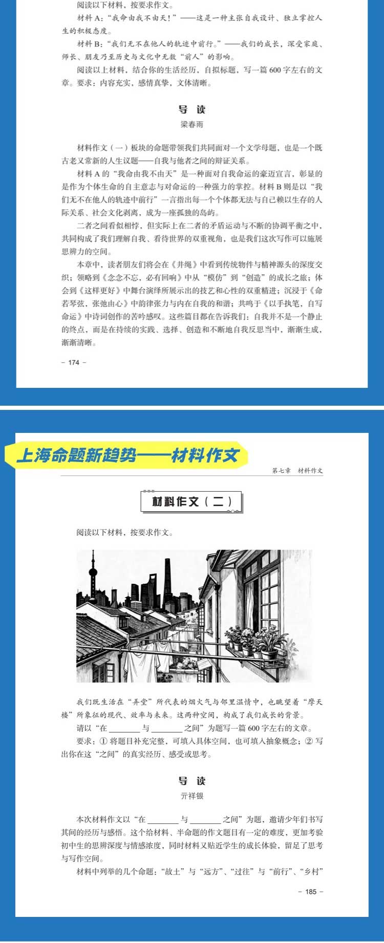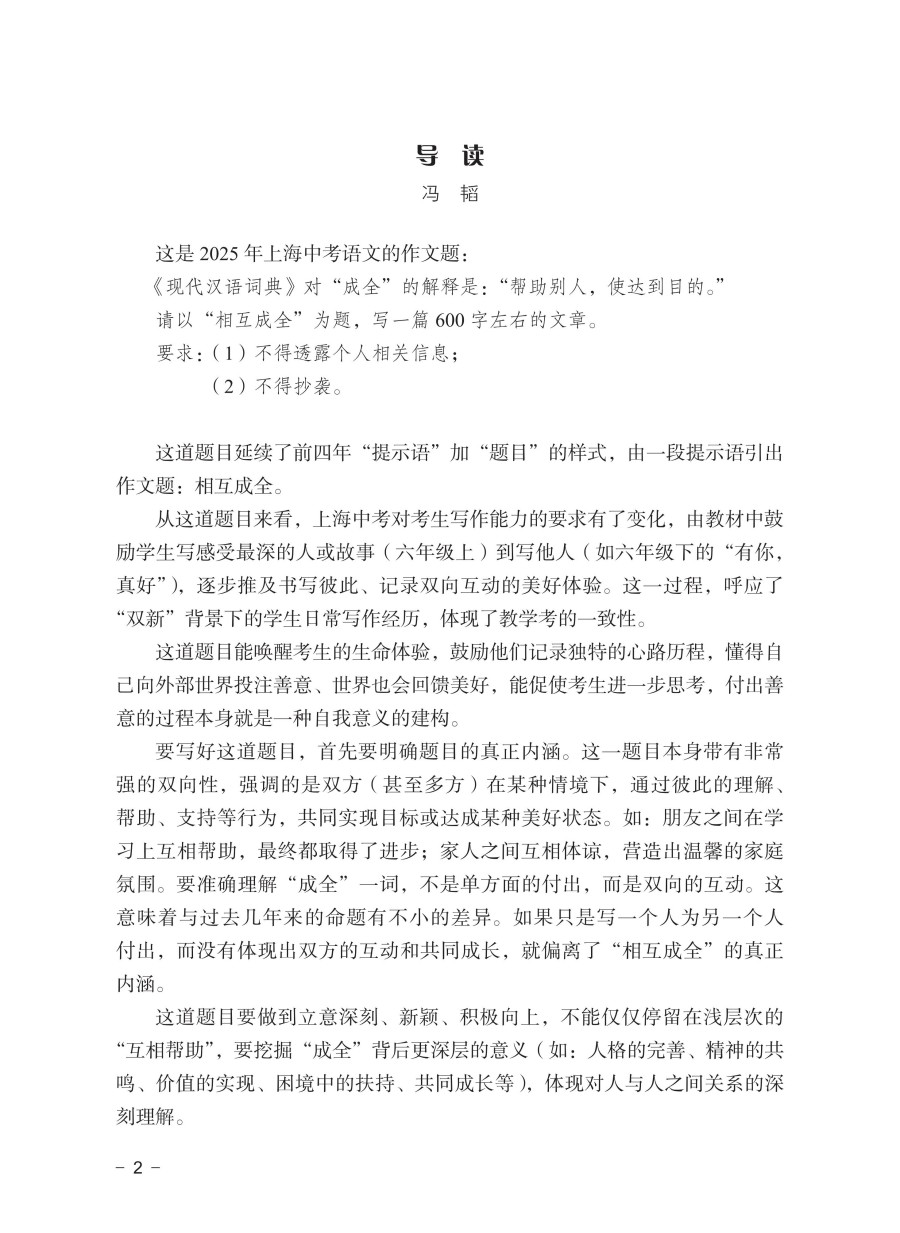 本书精选 87篇佳作,紧扣中考命题趋势与学生生活实际,分为;相互成全;菁菁校园;感悟亲情;社会见识;坚持兴趣;致敬传统及;材料作文七大板块。书中既全面覆盖初中生记叙文核心板块,又收录 2025年上海中考真题范文,还前瞻性地纳入思辨性强、情境新颖的材料作文,全面展现当代初中生的观察力、思考力与表达力。