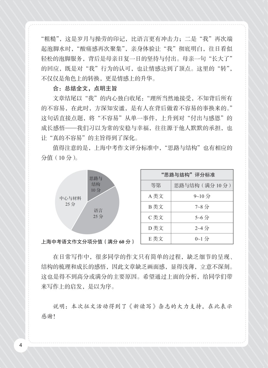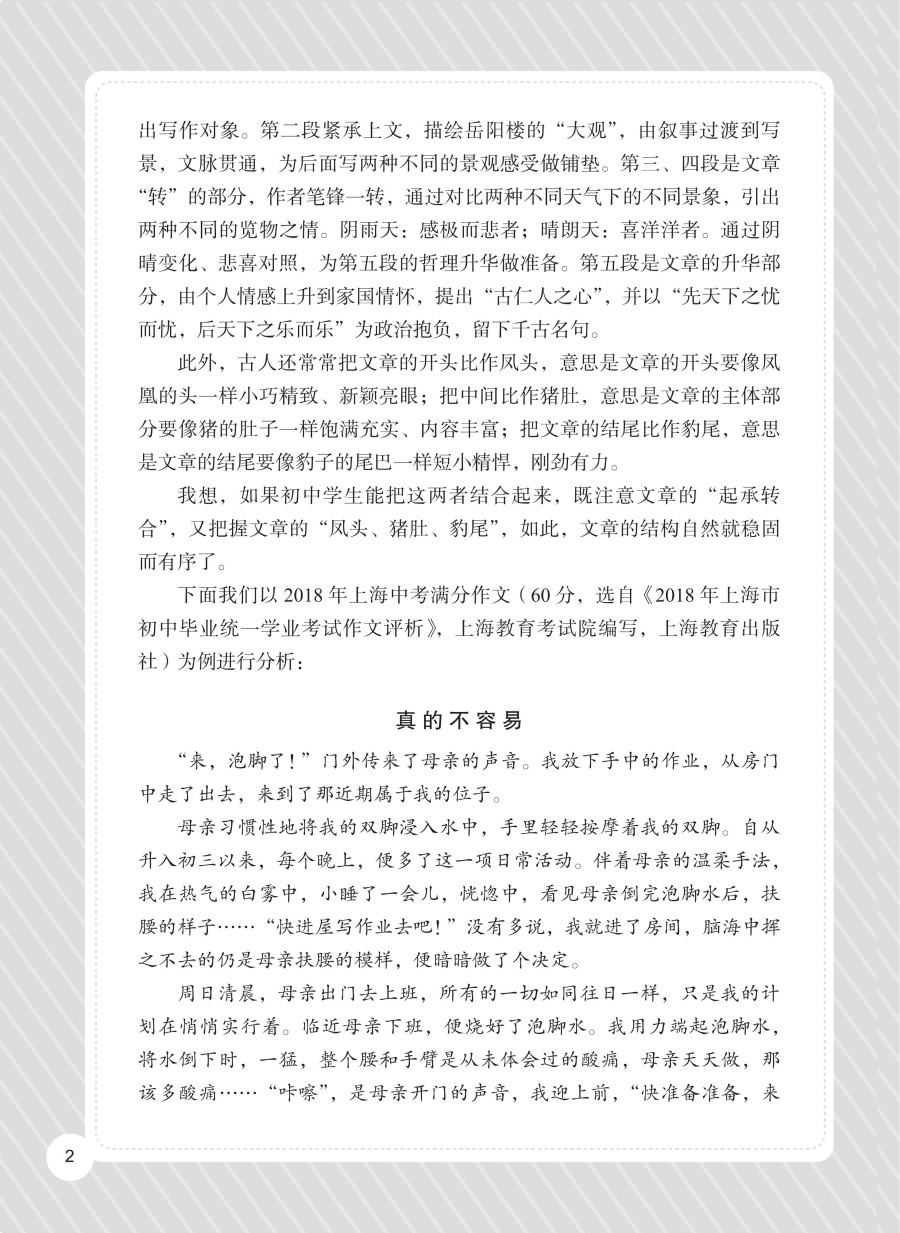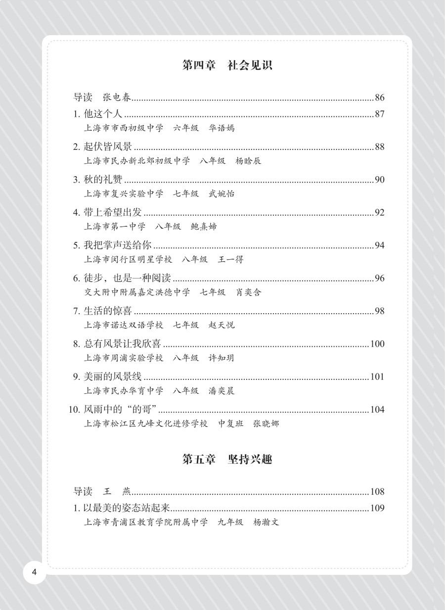 本书精选 87篇佳作,紧扣中考命题趋势与学生生活实际,分为;相互成全;菁菁校园;感悟亲情;社会见识;坚持兴趣;致敬传统及;材料作文七大板块。书中既全面覆盖初中生记叙文核心板块,又收录 2025年上海中考真题范文,还前瞻性地纳入思辨性强、情境新颖的材料作文,全面展现当代初中生的观察力、思考力与表达力。