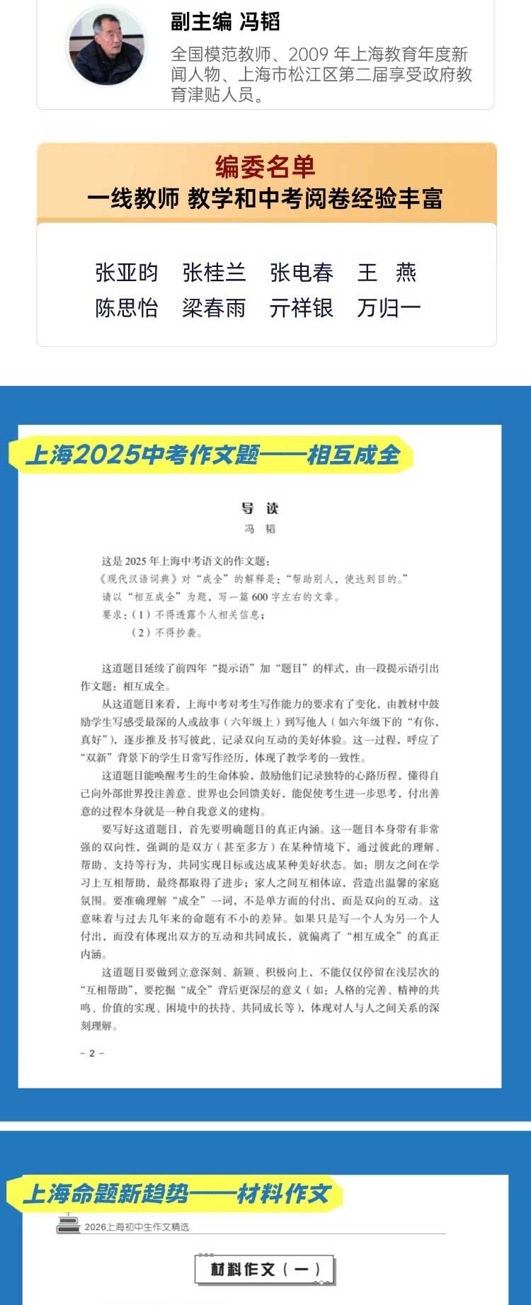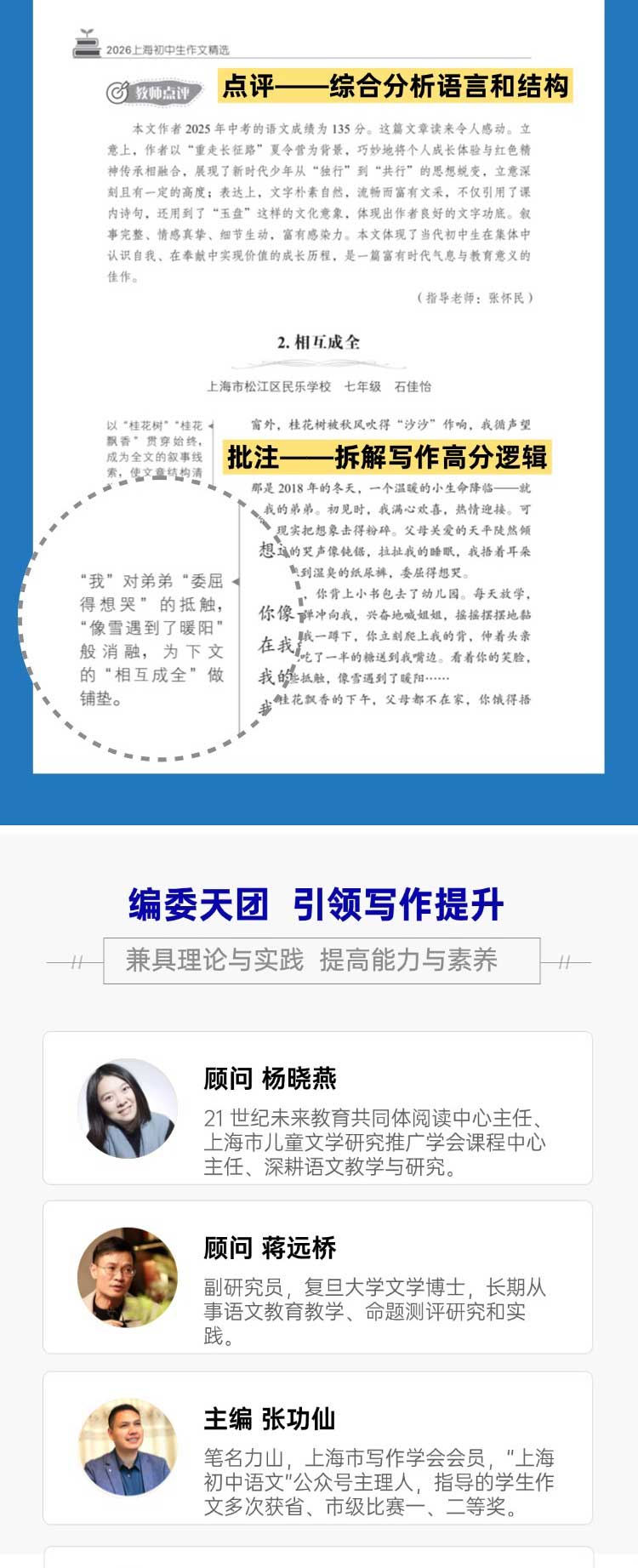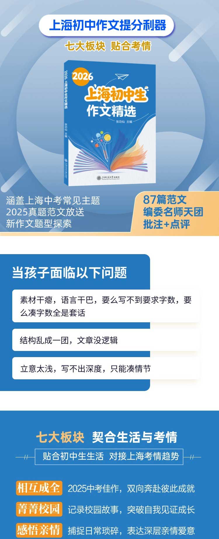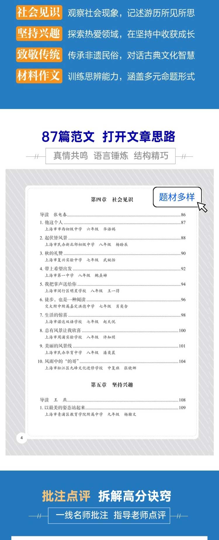 87篇上海初中生佳作,7大板块,含2025上海中考真题范文、新命题形式材料作文、初中生常用主题,一线名师批注、指导老师点评,速效提分!