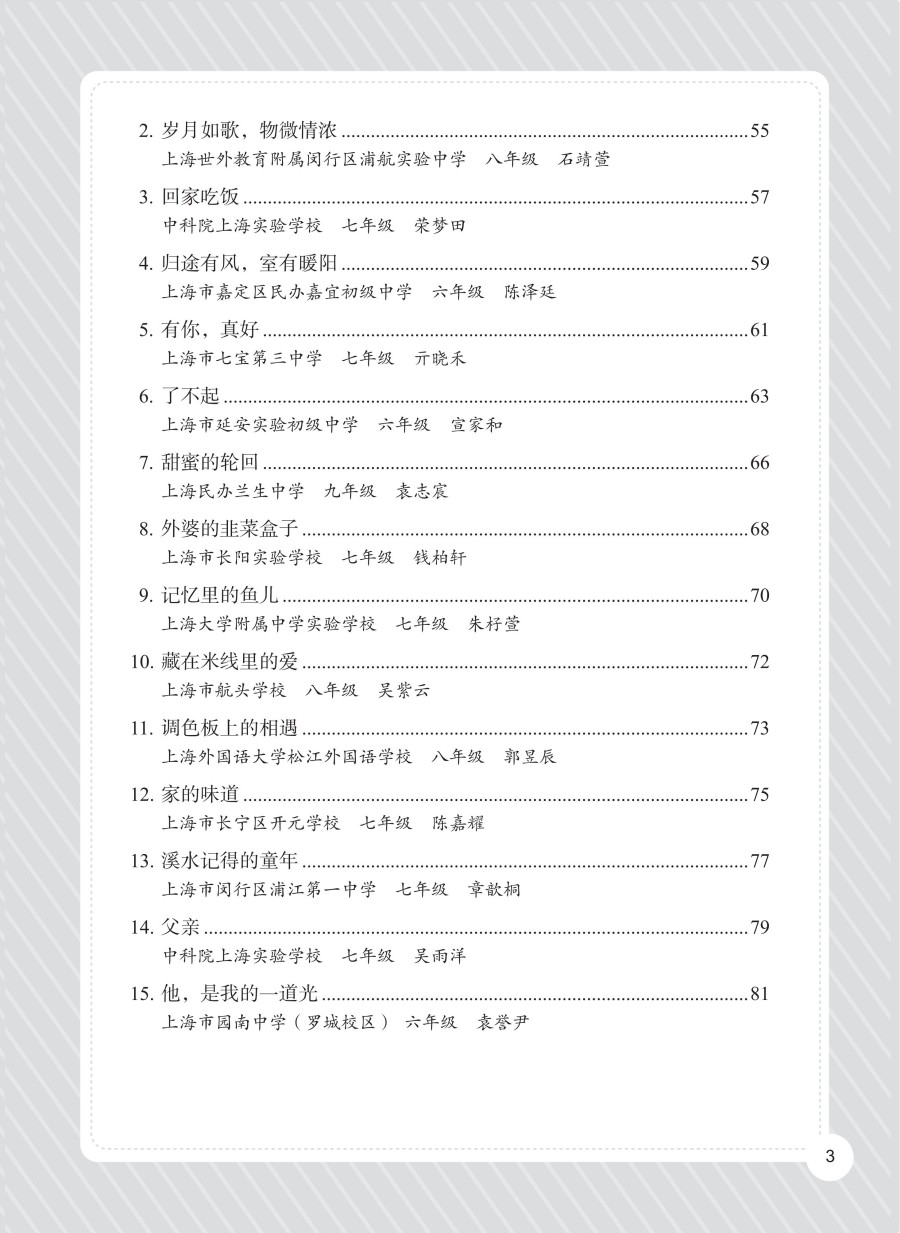 ?本书题材多样、情感真挚、结构清晰、语言生动,部分作品巧妙融合传统文化与现代视角,彰显文化自信。本书可作为初中生写作训练的优质范本,亦为教师教学提供丰富参考,助力学生在真实情境中学会叙事、抒情与思辨。
