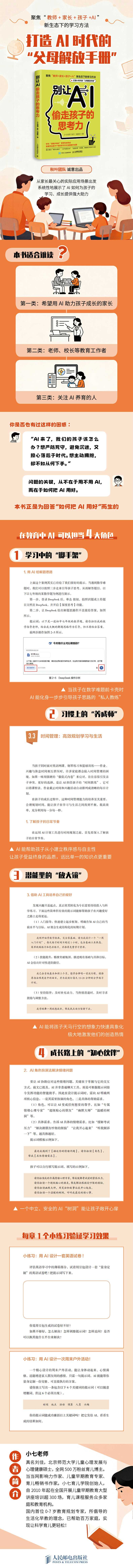 这是一本为青少年及其家庭量身打造的AI时代成长指南,从家长最关心的实际应用场景出发,系统性地展示了AI如何为孩子的学习、成长提供强大助力。全书贯穿“工具、伙伴、导师”三层核心定位,引导孩子从基础认知到主动创造,逐步掌握与AI协作的关键能力,旨在帮助每一个家庭从容拥抱AI新时代。本书从五大维度系统构建了青少年AI素养体系。它始于对AI基础知识与使用原则的掌握,家长和孩子能借此正确打开人机协作的大门;进而深入学习辅导核心场景,展示AI在语文、数学、英语等学科中的“私教级”应用,有效提升学习成绩;更进一步地,本书关注学习习惯与底层能力的培养,教会孩子利用AI进行时间管理、知识速查与高效阅读,培养可以令其终身受益的素养。尤为独特的是,本书用大量篇幅探讨如何借助AI激发孩子的想象力、创新力与逻辑思维,并贴心地将AI的角色延伸至情绪疏导、兴趣培养、人际关系等成长陪伴领域,全方位助力孩子成为更好的自己。小七老师北京师范大学儿童心理发展与心理健康硕士,全网500万粉丝育儿博主。当当网“影响力作家”、儿童早期教育专业人士、育儿热销书作家,小七育儿学院创办人。自2010年起在全国开展300场多场儿童早期教育大型讲座培训,为众多家庭和教育机构提供育儿课程服务。作为国内0~7岁教育规划专家,他所倡导的生活化早教的理念,已帮助百万家庭,实现了轻松化科学育儿!秋叶武汉工程大学副教授、秋叶品牌创办人、全平台新媒体矩阵账号粉丝超4000万。《AI时代生存手册:零基础掌握DeepSeek》作者,该书销量突破40万册;策划“秒懂AI”系列图书,销量超20万册。推出AIGC高校通识课程解决方案,形成图书、网课、线上直播、线下实训一体化服务体系。刘晨昕高考理科701分,本科就读于清华大学新雅书院,研究生就读于清华大学中文系,现从事出版工作。第 一章 不可阻挡的未来,手足无措的父母1.1 AI时代的父母:用“认知升维”克服“养育焦虑”/0031.2 教育新维度:懂AI的父母更懂教育/0091.3 以成长为核心原则:避免过度依赖的方法/0141.4 从了解AI工具开始:豆包、DeepSeek等/0191.5 提示词的学问:打开AI宝藏的关键钥匙/028小练习:和AI打个招呼吧!/033第二章 学习辅导:让孩子成绩快速提升的免费私教2.1 作文救星:从“无从下笔”到“思路清晰”/0372.2 数学通关:从解题思路到真题诊断/0492.3 英语逆袭:听说读写全面进阶/0542.4 物理助手:让抽象概念一目了然/0632.5 化学通关:从微观世界到宏观现象/0722.6 全面兼顾:多学科共同进步/080小练习:用AI设计一套英语试卷!/089第三章 学习习惯:让孩子受益终身的宝贵财富3.1 知识点速查:快速理解复杂概念/0933.2 定制复习计划:考试冲刺不慌张/0973.3 时间管理:高效规划学习与生活/1023.4 高效阅读:一学就会的3种AI阅读法/1073.5 多工具融合:联合提升学习效率/116小练习:用AI制订寒假学习计划!/121第四章 能力提升:借助AI挖掘孩子的潜能4.1 想象力拓展:用AI把幻想变成真实画面/1254.2 创新力培养:音乐与网页,把AI玩出新花样/1334.3 动手力提升:用AI做个智能体/1404.4 逻辑推理能力锻炼:和AI玩游戏能训练逻辑思维/1494.5 学习力进阶:用AI帮自己“啃”下新知识/160小练习:用AI创作一首感谢父母的歌曲!/170第五章 成长加速:AI陪你一起变强大5.1 压力大,没信心?找它/1735.2 零花钱不会规划?找它/1795.3 培养爱好没方法?找它/1845.4 与父母沟通却难开口?找它/1915.5 校园关系咋处理?找它/1985.6 对世界充满好奇?找它 /2105.7 未来规划没方向?找它/218小练习:用AI设计一次周末户外活动!/226- 新华一城书集 (微信公众号认证)