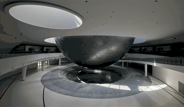 主建筑以优美的螺旋形态构成"天体运行轨道",独具特色的圆洞天窗、球幕影院和倒转穹顶这三个圆形元素构成"三体"结构,共同诠释天体运行的基本规律。