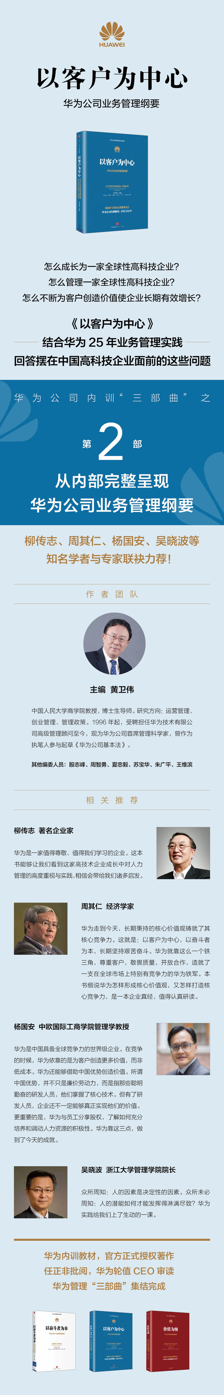 本书分为三篇。第一篇,以客户为中心。这是贯穿华为业务管理的主线。第二篇,增长。围绕长期有效增长这一价值创造主题,系统阐述了华为的业务管理战略和政策。第三篇,效率。围绕未来的竞争是管理的竞争这一命题,阐述了华为在组织设计与运行、端到端流程持续改进,以及建设数字化企业方面的政策和原则,并深入讨论了华为管理变革的指导方针。