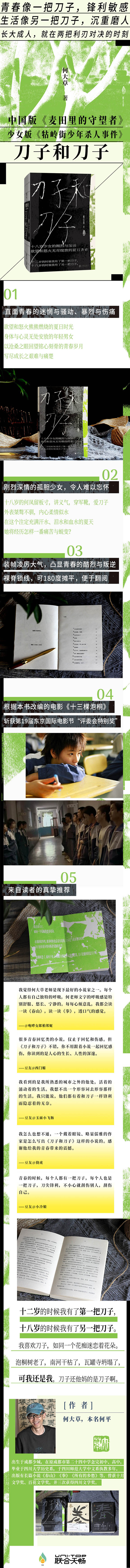 1.《刀子和刀子》淋漓尽致地描绘了青春岁月里的迷惘与骚动、叛逆与伤痛,展现了少男少女所遭遇的身体疼痛与灵魂煎熬,直面人性,直击人心,被读者誉为中国版《麦田里的守望者》。