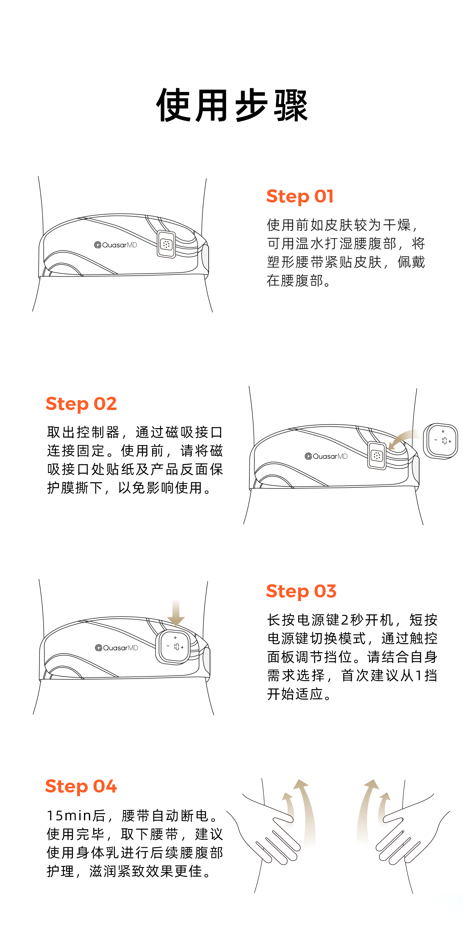 使用本产品前,应摘除身上的金属饰品(如眼镜、耳钉、项链手表、戒指等),如做过手术身体里带有金属(如心脏搭桥、骨折钢钉等),请勿使用