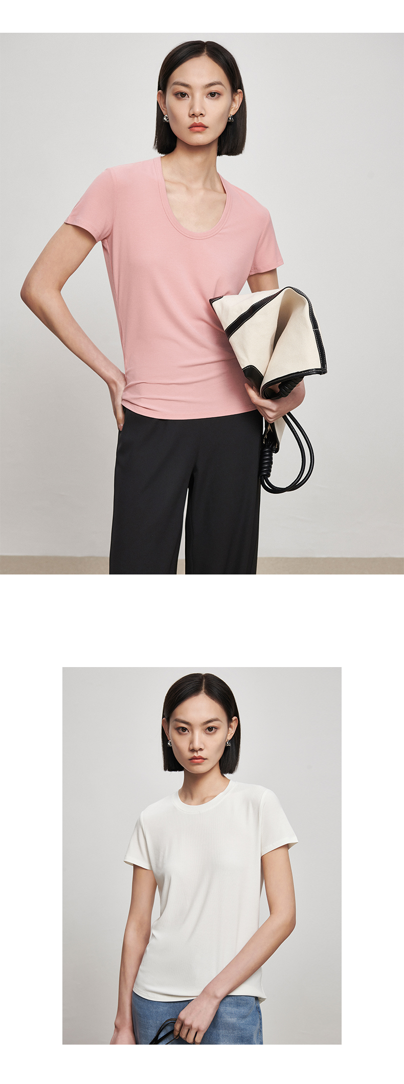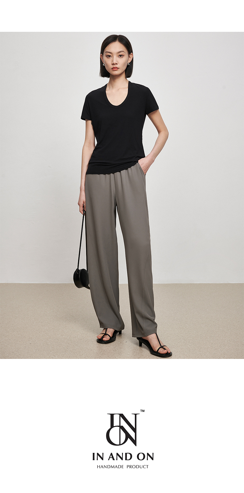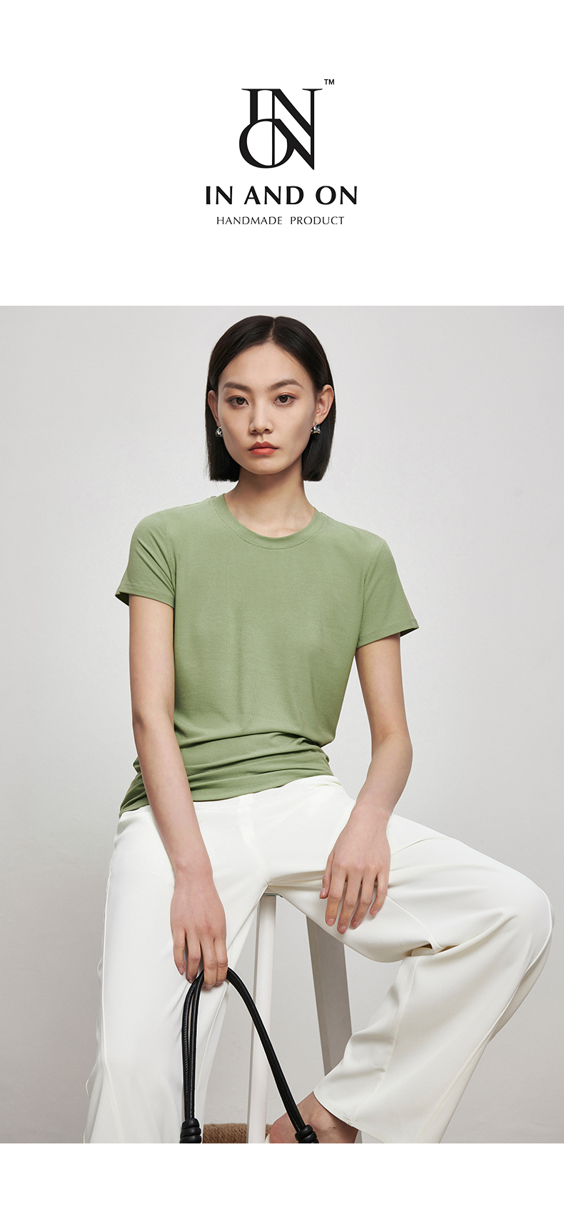 IN AND ON53345夏新款女短袖桑蚕丝T恤正肩凉感纯色圆领显瘦休闲上衣