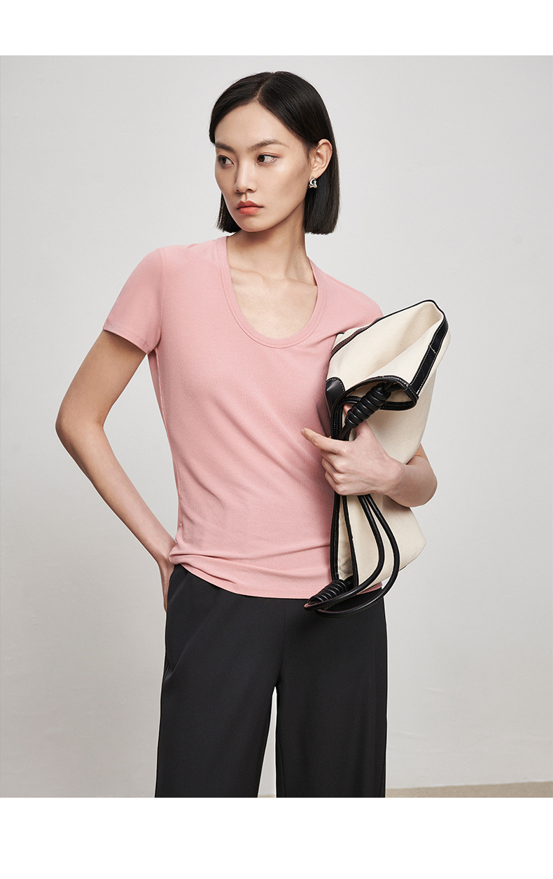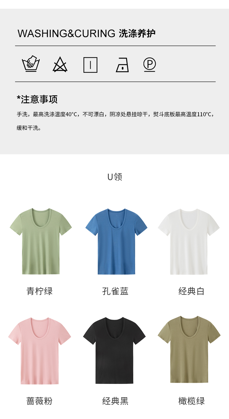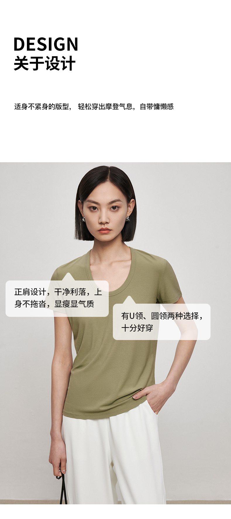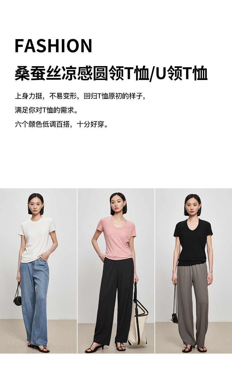 IN AND ON53345夏新款女短袖桑蚕丝T恤正肩凉感纯色圆领显瘦休闲上衣