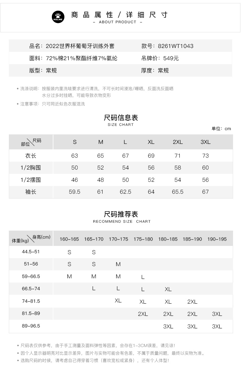 KELME卡尔美 2022秋冬新款葡萄牙足球训练外套冬训针织外套队服