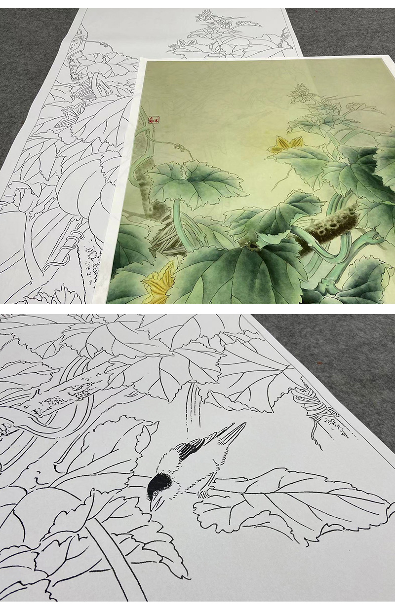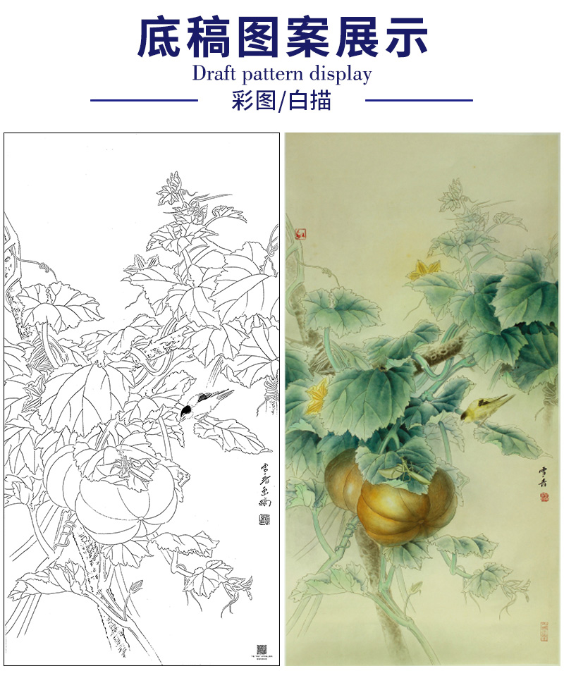 【大彩图】龚雪青工笔画白描底稿《乡间瓜趣》南瓜临摹勾线花鸟线稿XQ59
