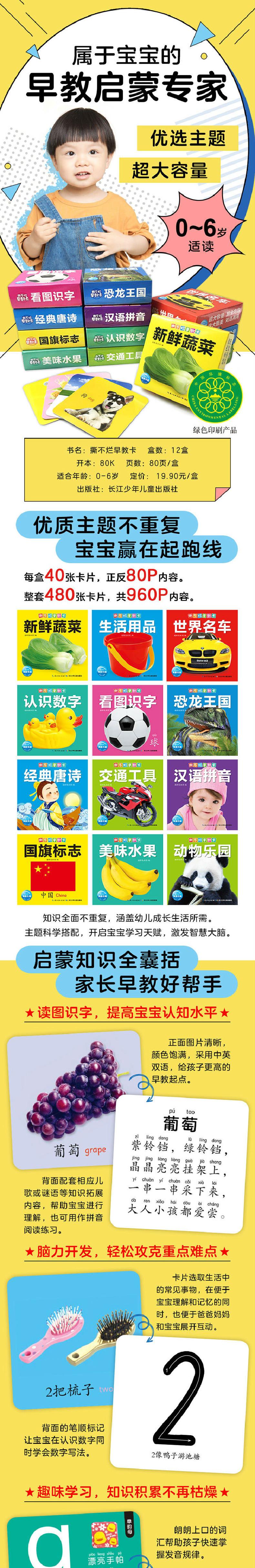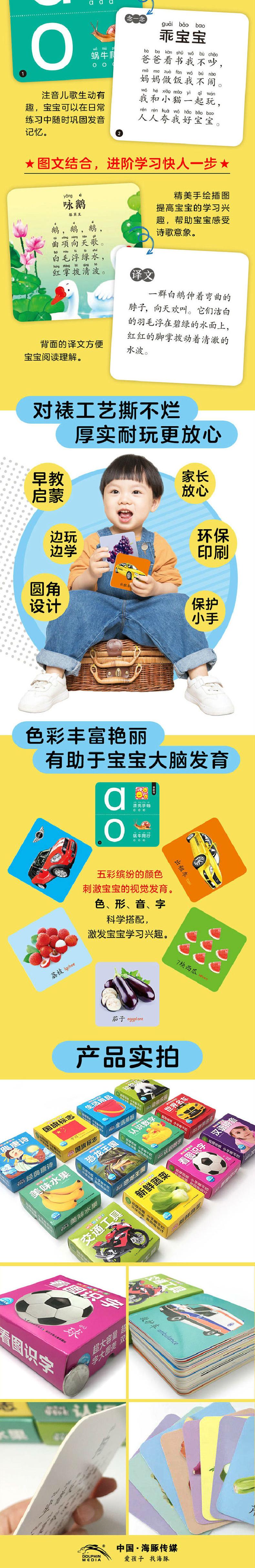 卡片图片精美。每册采用一页一图的形式编排,认知类卡片均选取高清亮丽的实物拍摄彩图,帮助宝宝迈入启蒙认知的新殿堂;唐诗配有可爱的手绘彩图,形象逼真,增强宝宝学习兴趣,同时,卡片鲜艳的色彩也能刺激宝宝的视觉,刺激宝宝的视觉发育。