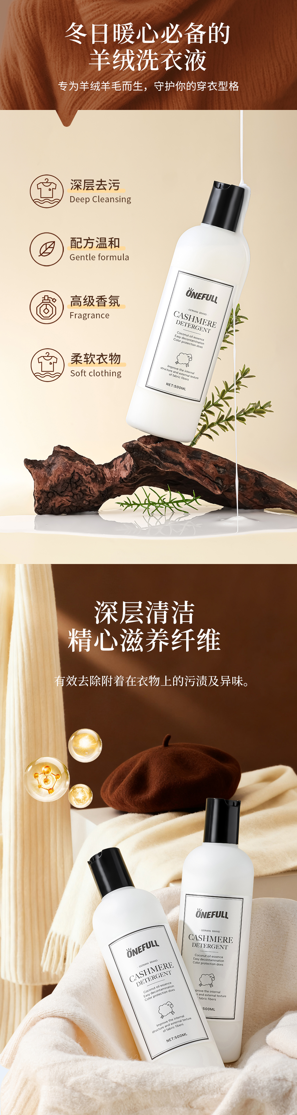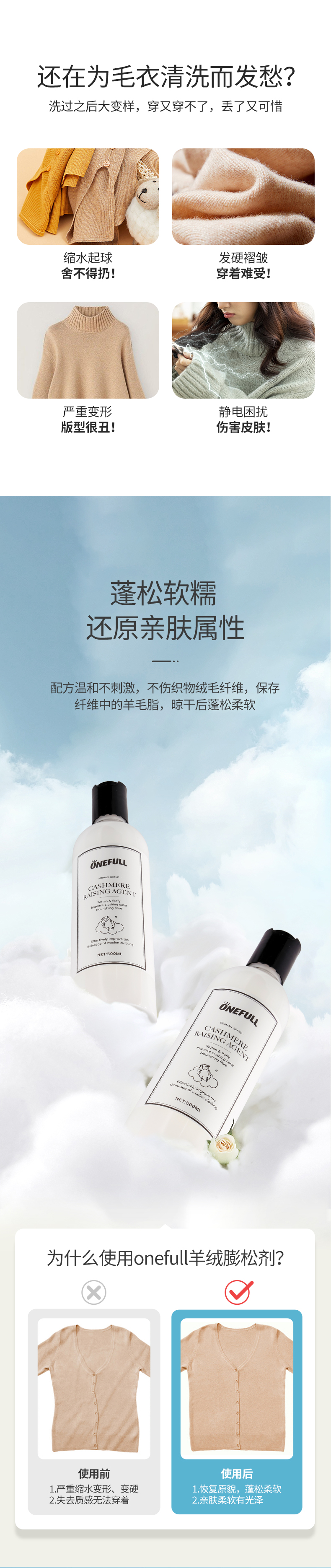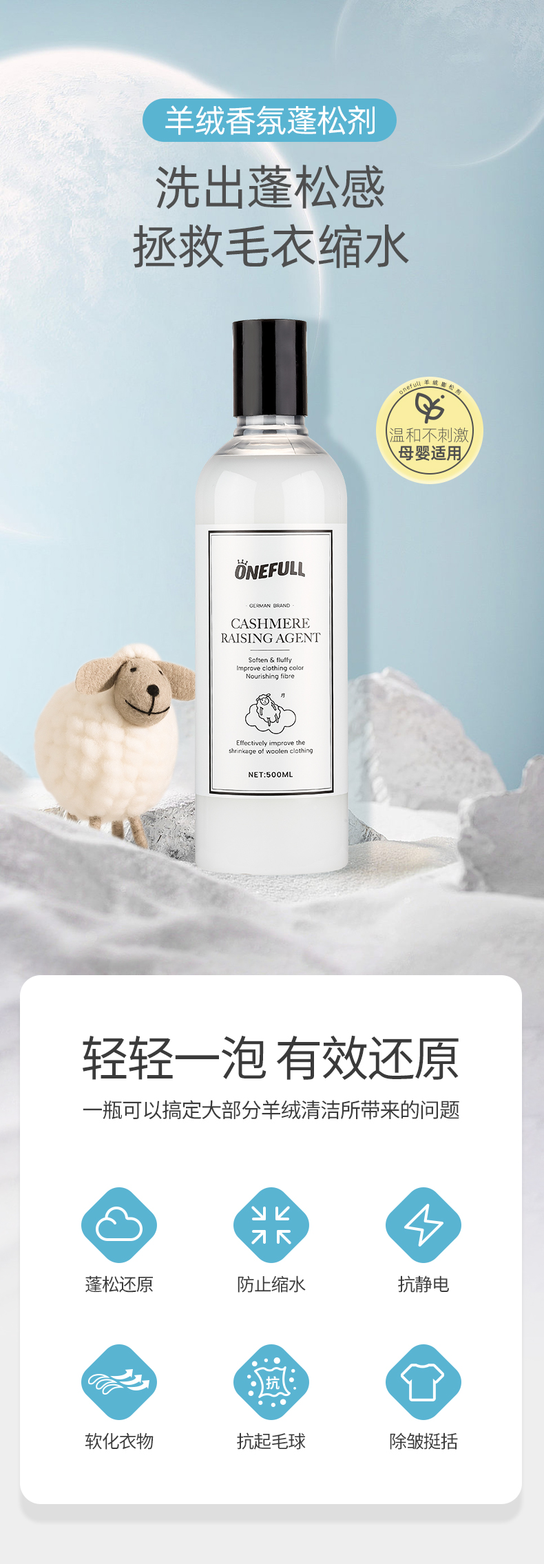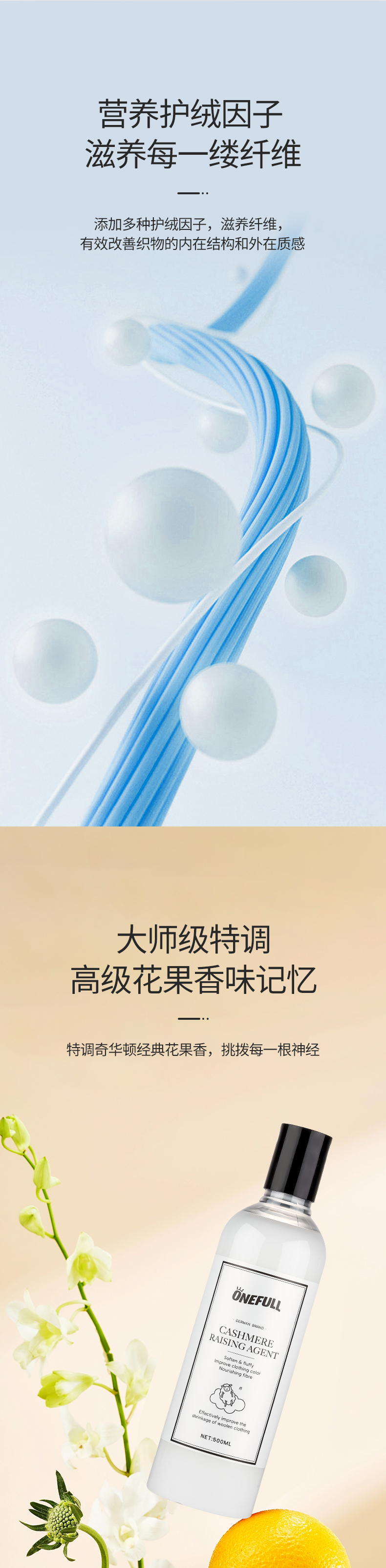 onefull羊毛/真丝/羽绒服/羊毛还原蓬松剂高端洗护系列(下单即赠羽绒服清洁湿巾12片/包*2包)