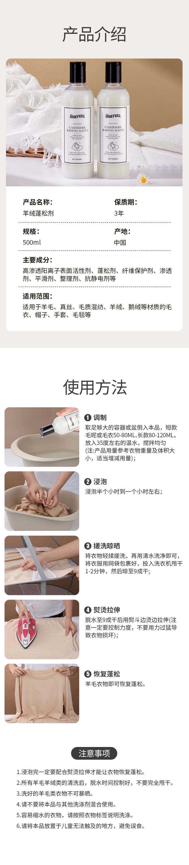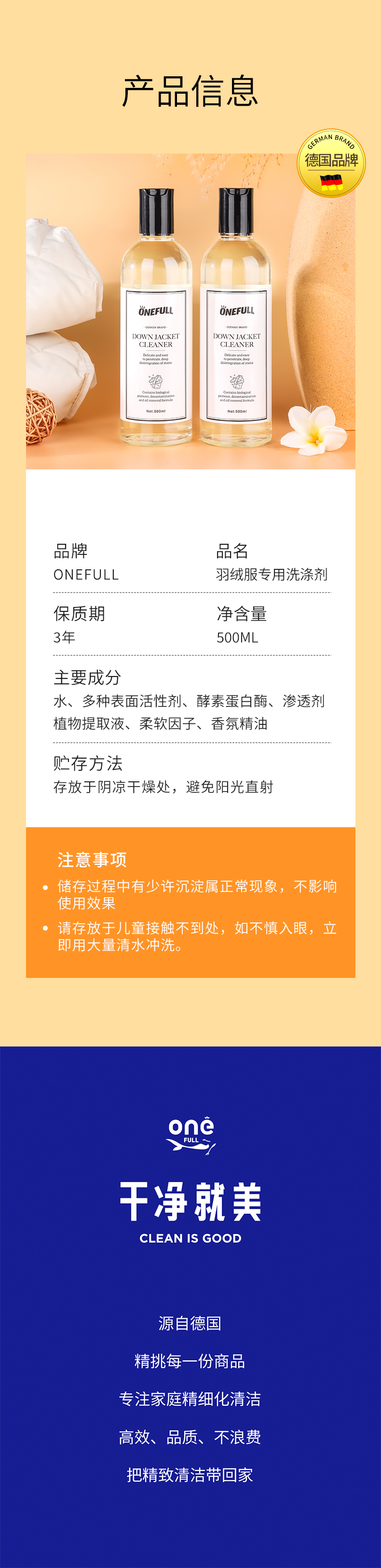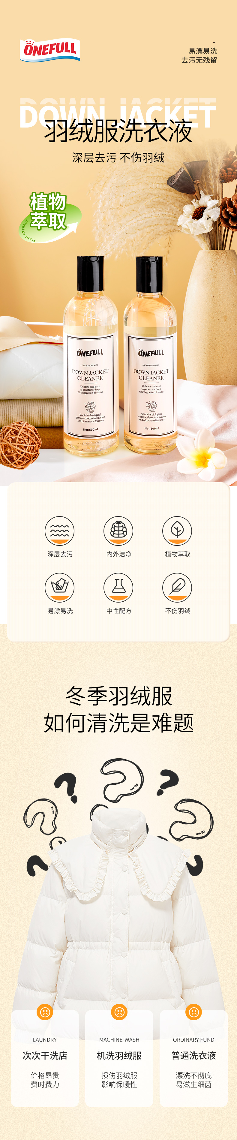 onefull羊毛/真丝/羽绒服/羊毛还原蓬松剂高端洗护系列(下单即赠羽绒服清洁湿巾12片/包*2包)