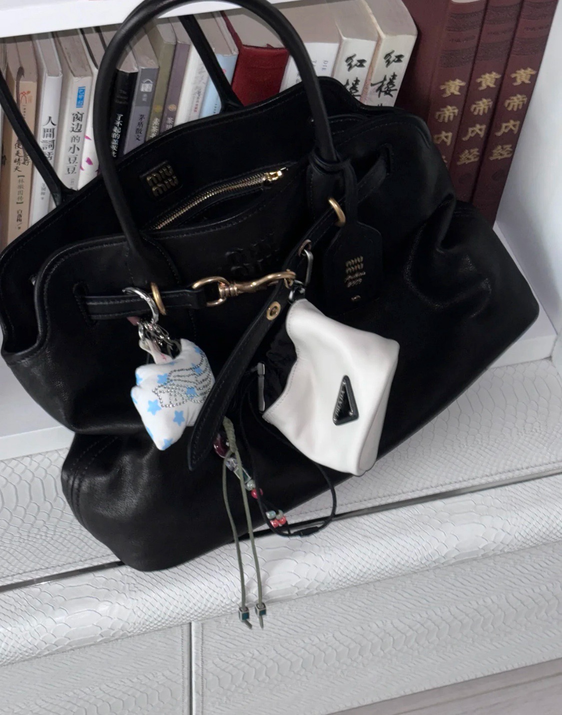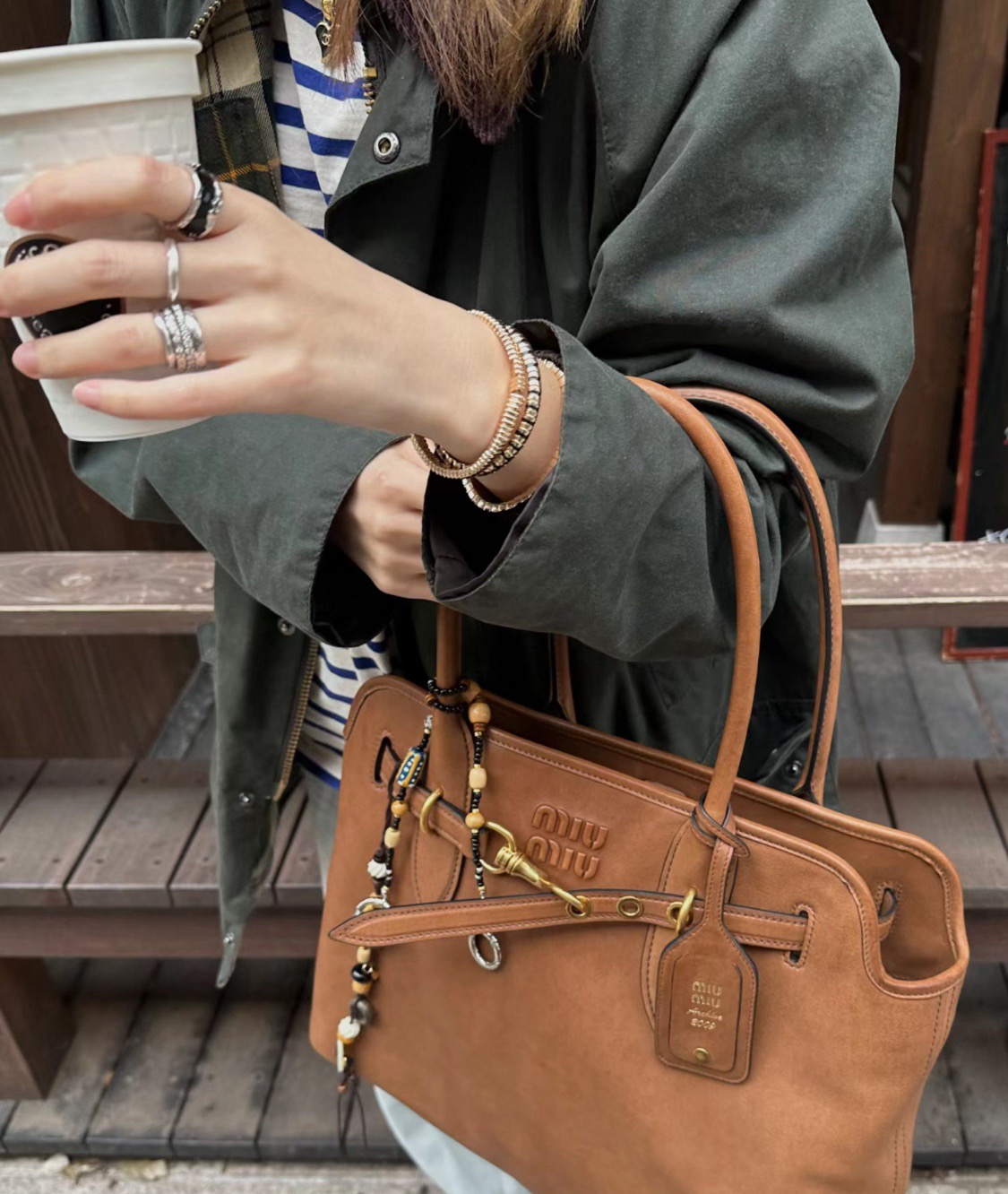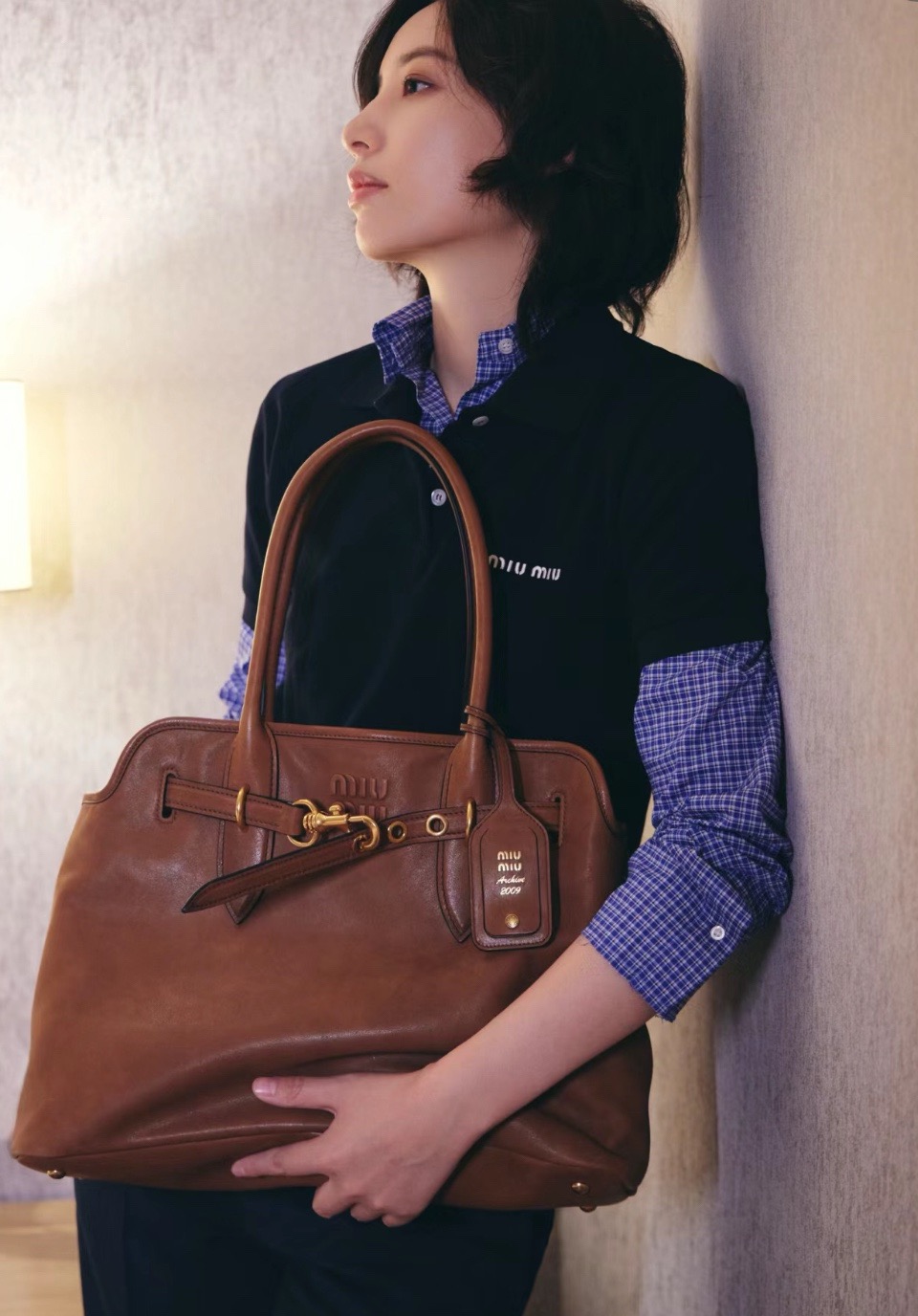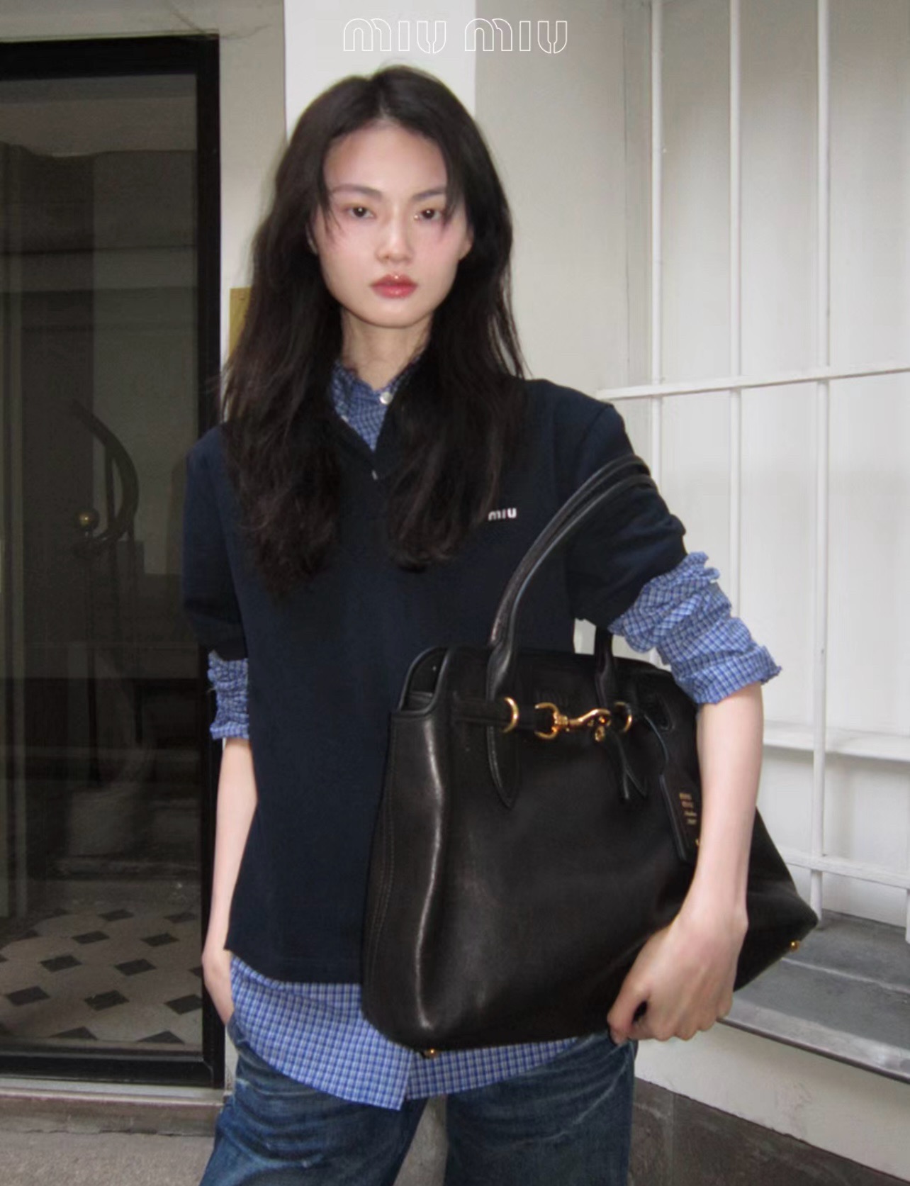 miu'miu这么多款式里,我最喜欢的还是大手提包,简单的 Logo浮雕设计,搭配长方形的包身和偏长的手柄,拎在手里更有年轻、潇洒的态度!