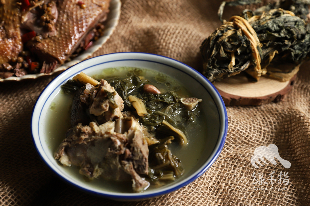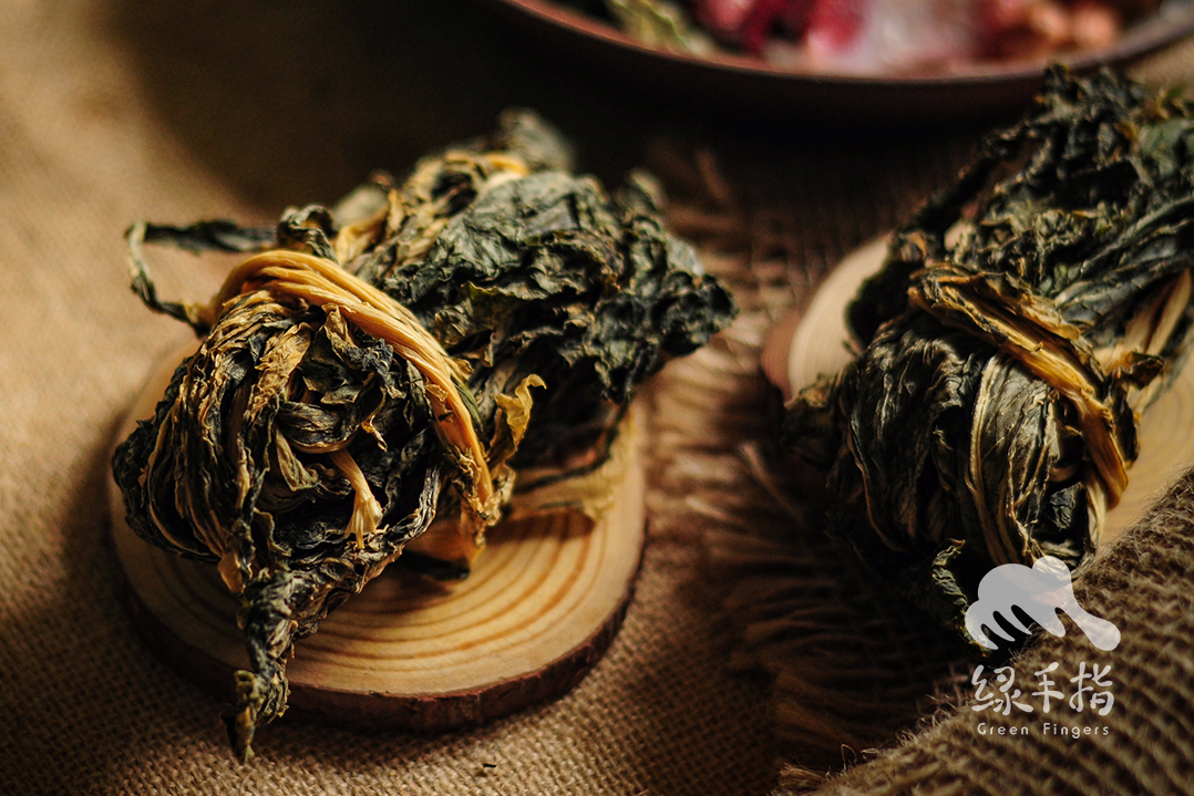 从地里摘回来的芥菜叶晒软焯水,再用冷水清洗焯水后暴晒2-3天或烘干,再收回来绑成小扎,就做成看美味的菜干,别具风味。经过泡发后依旧清新爽滑,味道鲜美,特别适合煲汤、煲粥、炖肉。