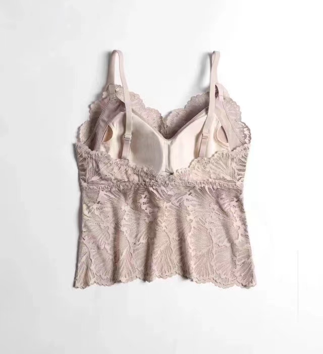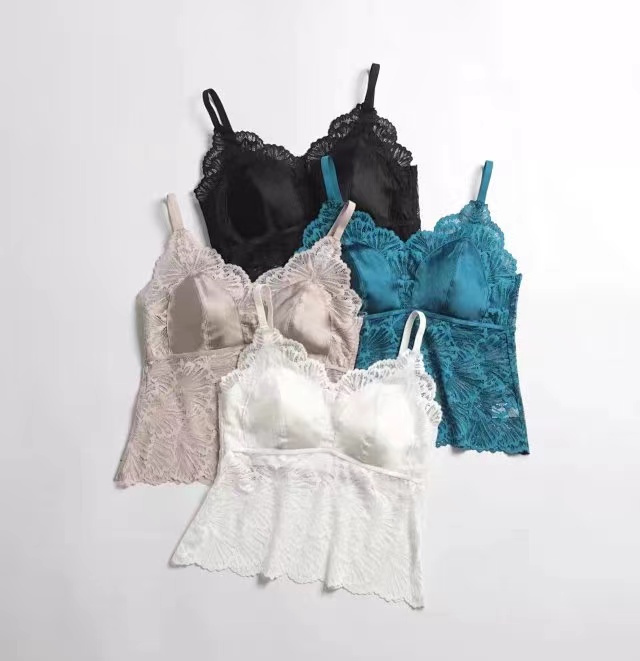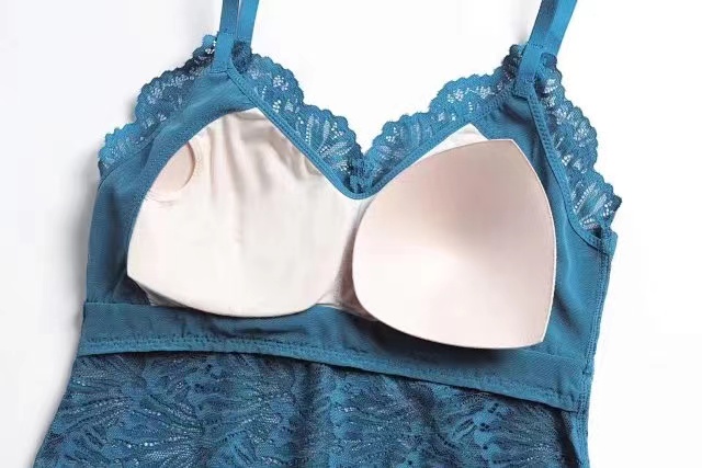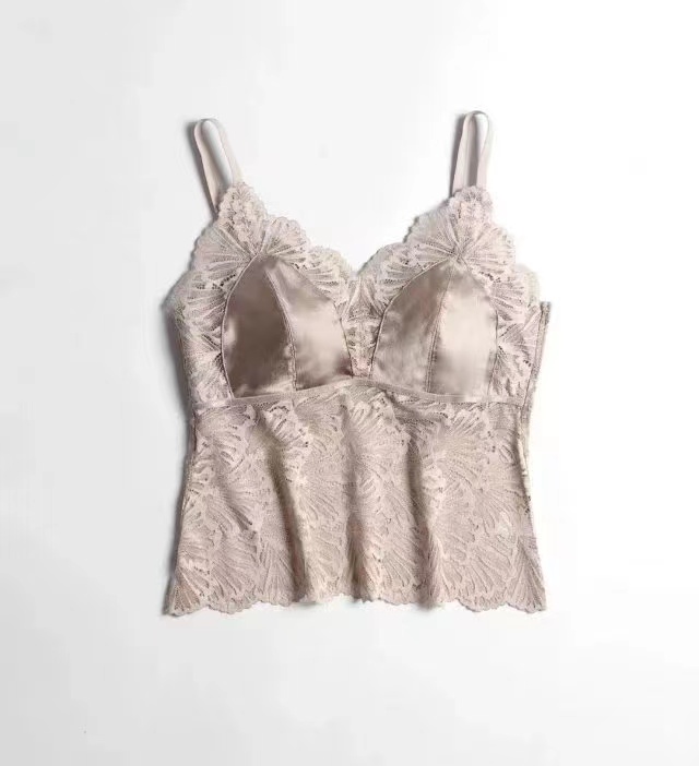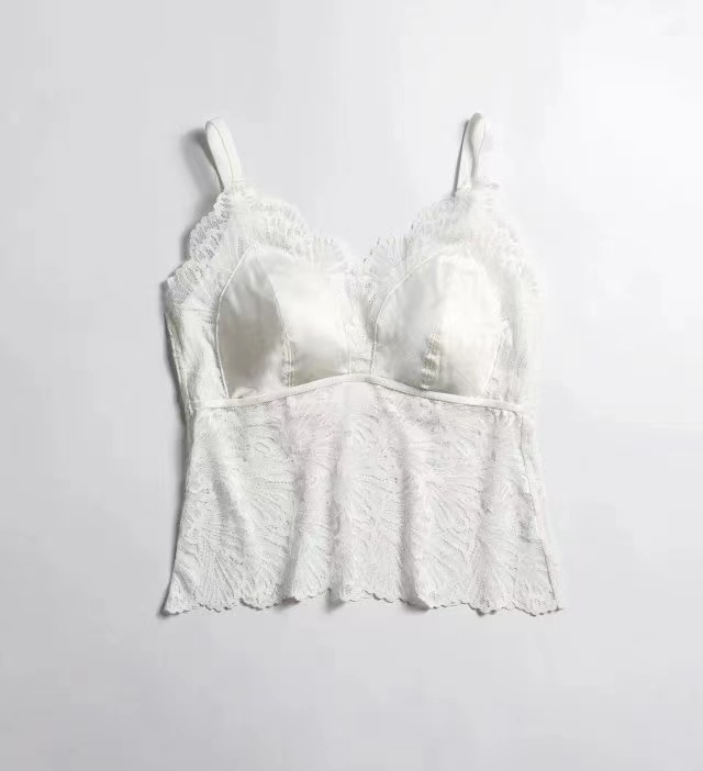 真丝,贴合身体舒适丝滑;进口蕾丝边拼接,触感柔软,纹理立体感强,很显质感,露出也没有负担;内里带无钢圈胸垫,无需再穿一层内衣;罩杯里料莫代尔+真丝面料,柔软亲肤。