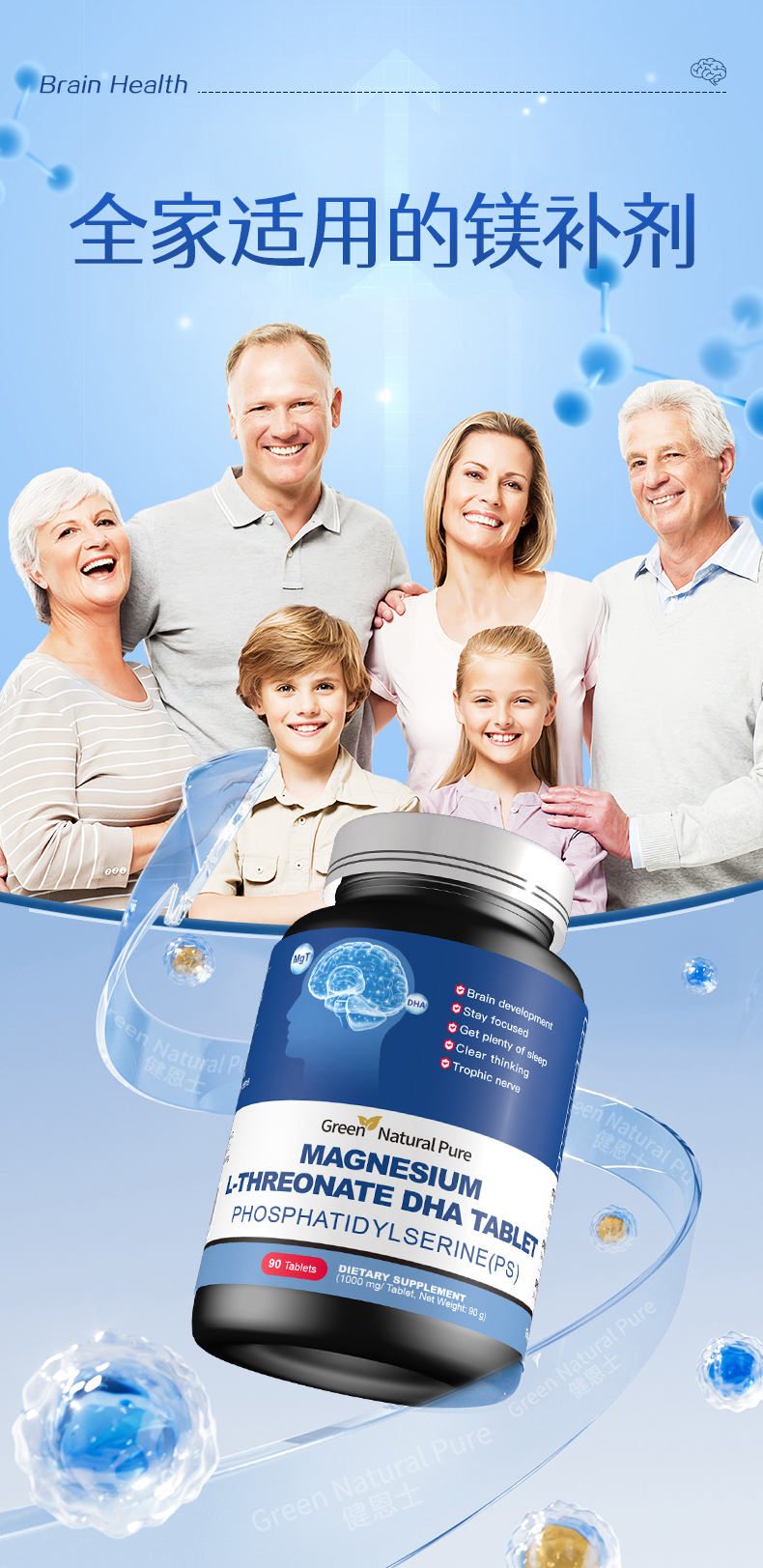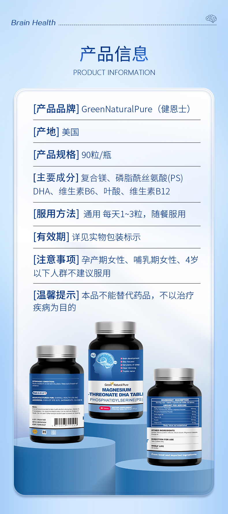 GNP脑达人复合镁补充剂儿童成人PS磷脂酰丝氨酸DHA苏糖酸镁片【SL】