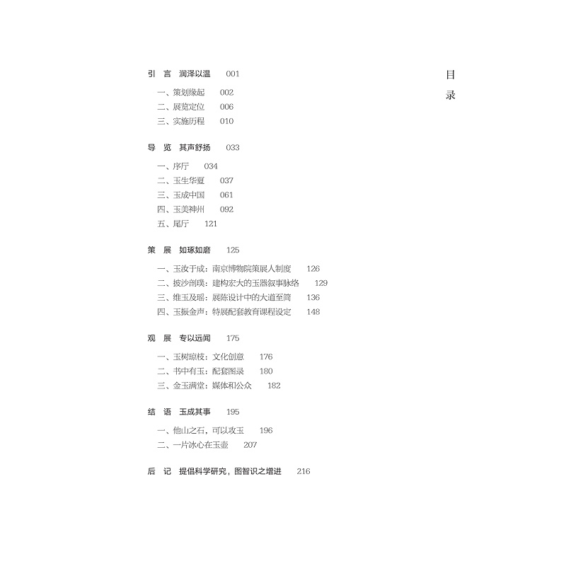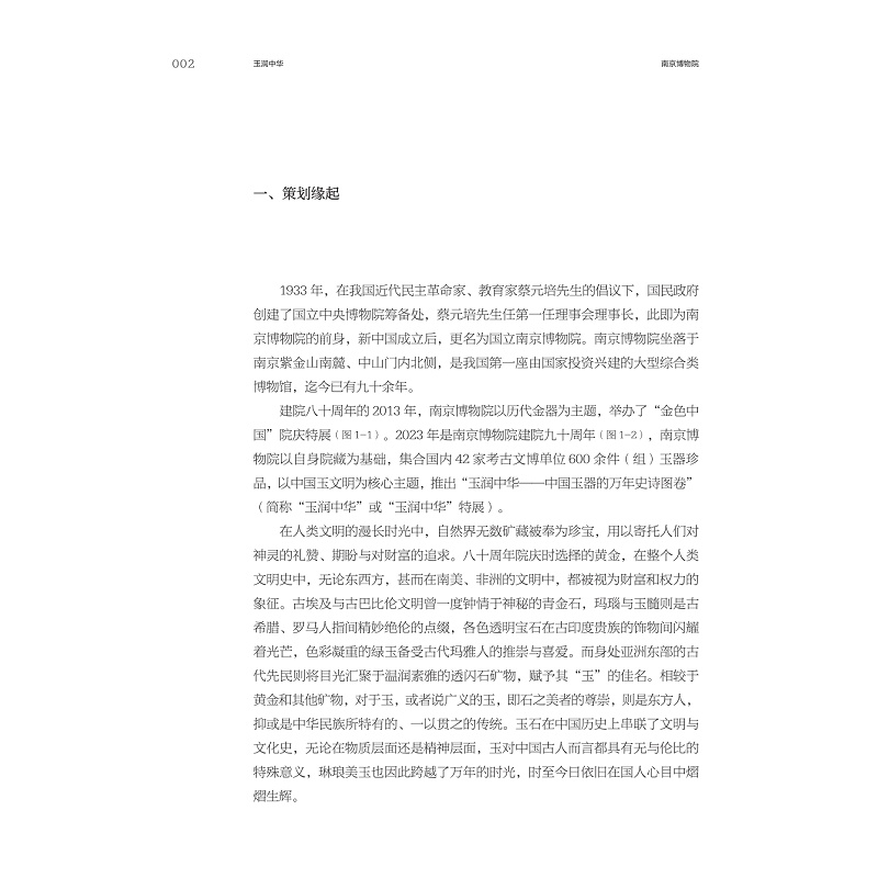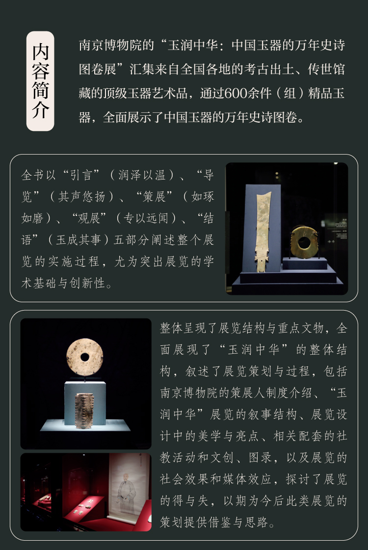 南京博物院的“玉润中华:中国玉器的万年史诗图卷展”汇集来自全国各地的考古出土、传世馆藏的顶级玉器艺术品,通过600余件(组)精品玉器,全面展示了中国玉器的万年史诗图卷。全书以“引言”“导览”“策展”“观展”“结语”五部分阐述整个展览的实施过程,尤为突出展览的学术基础与创新性;呈现了展览结构与重点文物,全面展现了“玉润中华”的整体结构,叙述了展览策划与过程,包括南京博物院的策展人制度介绍、“玉润中华”展览的叙事结构、展览设计中的美学与亮点、相关配套的社教活动和文创、图录,以及展览的社会效果和媒体效应,探讨了展览的得与失,以期为今后此类展览的策划提供借鉴与思路。