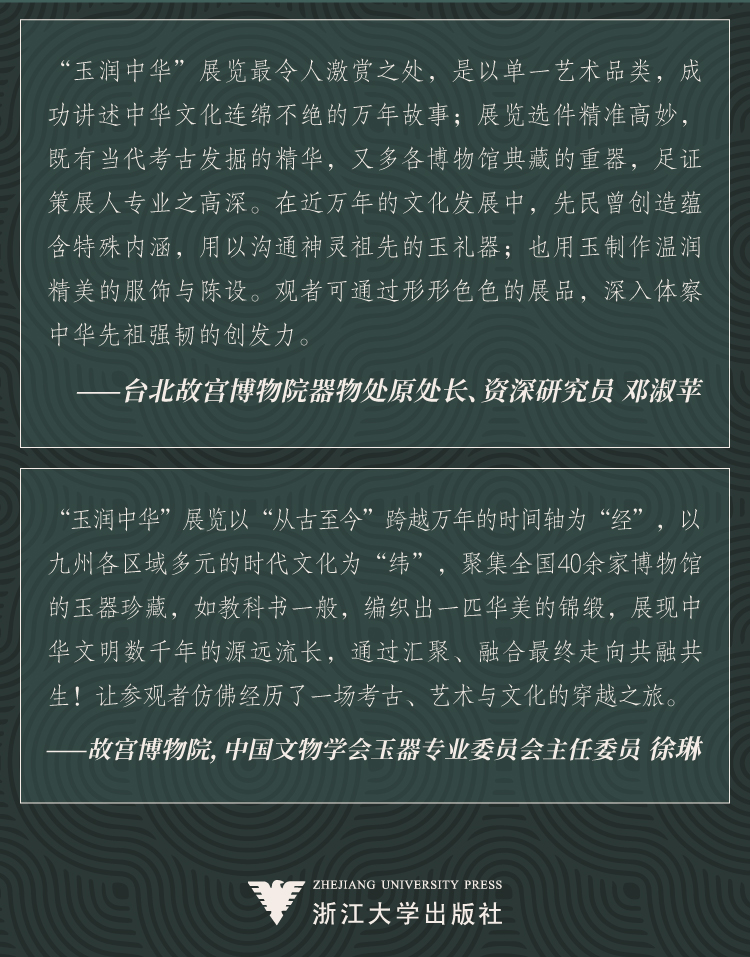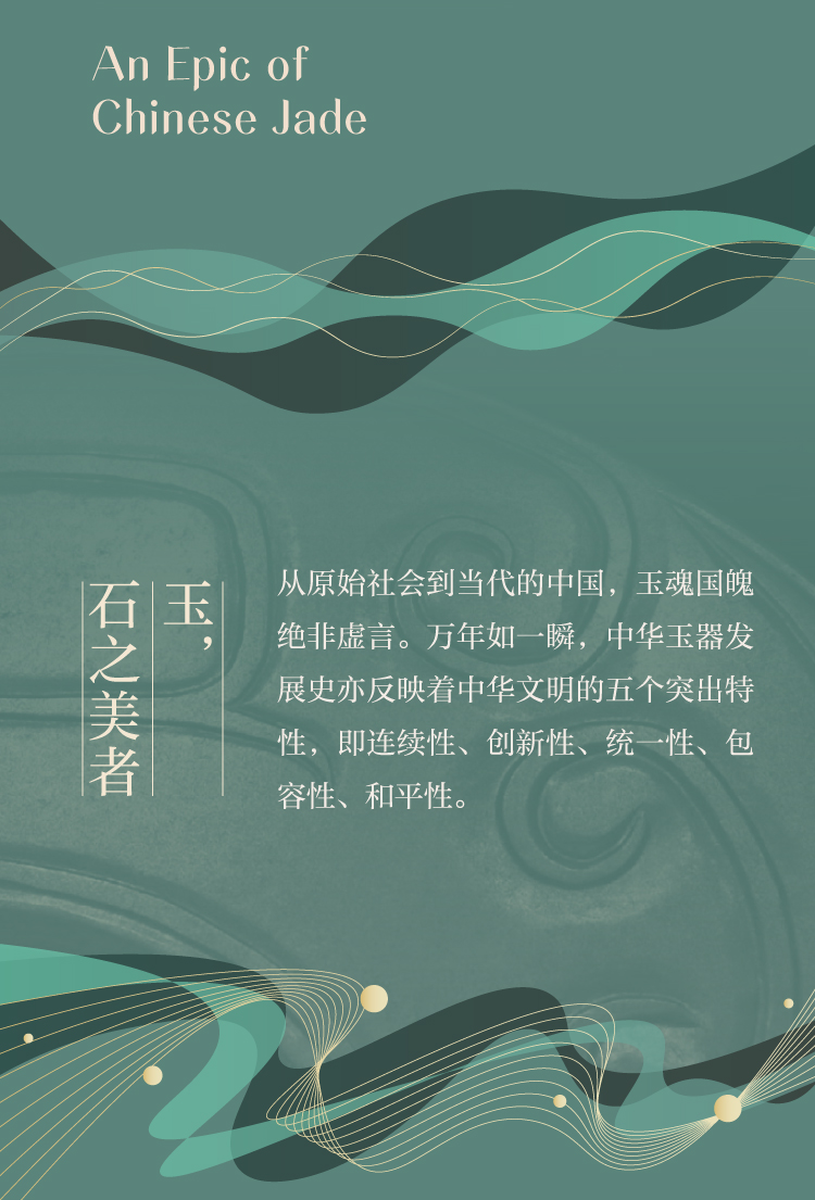 “玉润中华”展览以“从古至今”跨越万年的时间轴为“经”,以九州各区域多元的时代文化为“纬”,聚集全国40余家博物馆的玉器珍藏,如教科书一般,编织出一匹华美的锦缎,展现中华文明数千年的源远流长,通过汇聚、融合最终走向共融共生!让参观者仿佛经历了一场考古、艺术与文化的穿越之旅。