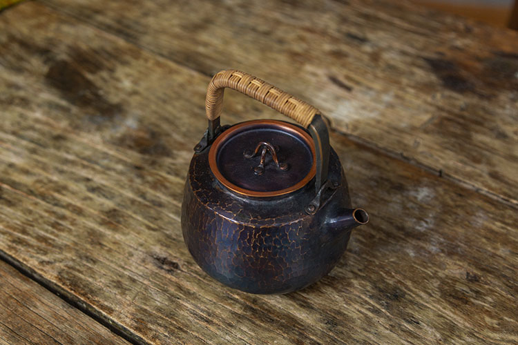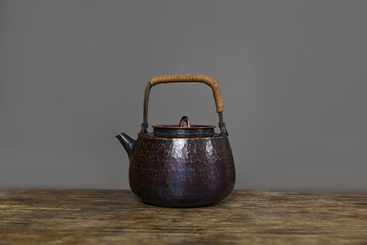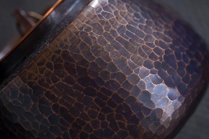 铜壶的表面经由手工敲打,形成的锤目纹路。