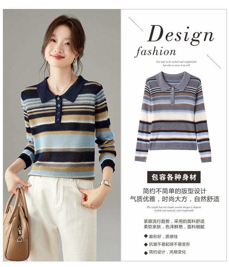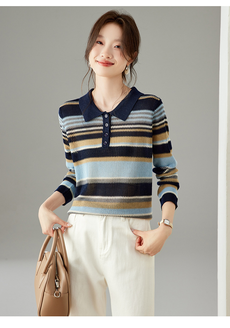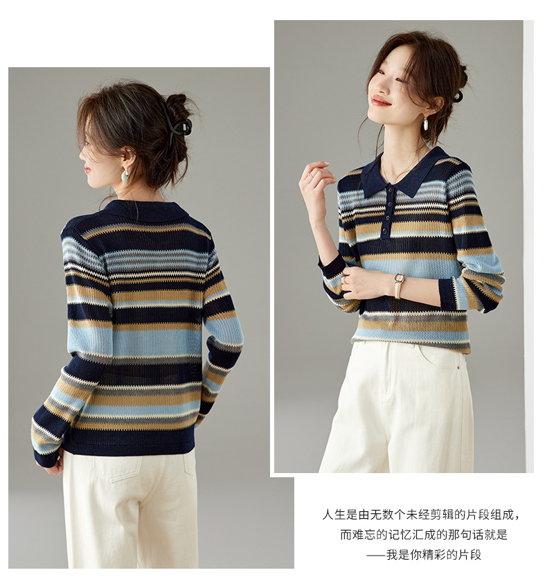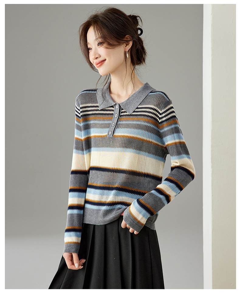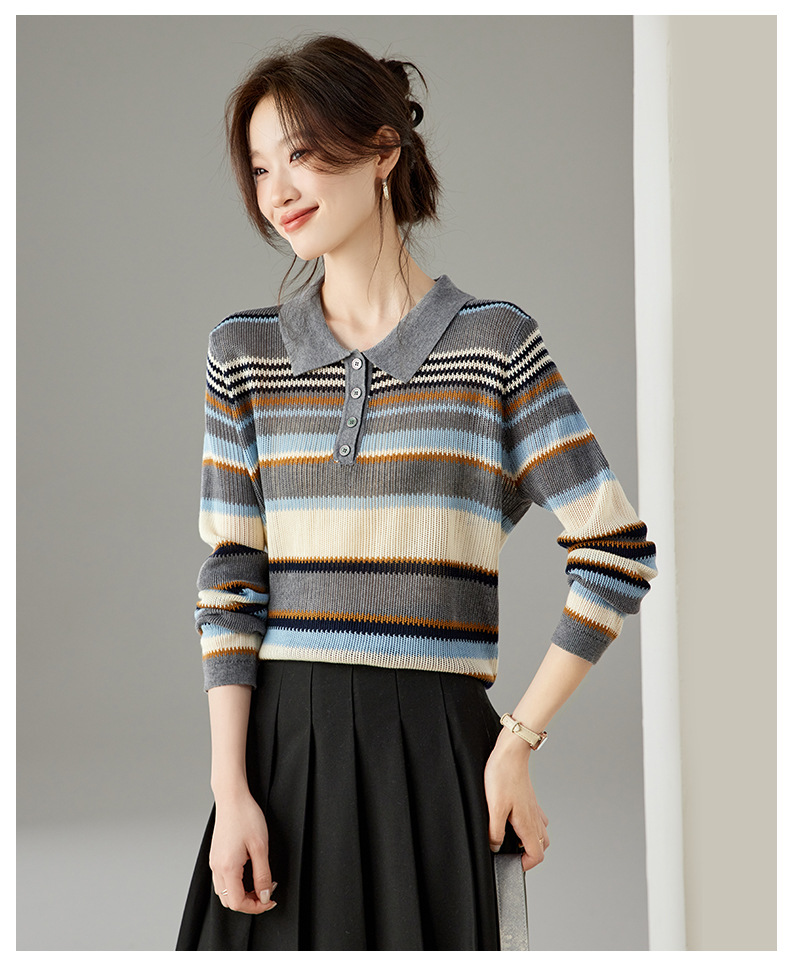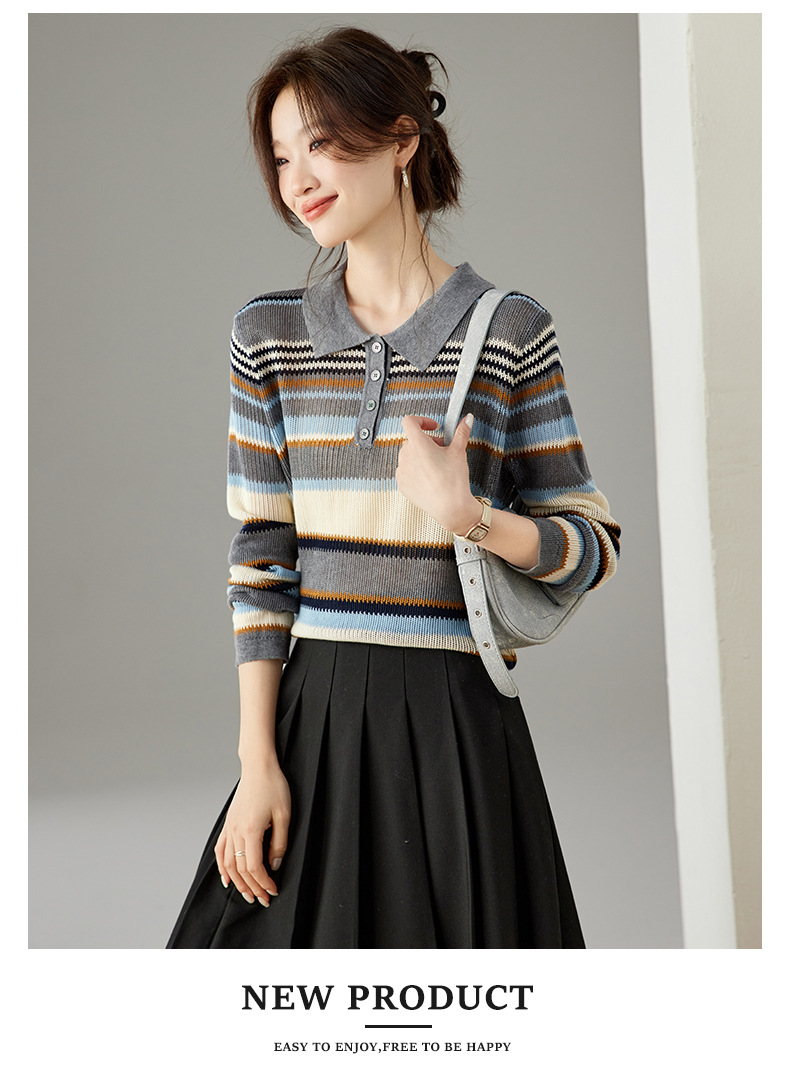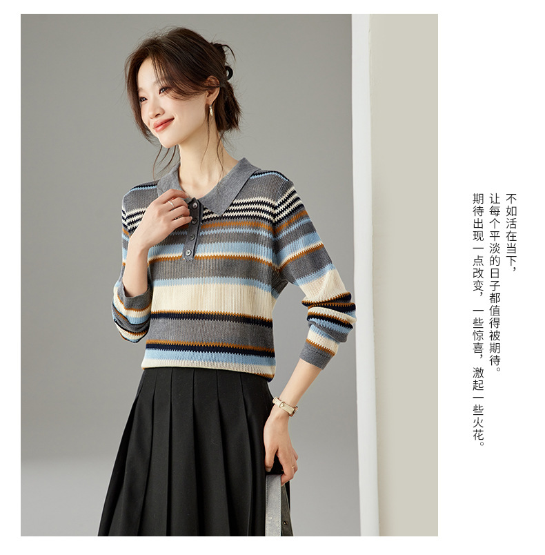 SC35-25161-168 2025秋冬新款翻领撞色条纹针织衫女薄衬衫领宽松线衣外穿女打底衫