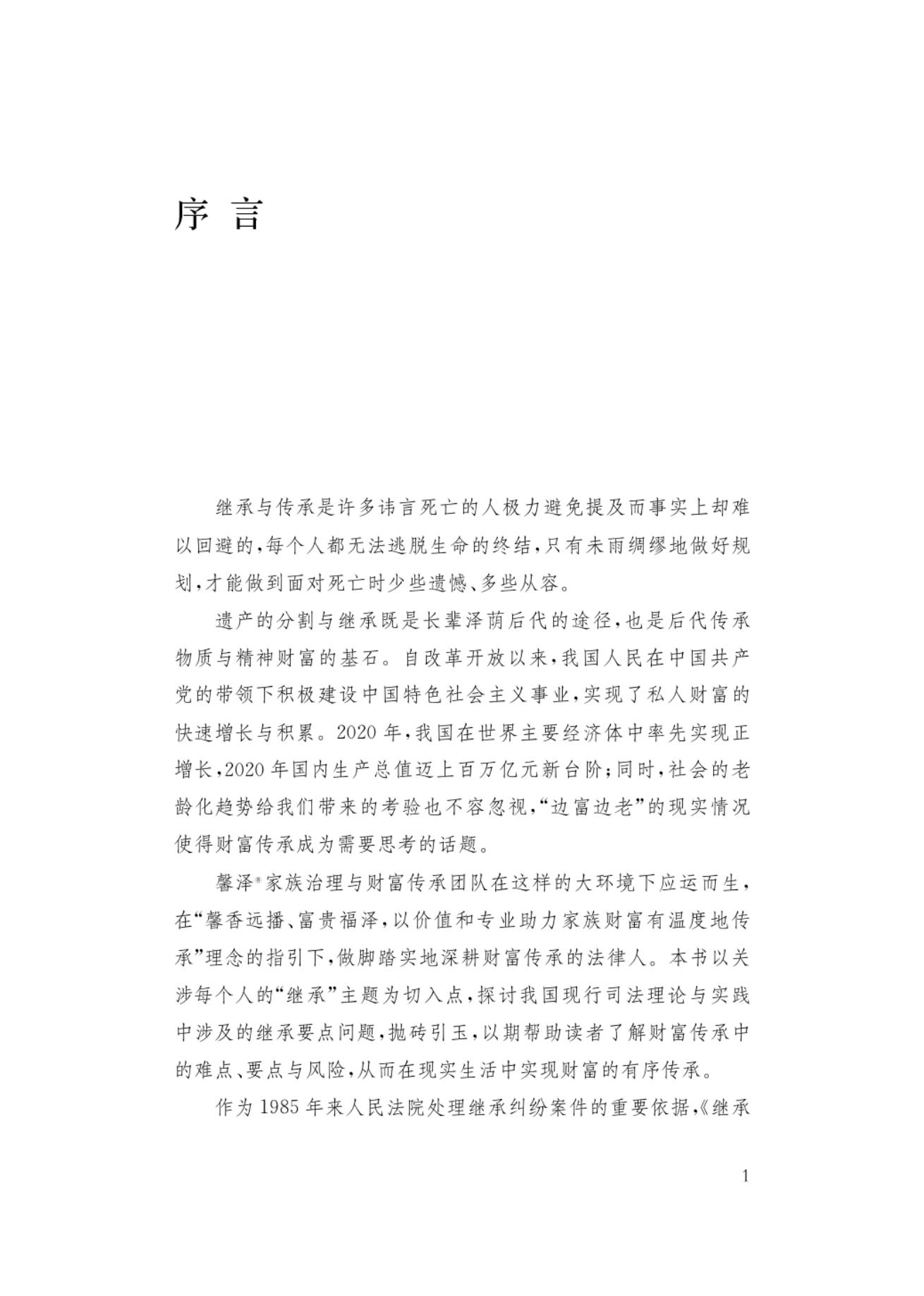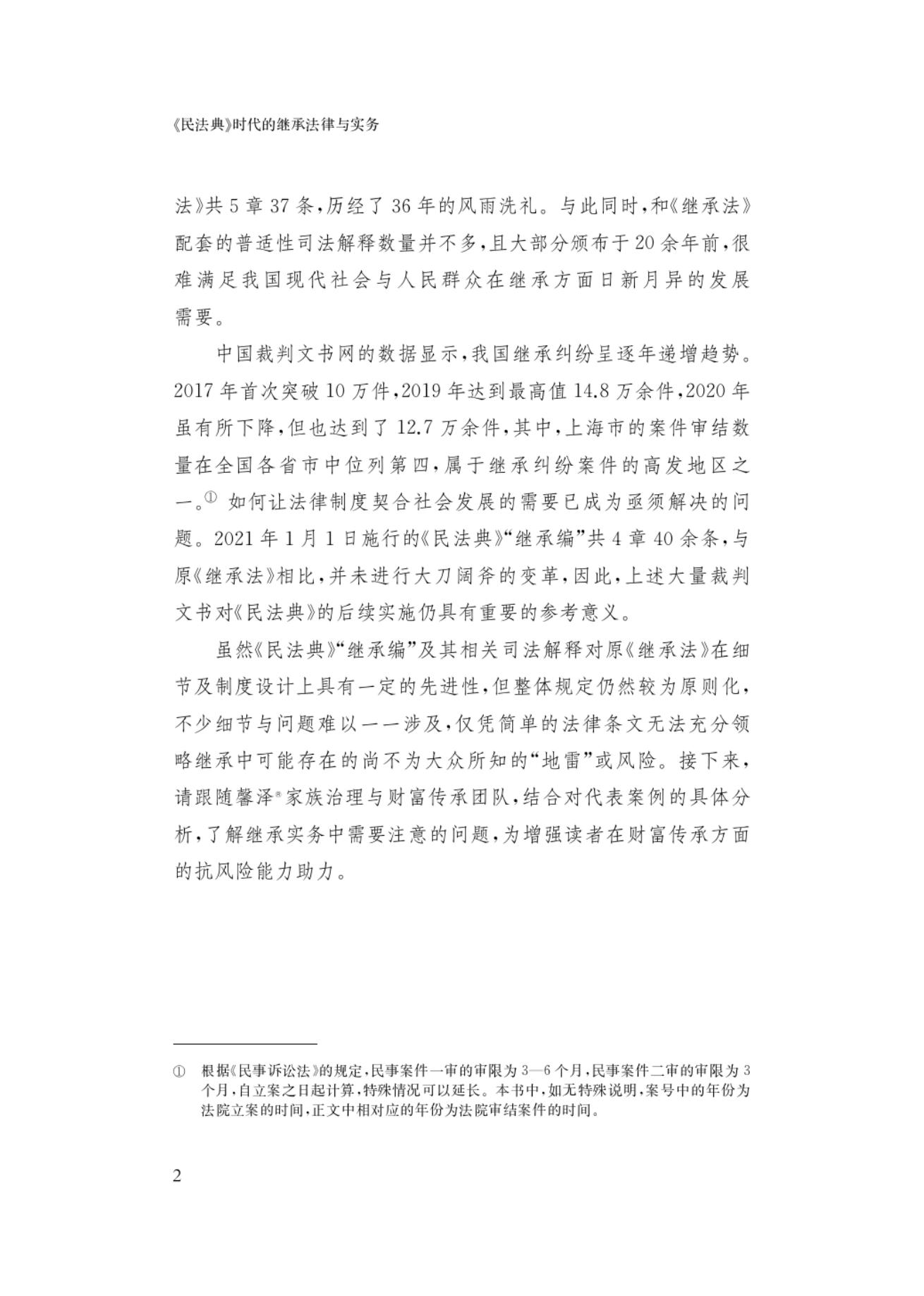 本书主要分析了与“传什么、传给谁、怎么传、传承结果”四大核心要点相关的继承实务、法律风险以及建议。全书按照继承发生的顺序,结合2021年施行的《民法典》,从继承的开始切入,分别阐释了继承的发生、遗产范围的认定、法定继承、遗嘱继承(遗赠),以及代位继承、转继承、后位继承三种特殊情形。本书以案释法、重点突出、通俗易懂、受众广泛,读者既可以是对继承法律感兴趣的研究人员、涉及继承纠纷处理的当事人,也可以是准备提前做好财富传承安排的人士等。