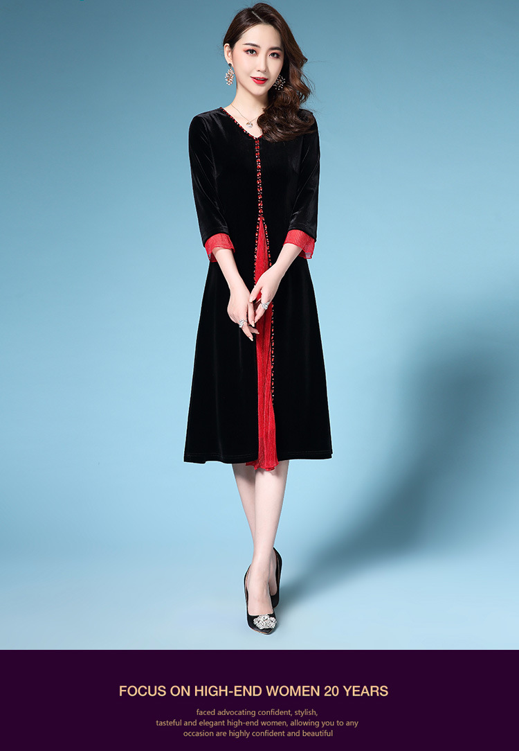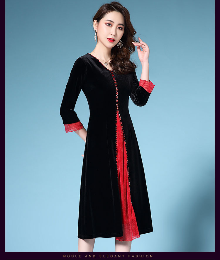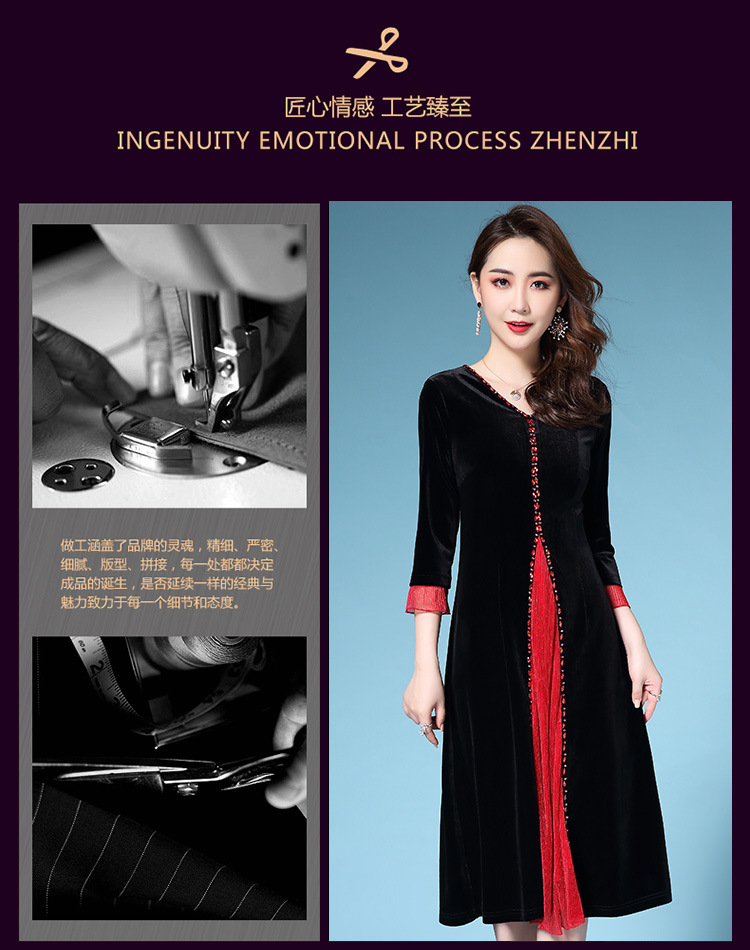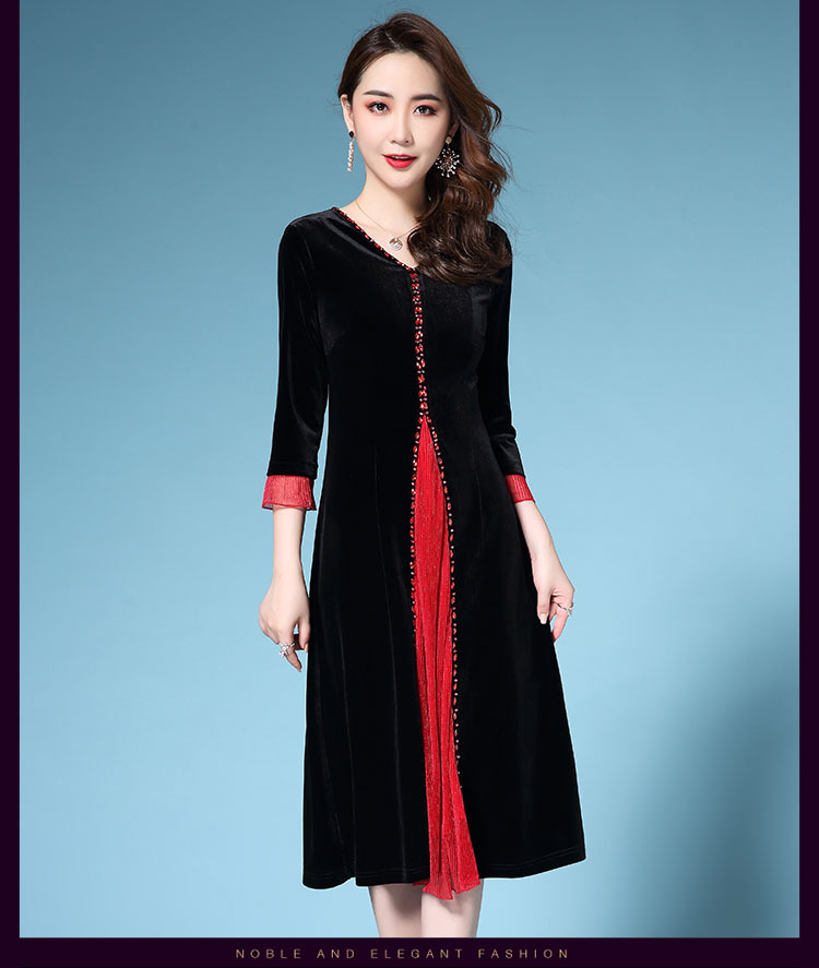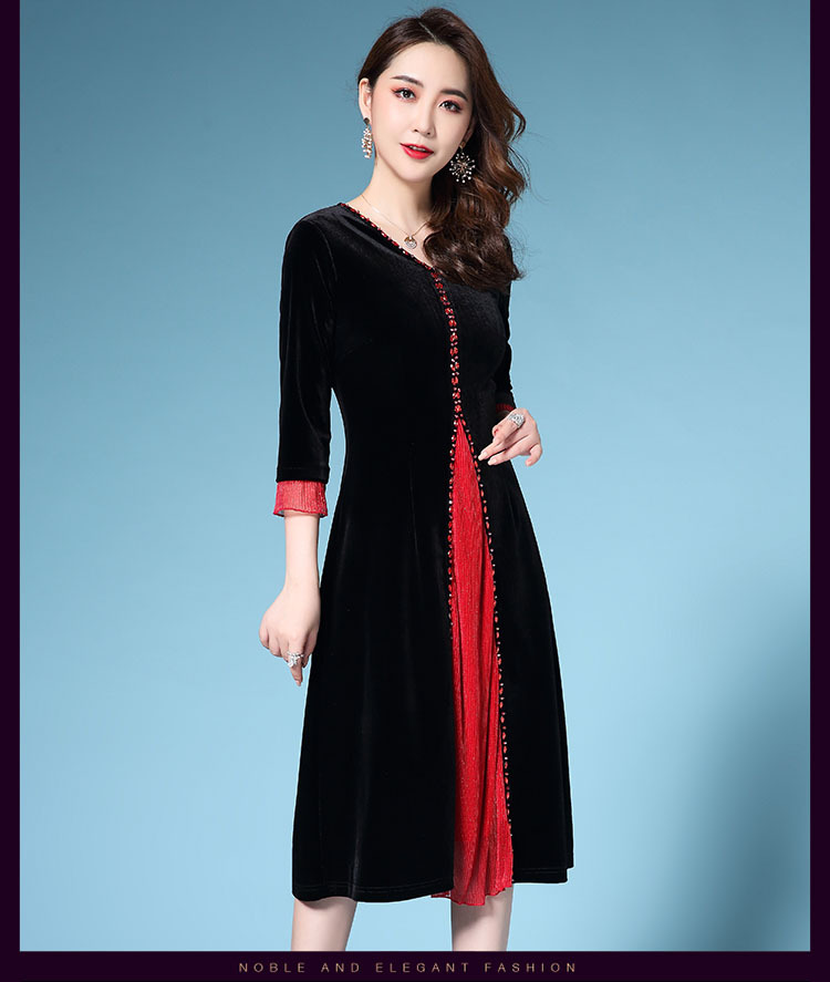 DYSL-Q5176新款气质拼色V领钉珠中长款大码连衣裙TZW