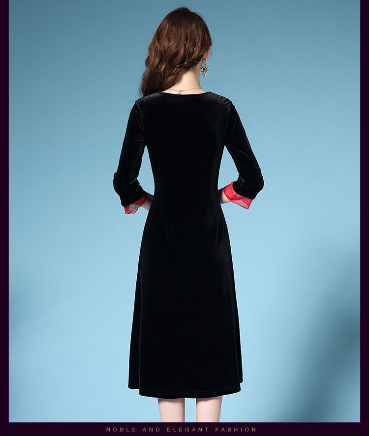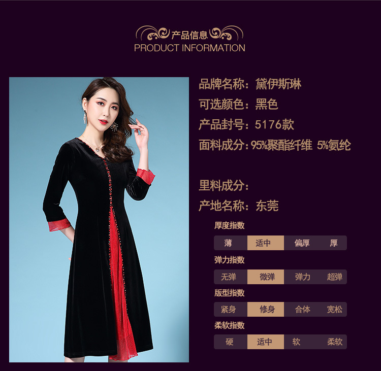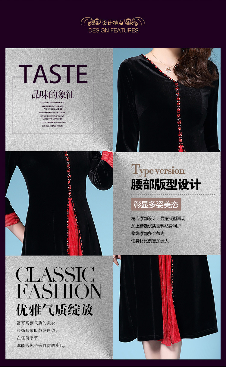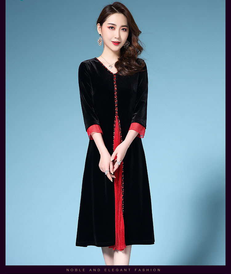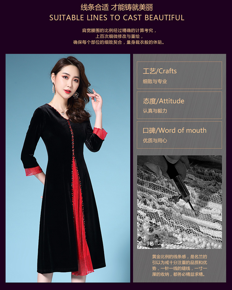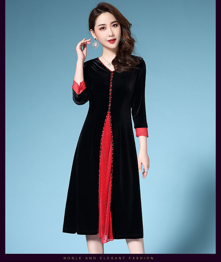 DYSL-Q5176新款气质拼色V领钉珠中长款大码连衣裙TZW