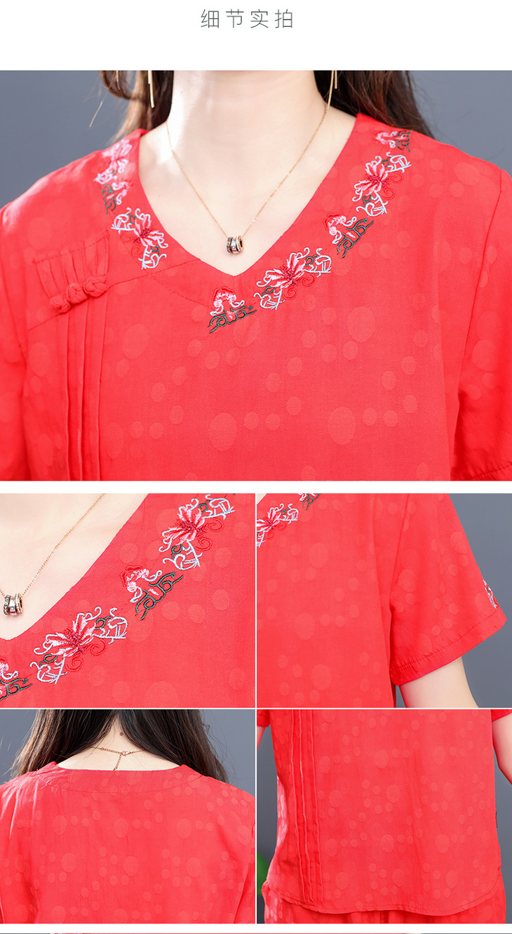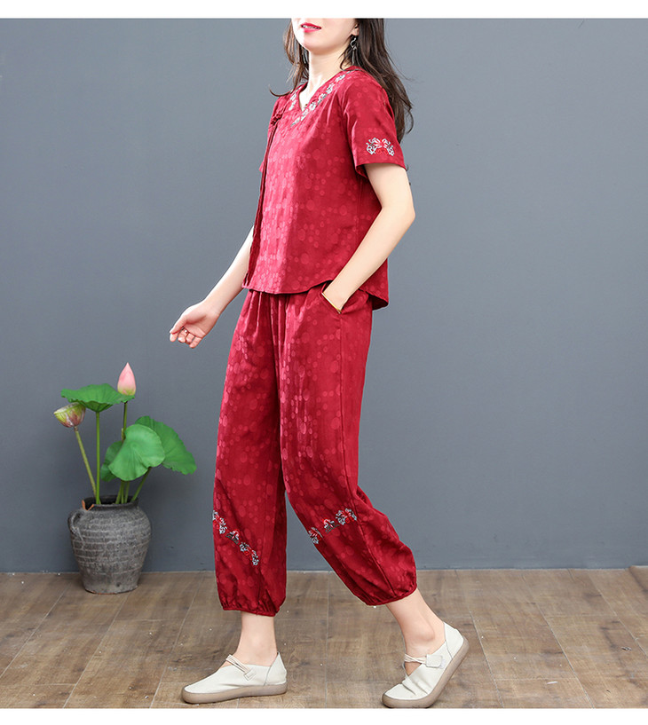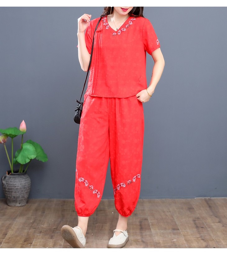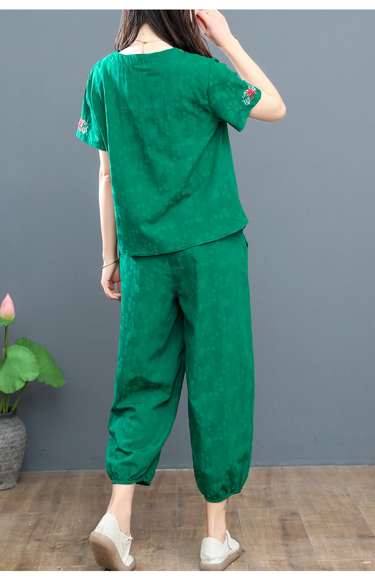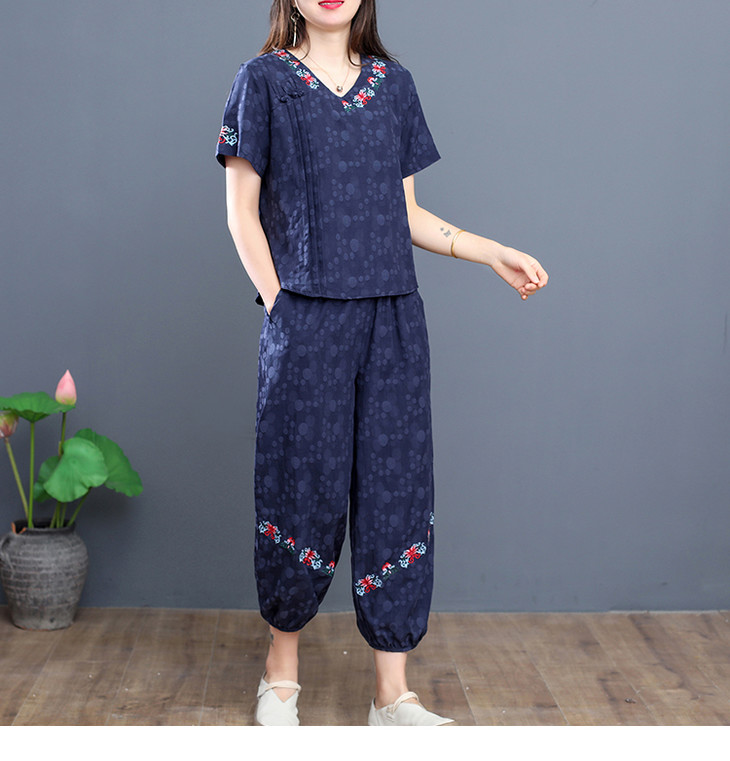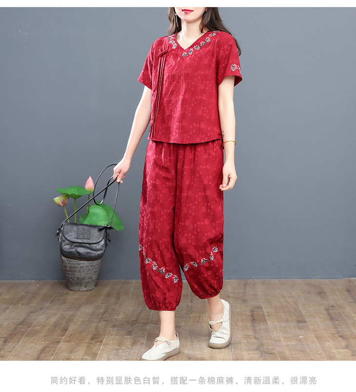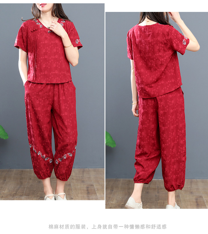 W-6885新品民族风复古棉麻刺绣休闲短袖上衣灯笼裤两件套