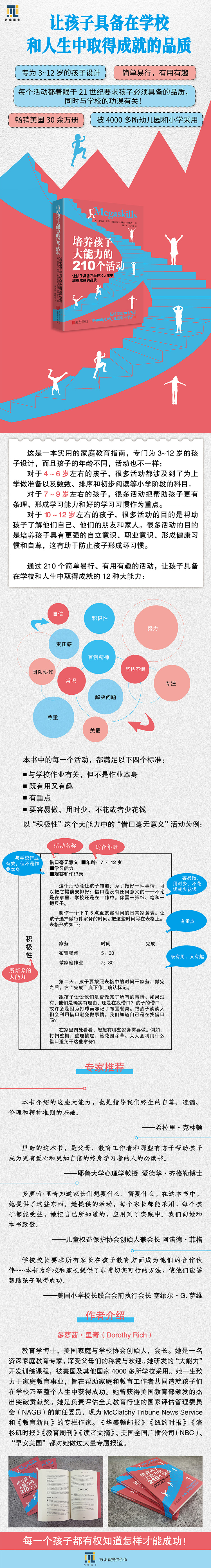 这是一本实用的家庭教育指南,专门为3~12岁的孩子设计,通过210个简单易行、有用有趣的活动,让孩子具备在学校和人生中取得成就的12种大能力:自信、积极性、努力、责任感、首创精神、坚持不懈、关爱、团队协作、常识、解决问题、专注、尊重。