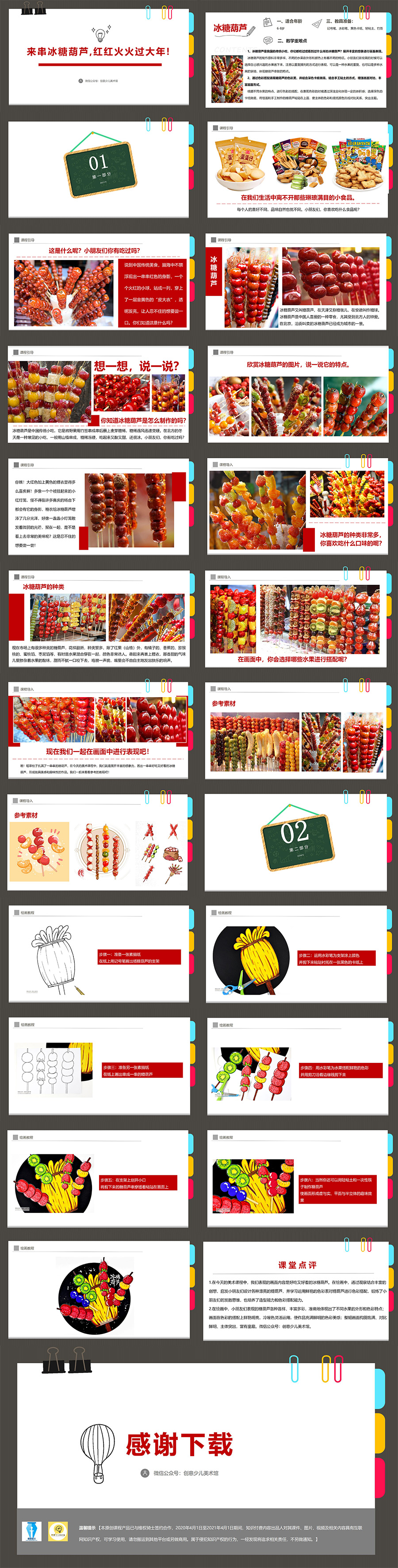 2、通过色彩搭配表现糖葫芦的色彩美,并结合深色卡纸做底、结合手工粘土的方式,增强画面对比、丰富画面形式。
