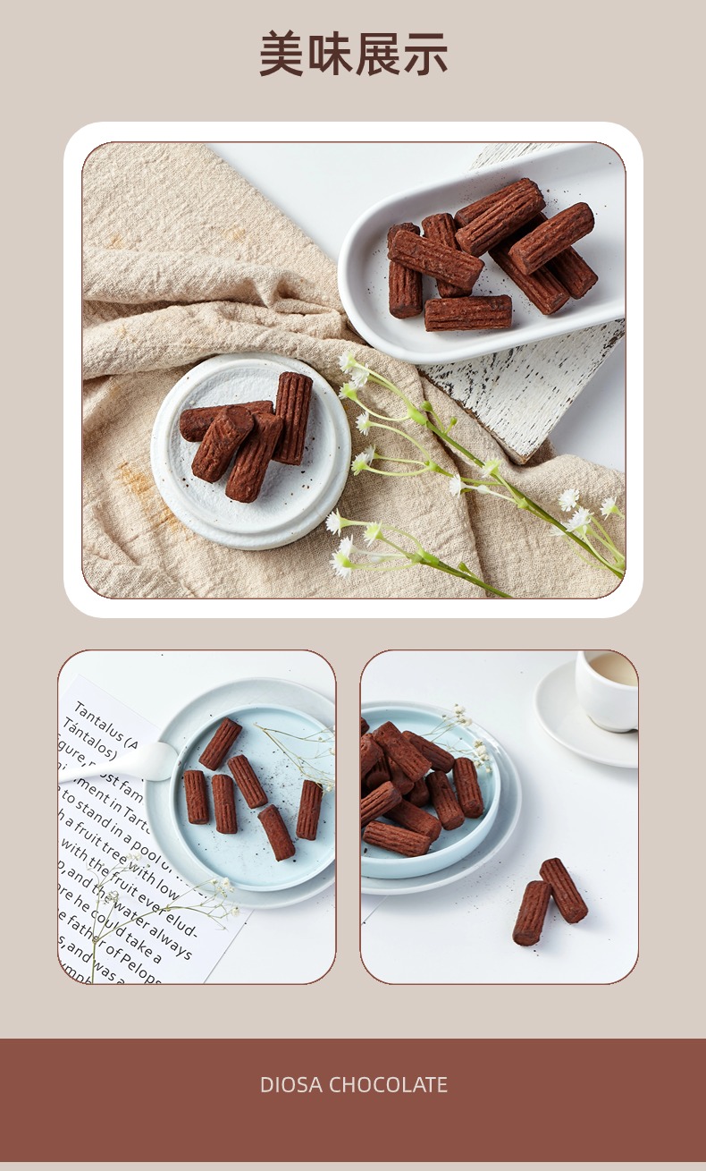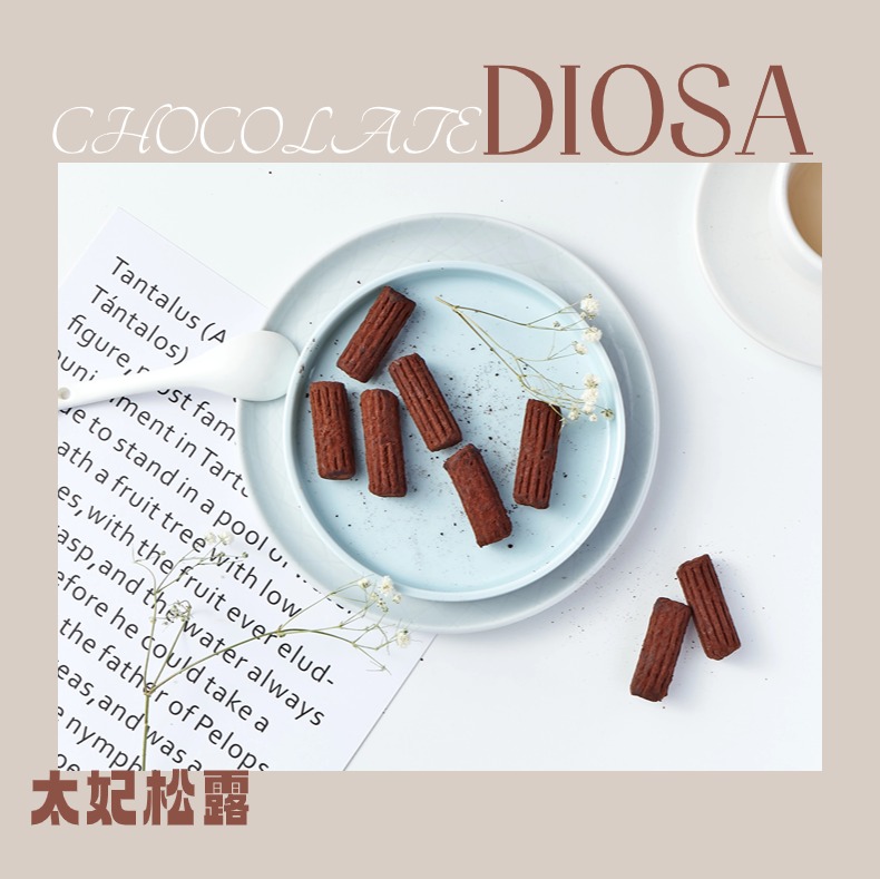 DIOSA(蒂奥莎)巧克力在西班牙语中是“女神”的意思。DIOSA品牌一直致力于纯脂手工巧克力的研发和推广,全部原料来自比利时,意大利,西班牙等欧洲传统巧克力王国,运用比利时传统工艺纯手工制作。