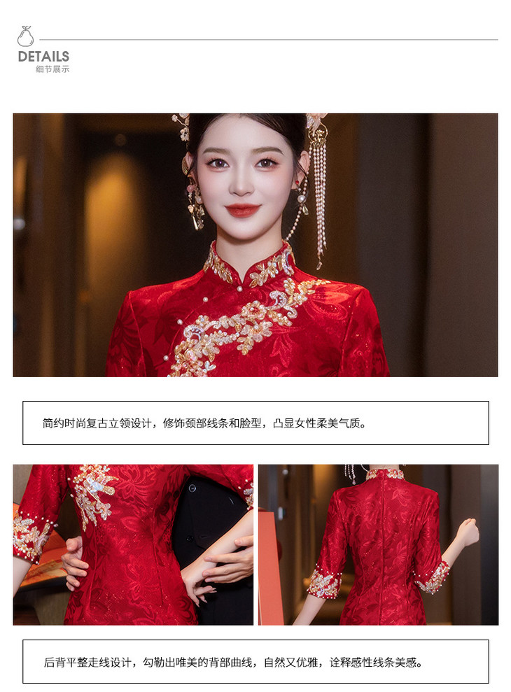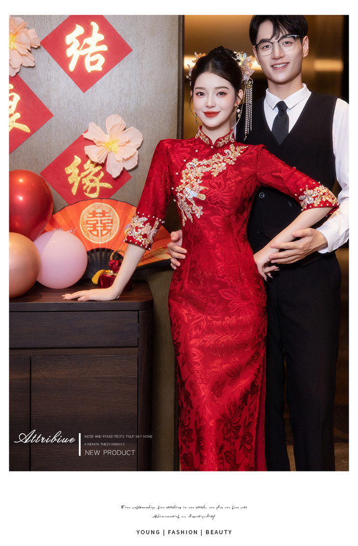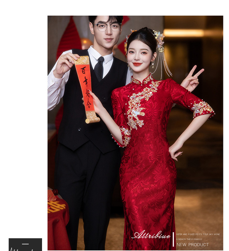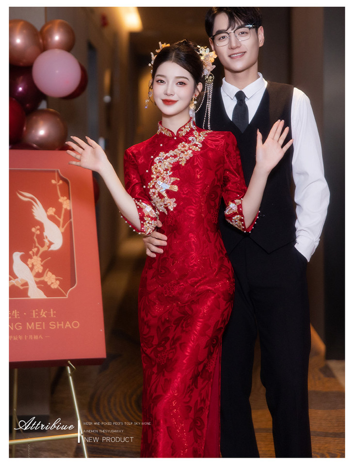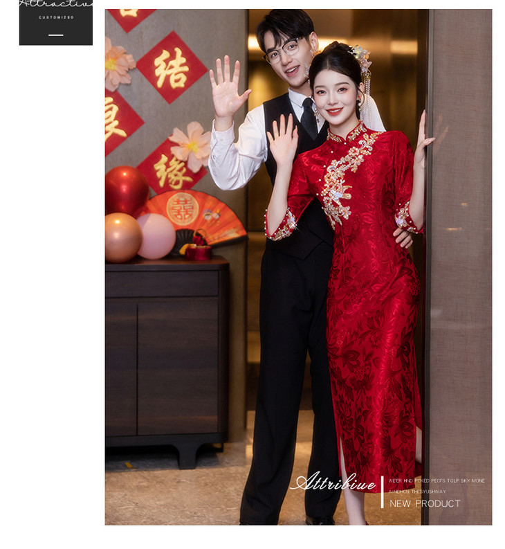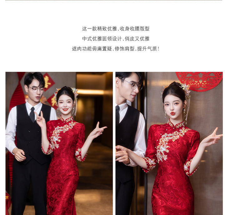 重工红色旗袍敬酒服,便装回门订婚中式礼服裙秋冬LSB