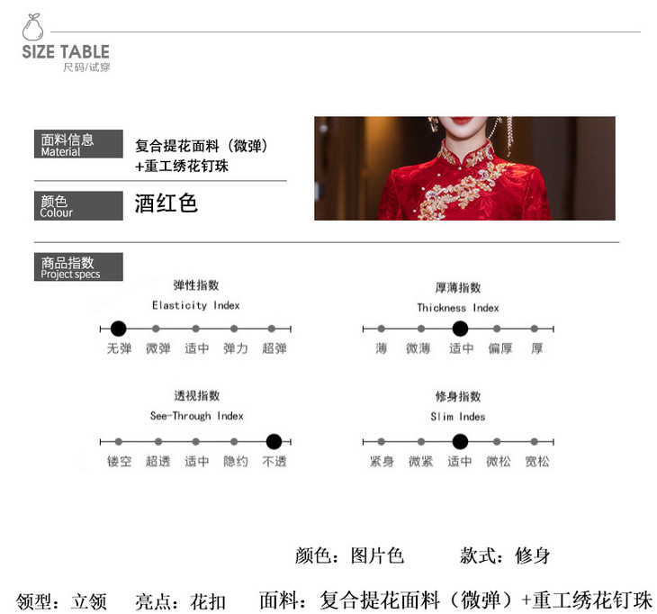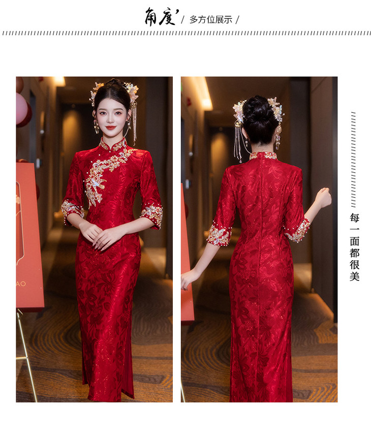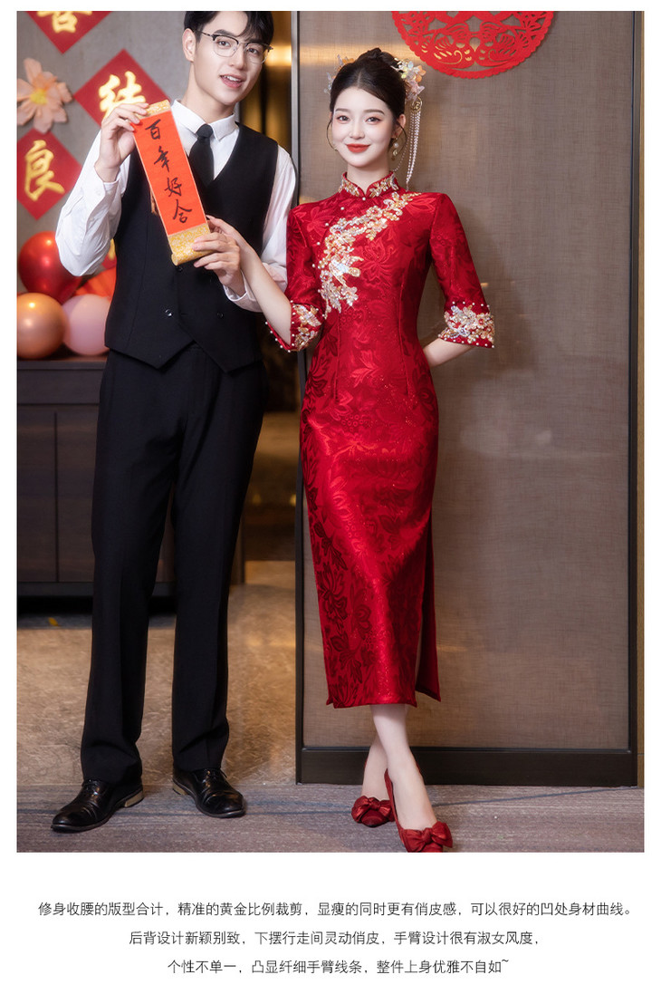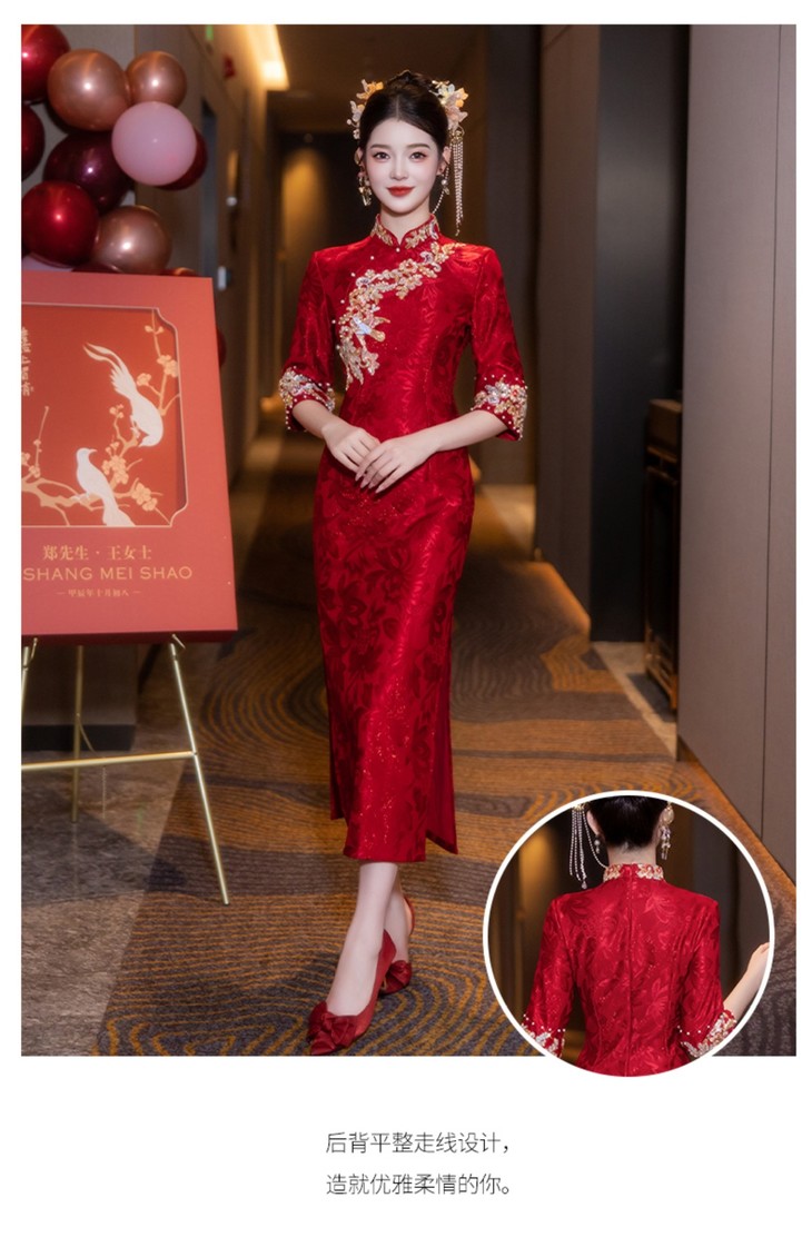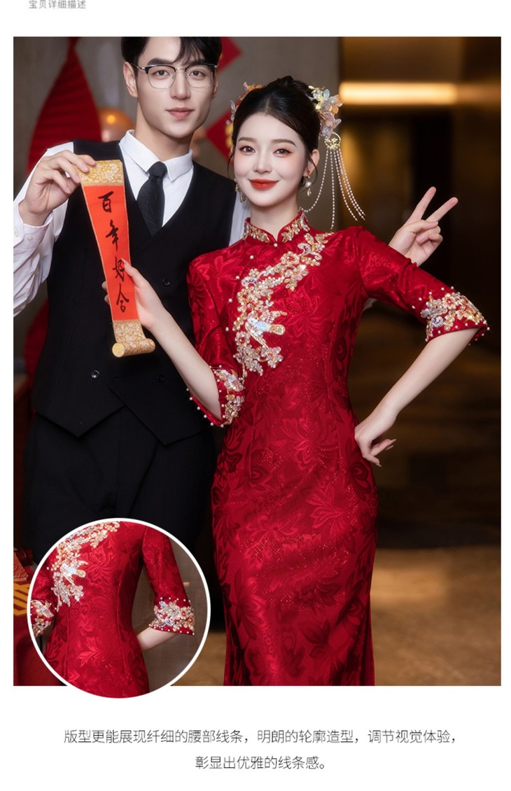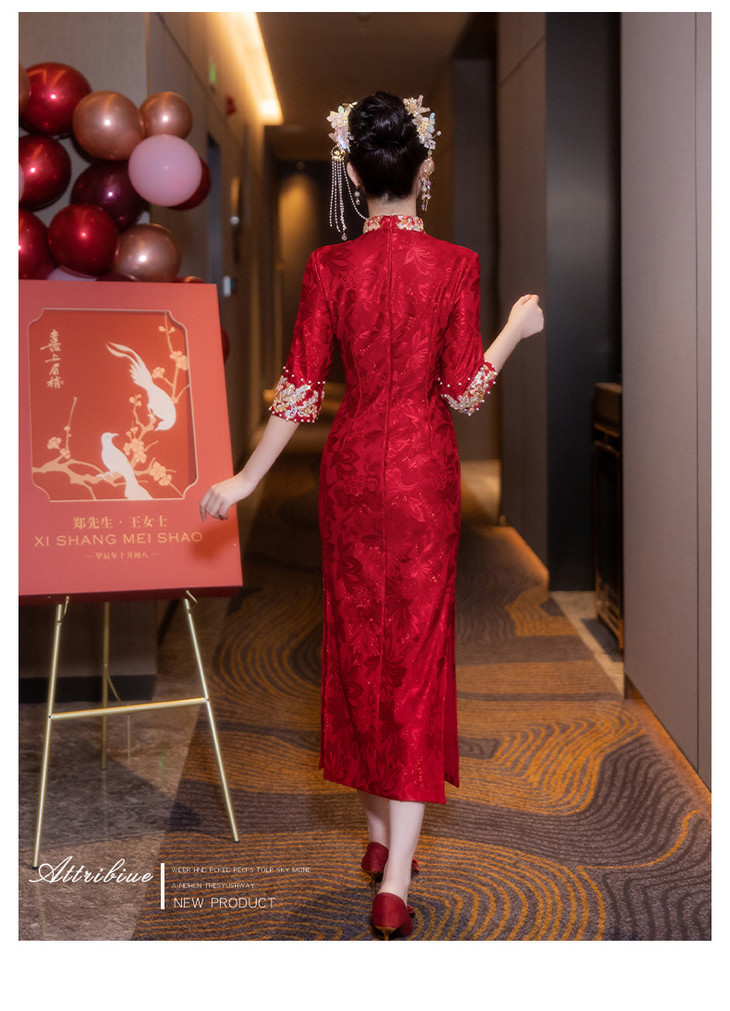 重工红色旗袍敬酒服,便装回门订婚中式礼服裙秋冬LSB