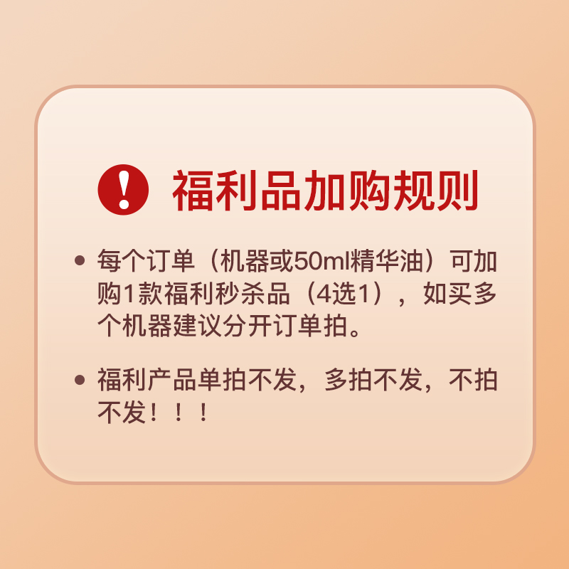 福利品加购规则:每个订单(机器或正价精油)可加购1款福利秒杀品(4选1,手串除外),如买多个机器建议分开订单拍。福利产品单拍不发,多拍不发,不拍不发!!!