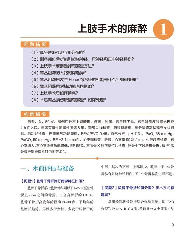 第一部分“经典病例”共14章,每个章节围绕一个骨科经典病例提出相关问题,以问答的形式引导读者思考、释疑,既有常见的临床知识点,又有各种疑点、难点和盲点,总计177个问题,包含术前准备与评估、术中管理、术后管理,涉及麻醉知识、骨科手术、并发症诊断与处理等多个层面,所有问题的解答都结合了我们的临床经验和最新的循证依据。