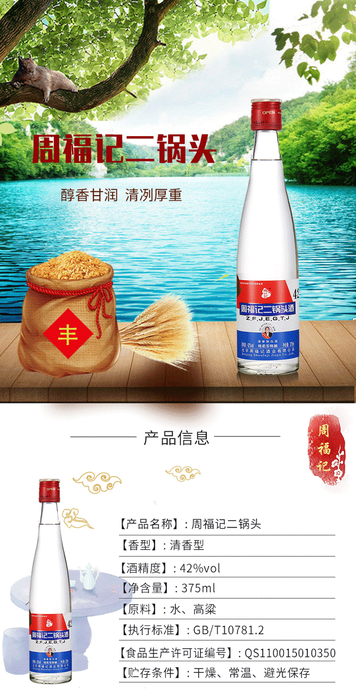 【推荐】周福记北京二锅头 绵柔八年陈酿二锅头 清香型白酒 375ml* 12瓶42度整箱