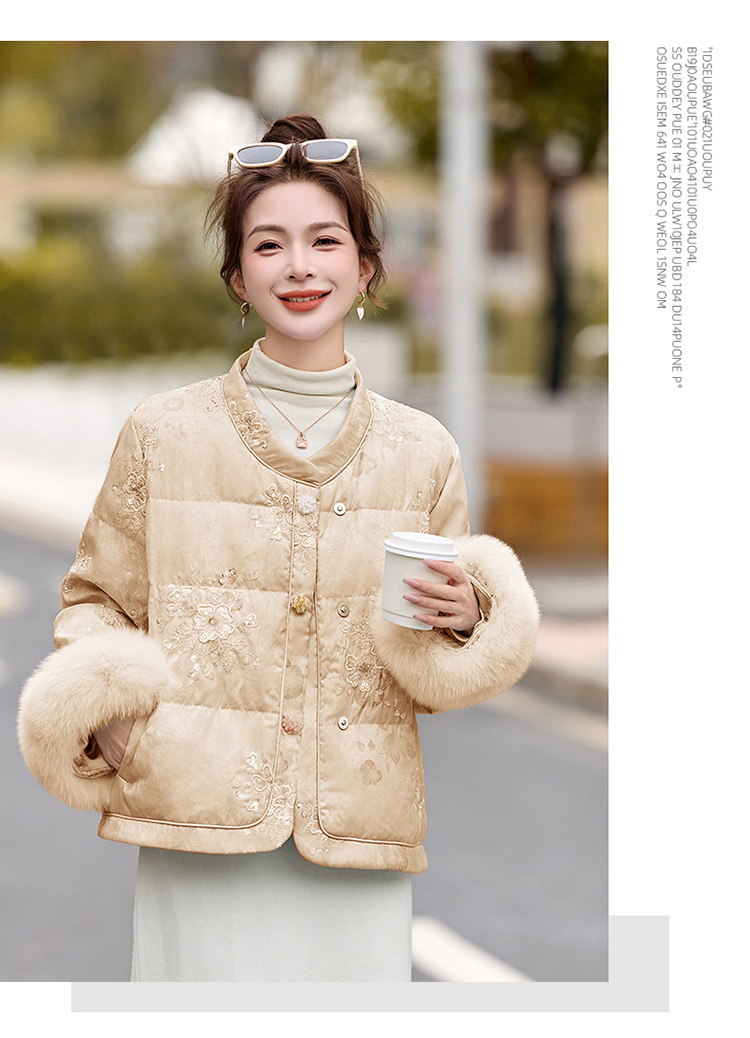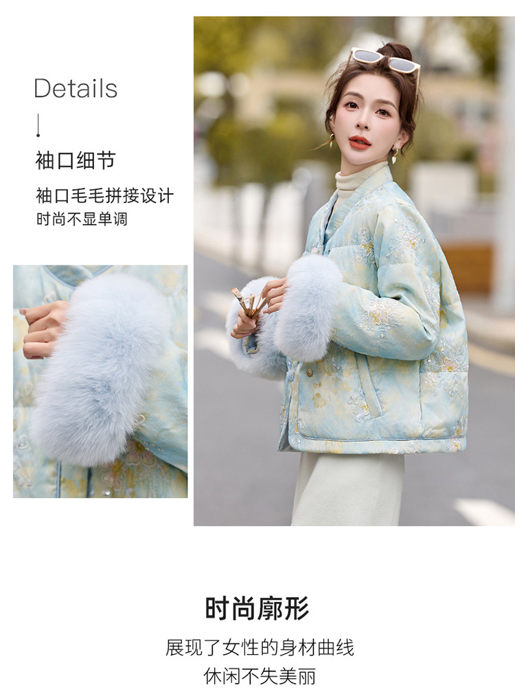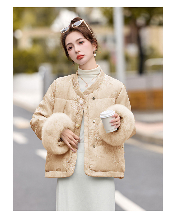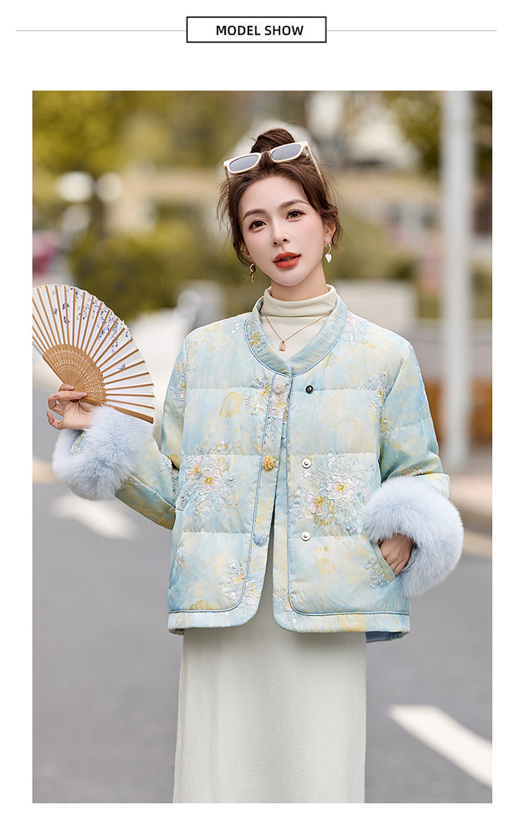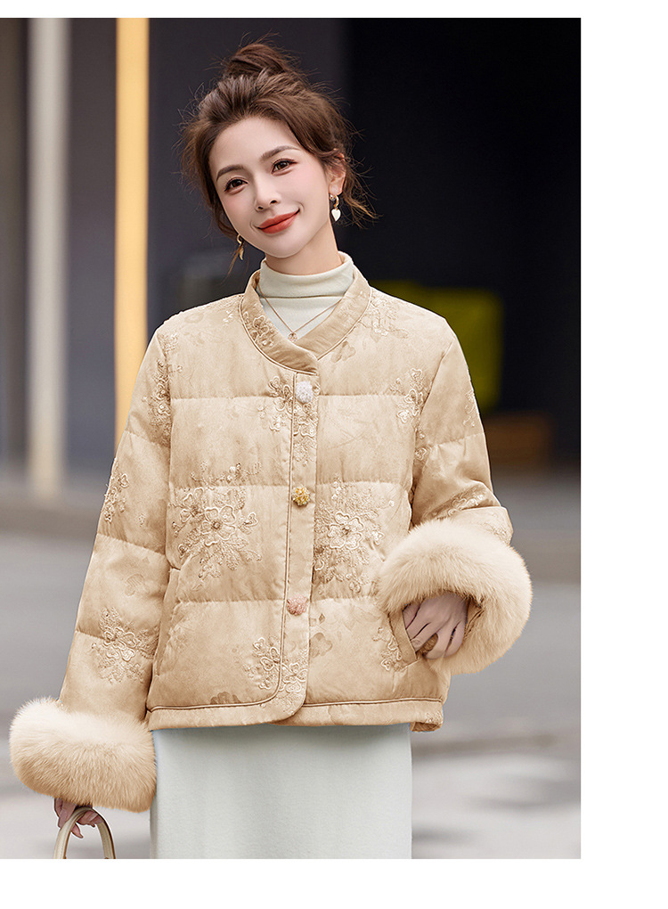 HR YQH99939真狐狸毛重工刺绣短款新中式羽绒服配袖毛 商品图4
