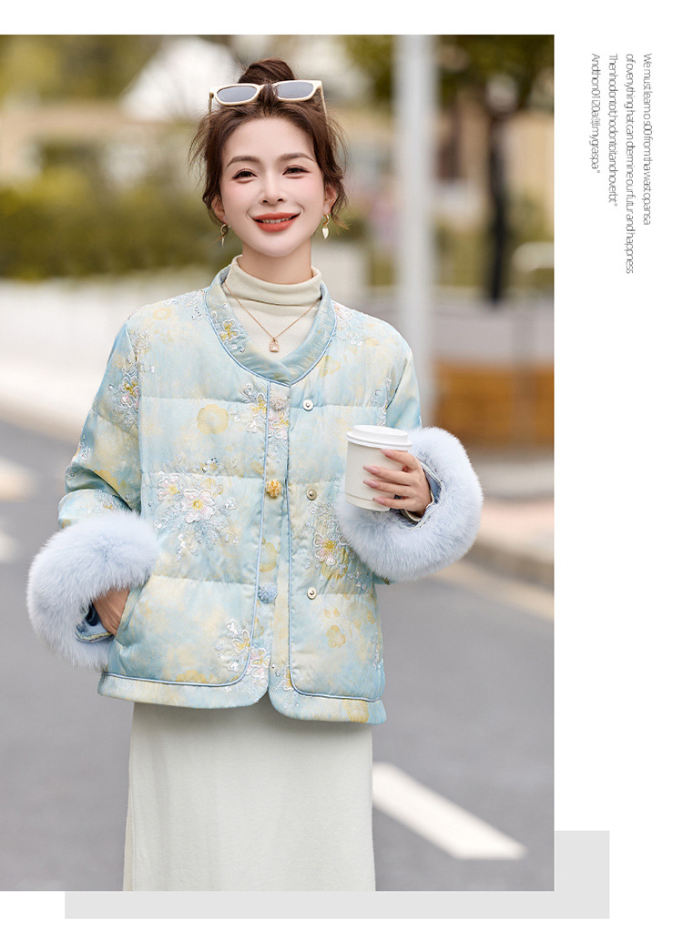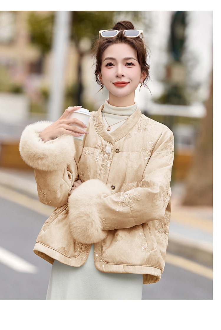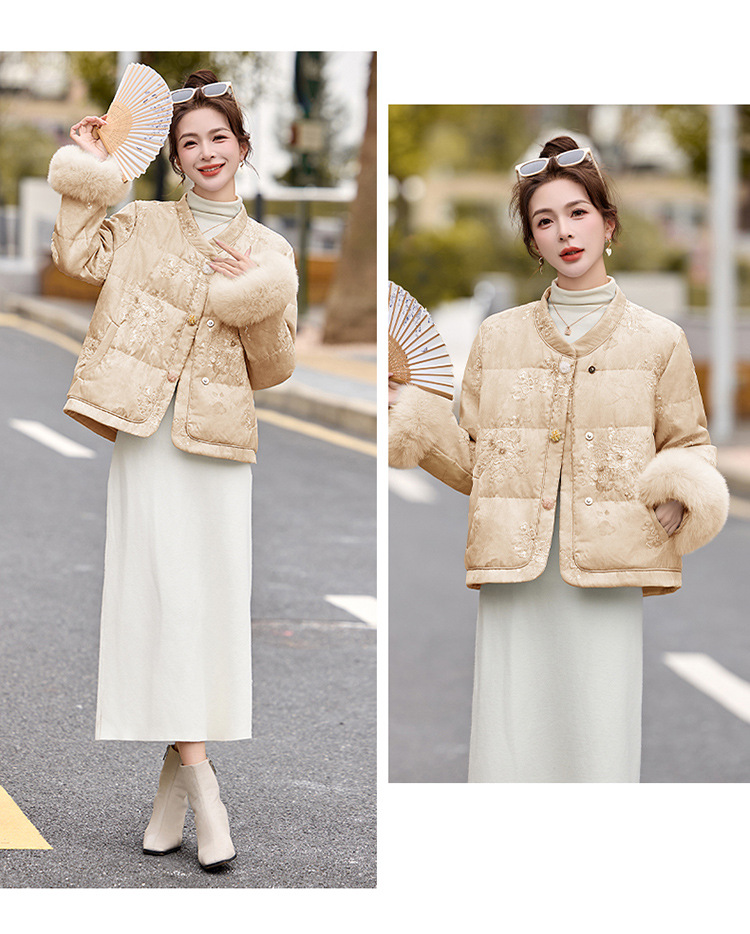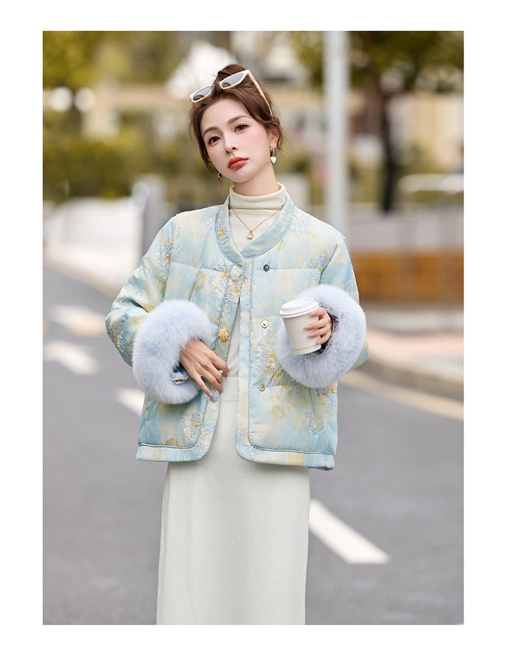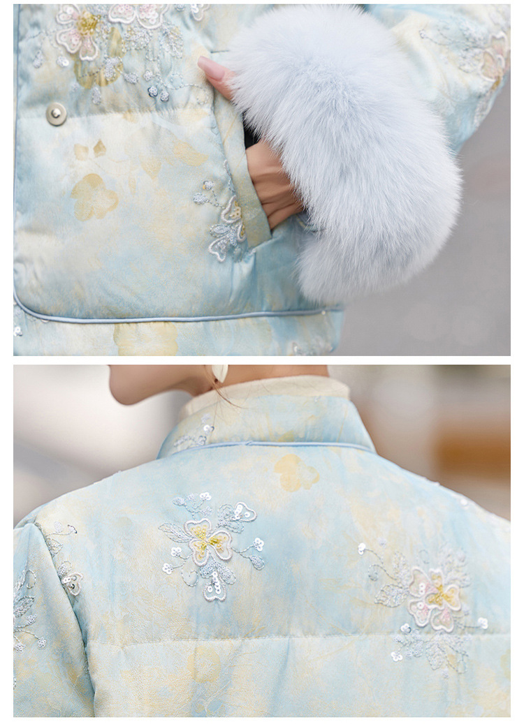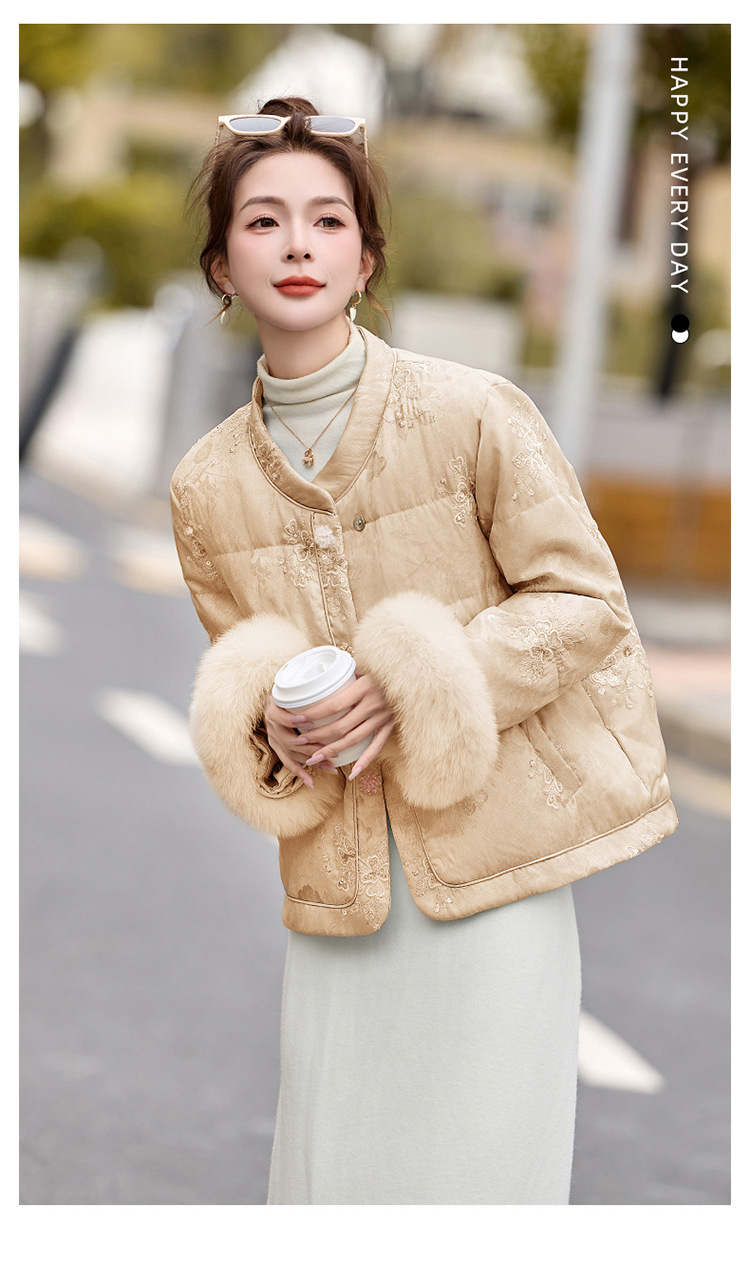 HR YQH99939真狐狸毛重工刺绣短款新中式羽绒服配袖毛 商品图4