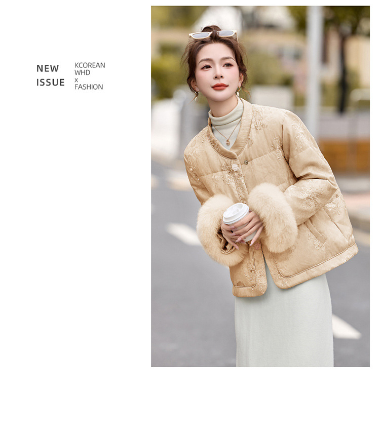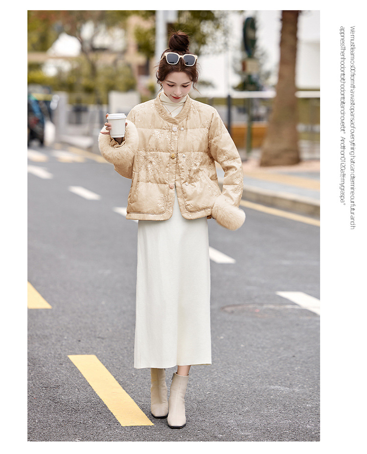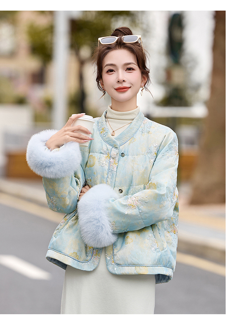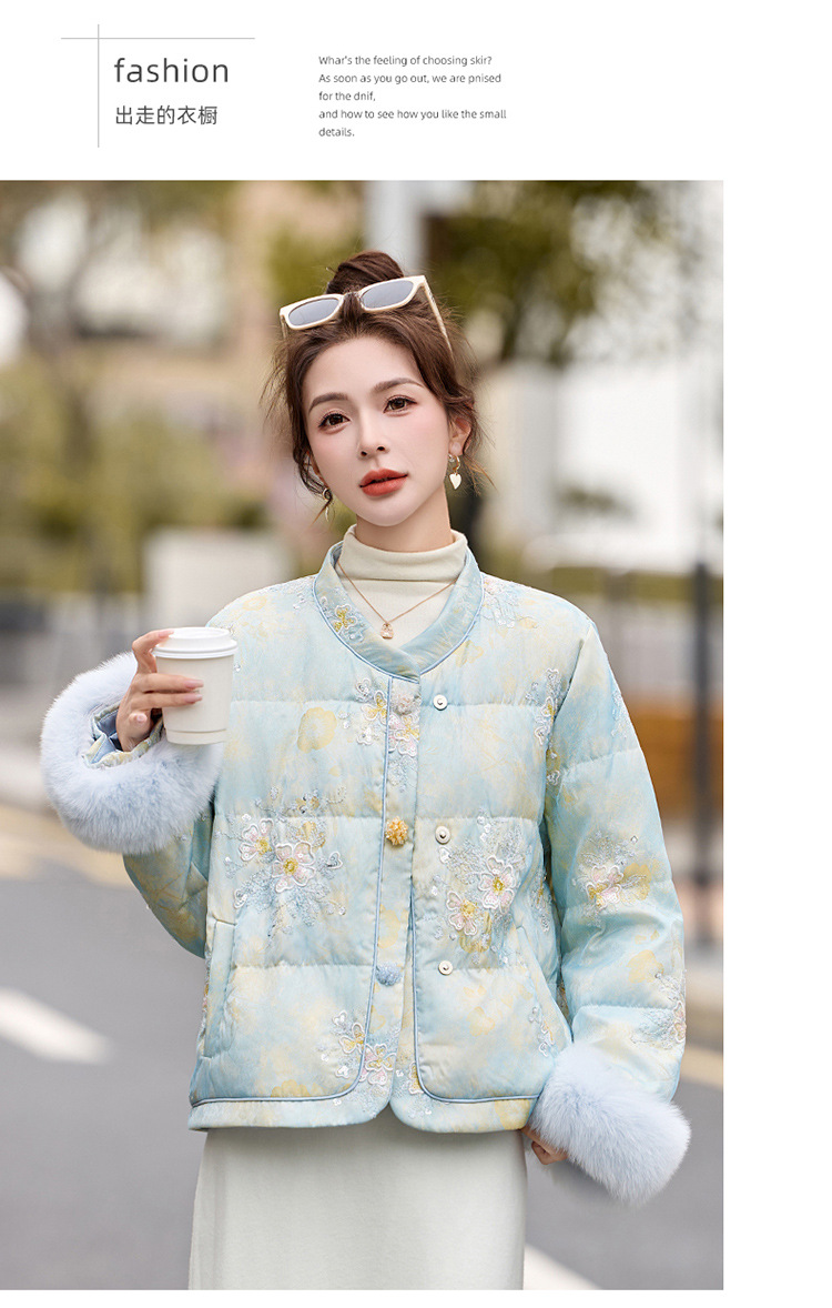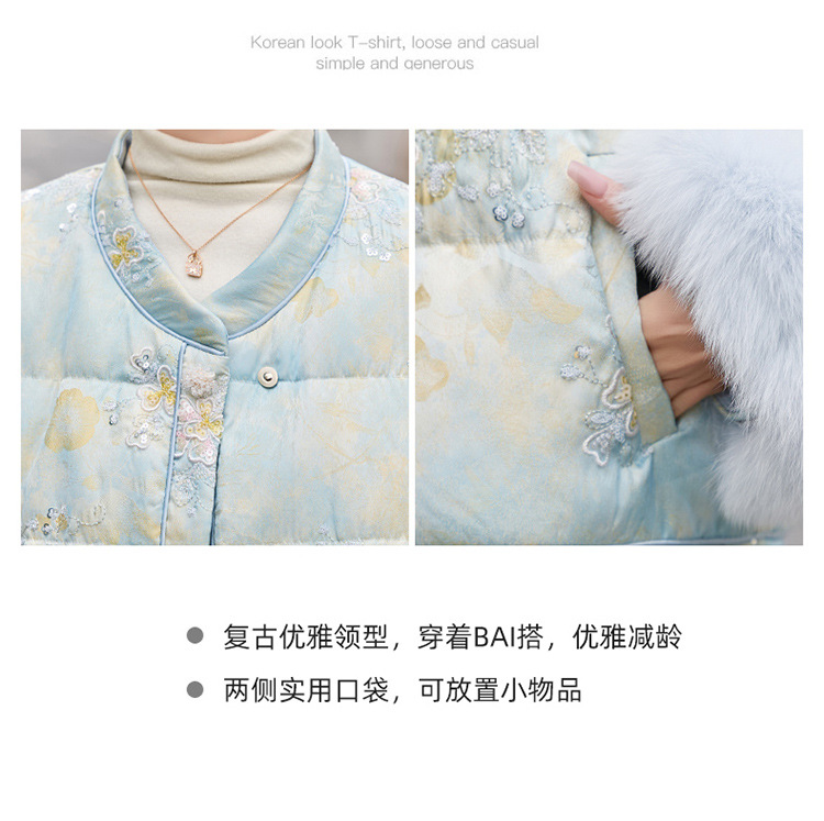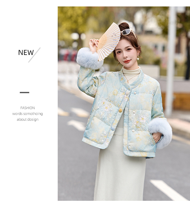 HR YQH99939真狐狸毛重工刺绣短款新中式羽绒服配袖毛 商品图4
