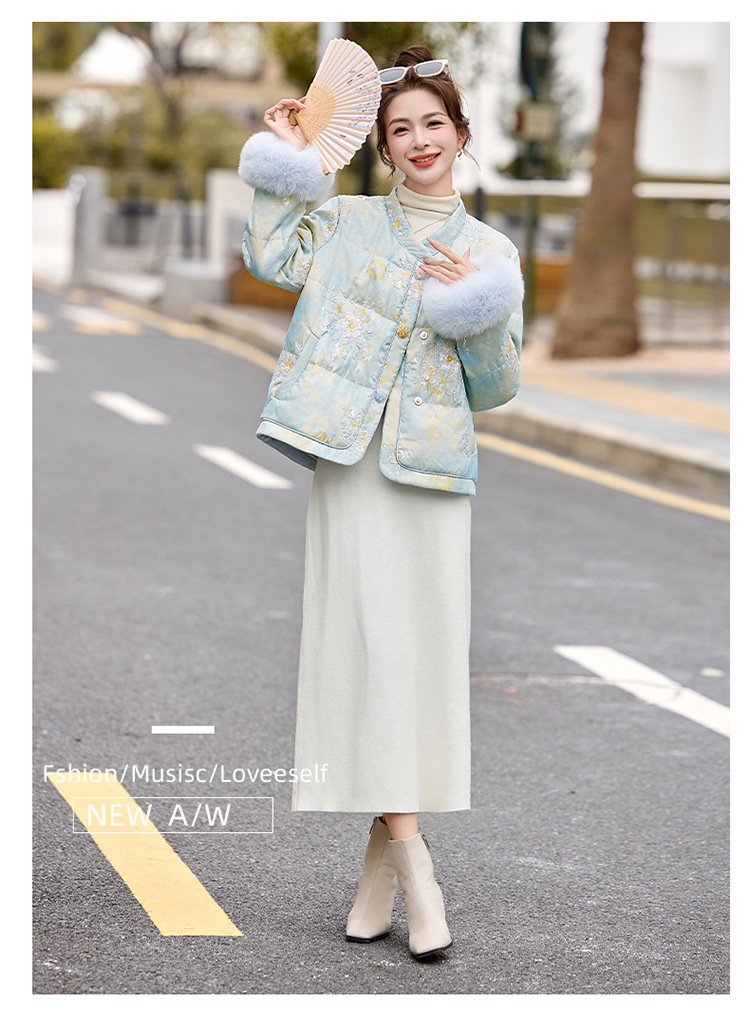 HR YQH99939真狐狸毛重工刺绣短款新中式羽绒服配袖毛