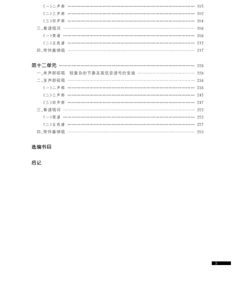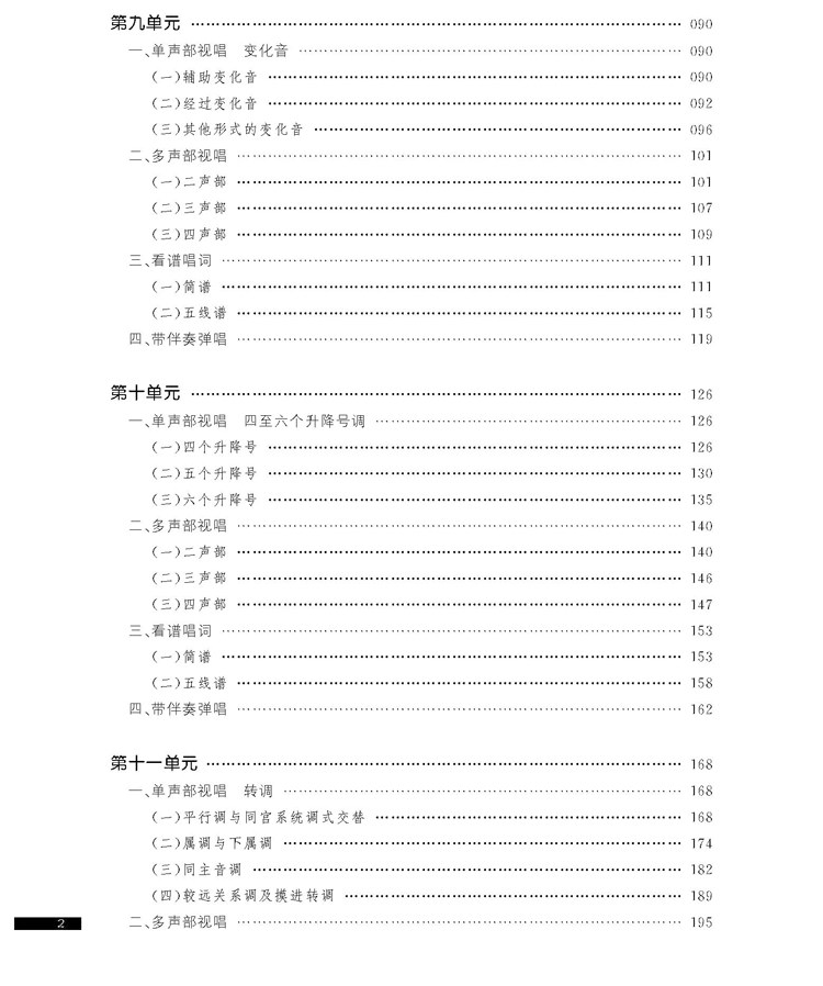 该书下册共六个单元,从三个升降号到变化音、转调及较复杂的节奏等,在每一单元都编排了四个方面的内容,以多种形式系统、全面地训练学生的视唱能力。每个单元包括1.单声部视唱、2.多声部视唱、3.看谱唱词、4.带伴奏弹唱,内容全面,由浅入深,更利于学生理解学习。特别是看谱唱词和带伴奏弹唱两部分,对培养学生视唱能力和即兴视唱音准有很大帮助。