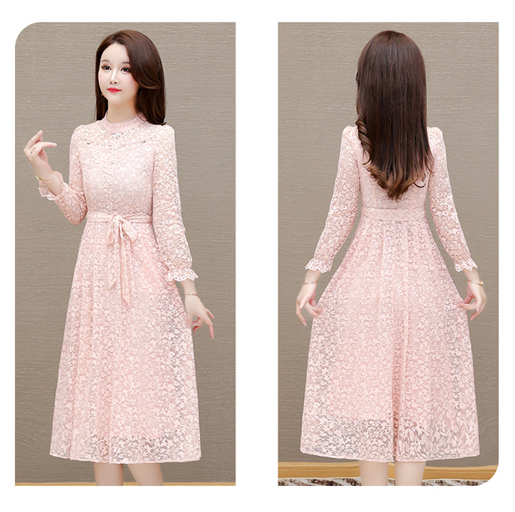 QYM 25A88816-Y浅色蕾丝连衣裙腰带收腰长袖裙